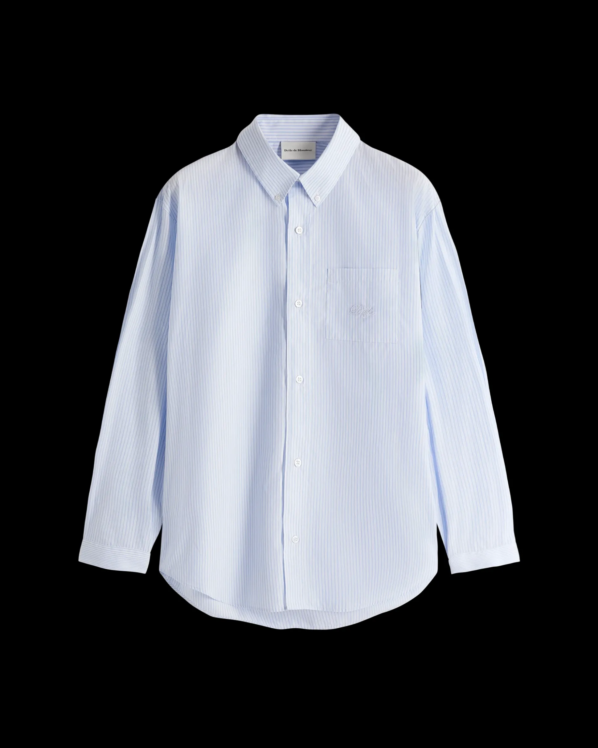 This light blue 100% cotton striped shirt has long sleeves with wrist buttons, a patch pocket on the chest with a ‘Drôle’ embroidery and six engraved buttons on the front.