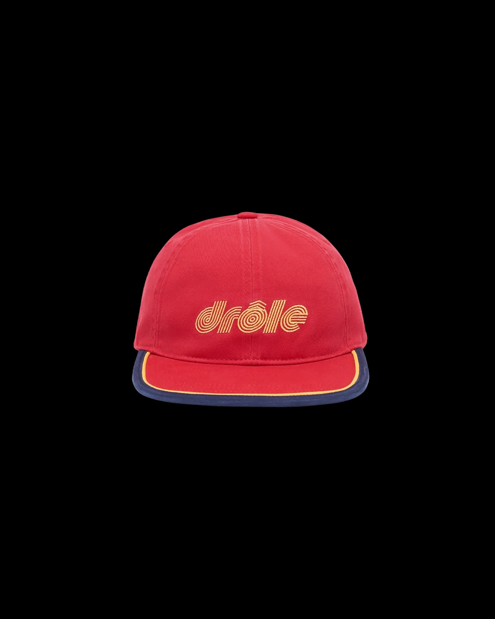 This red 100% cotton 6-panel baseball hat has a flat visor with a contrasted trim, an adjustable strap and an engraved ‘Drôle’ metal buckle. It features the Drôle Tennis embroidery on the front.• 6 panels• Drôle Tennis embroidery on the front• Flat visor with a contrasted trim• Adjustable strap• Engraved ‘Drôle’ metal buckle• 100% cottonColor: Red