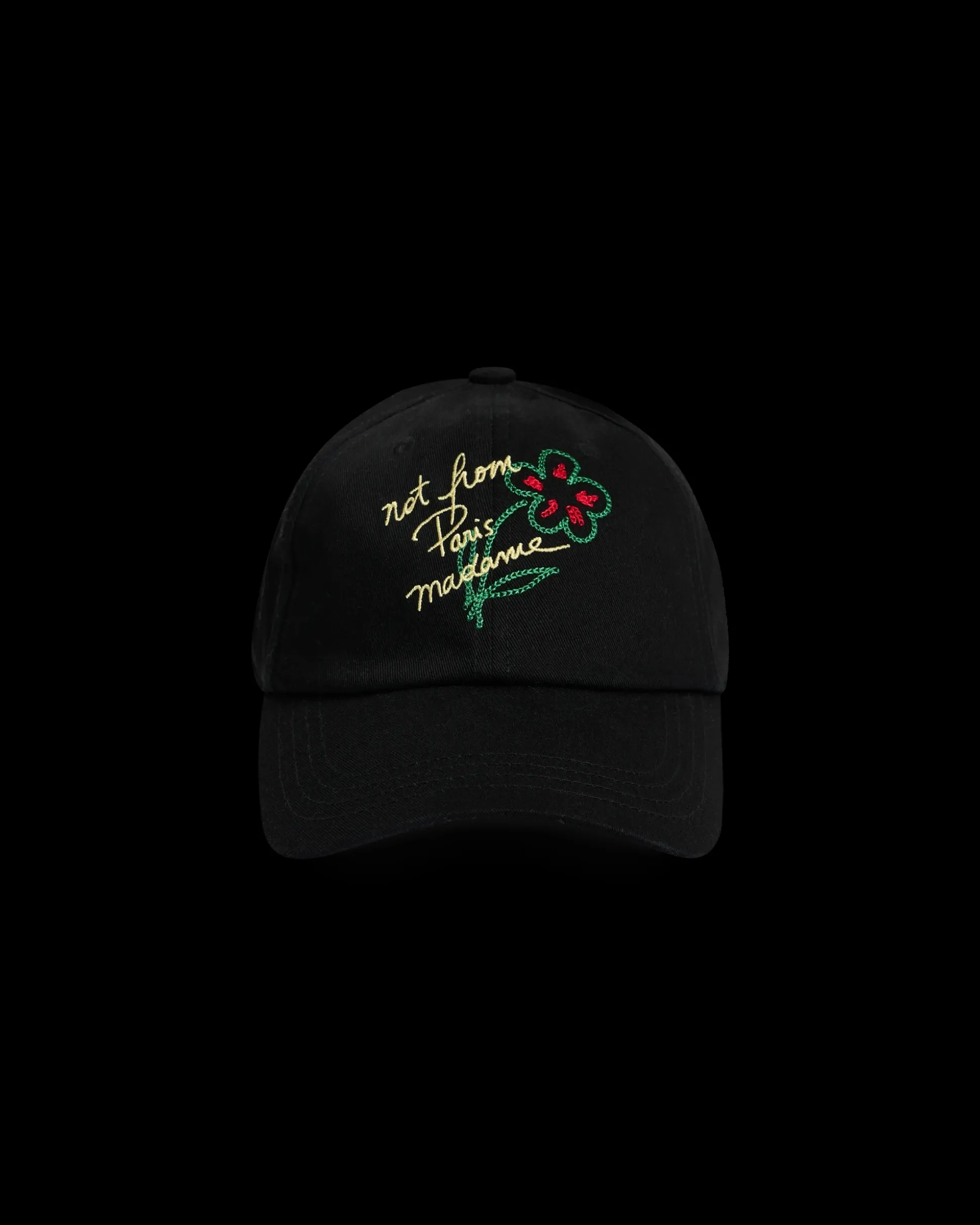 Handwritten message. This black 6-panel 100% cotton baseball hat with a metal buckle is embroidered with the ‘Not From Paris Madame’ slogan on the front.