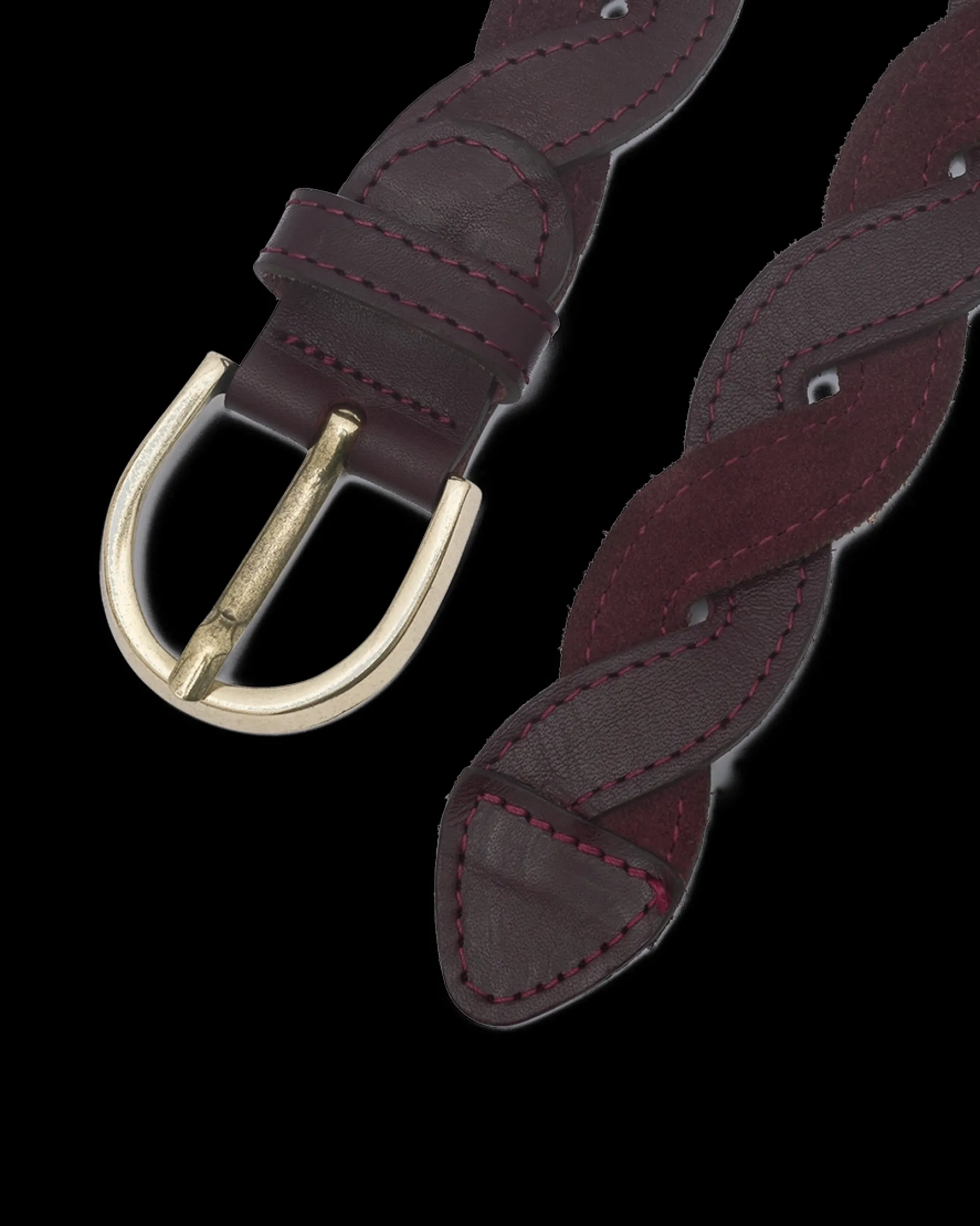 This burgundy 100% leather braided belt has one belt loop with a golden buckle. It measures 3cm wide. • Braided belt• 1 belt loop• Golden buckle• Width 3cm• 100% leatherColor: BurgundyMade in France