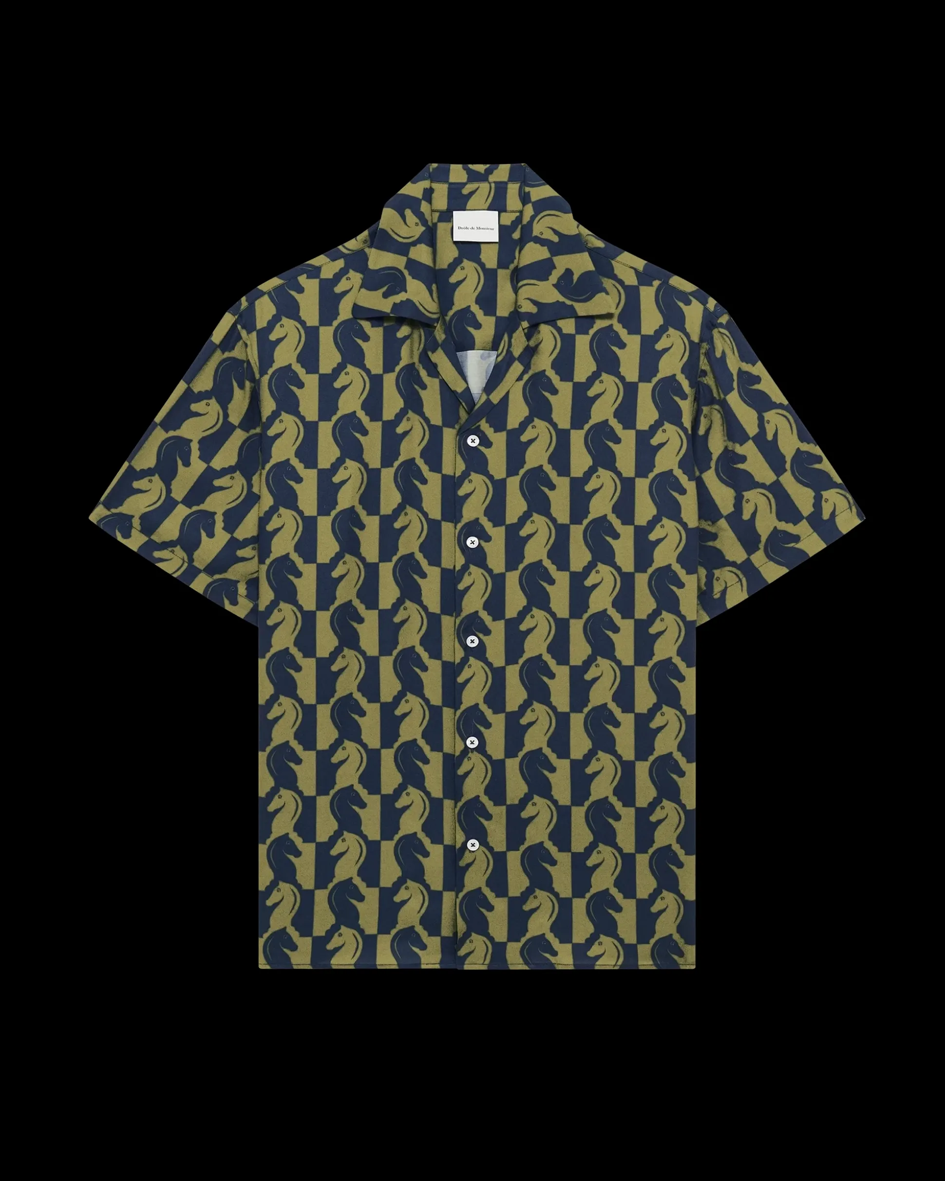 This khaki short-sleeved viscose shirt is printed with the Echiquier pattern. It has an open collar, a loose fit and five engraved front buttons.• Printed viscose• Echiquier pattern• Short sleeves• Open collar• Loose fit• 5 engraved front buttonsColor: KhakiMade in Portugal