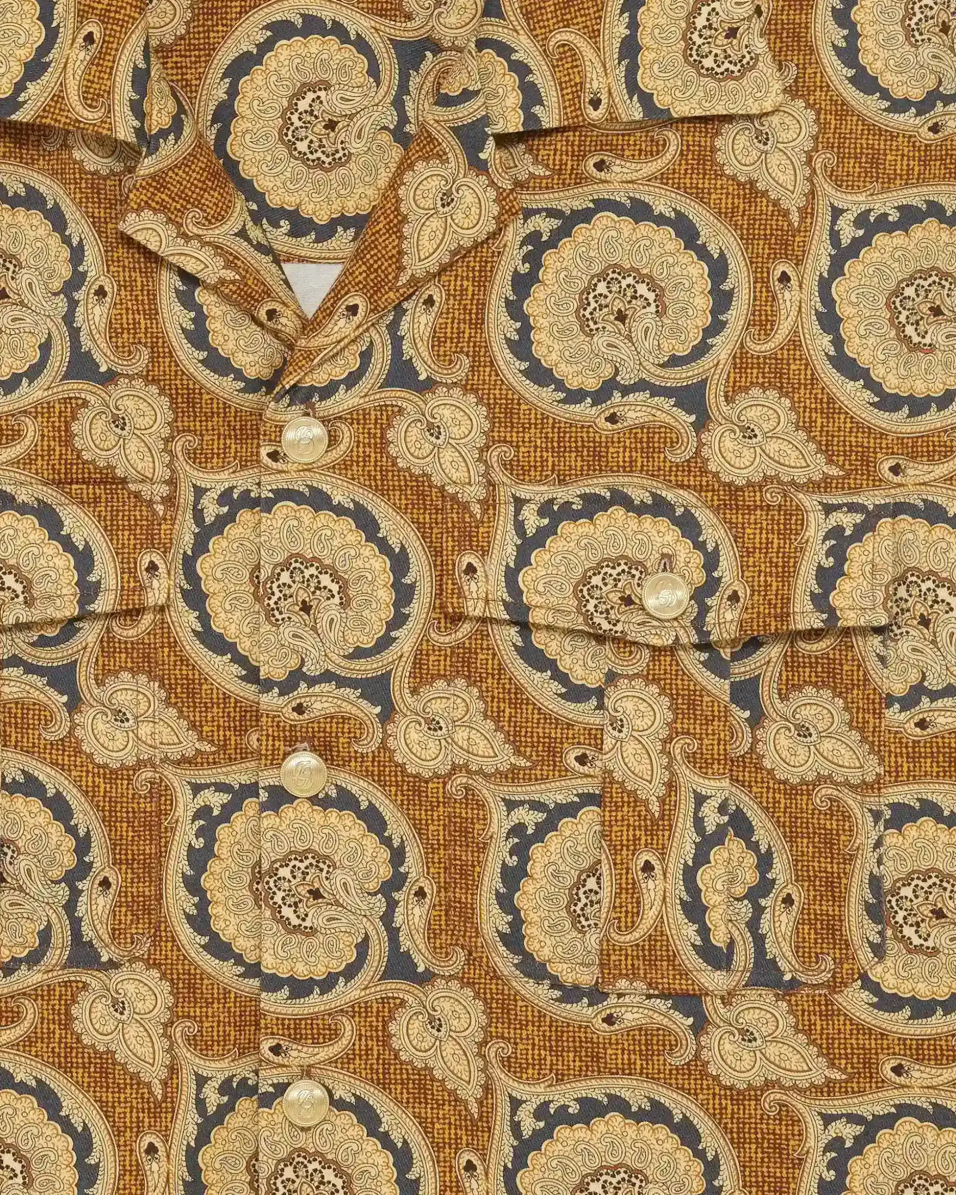 This mustard short-sleeved 100% cotton gabardine shirt is printed with the Paisley pattern. It has an open collar, a loose fit, two patch pockets with flaps and snap buttons, and five engraved snap buttons.• Short-sleeved shirt• Printed Paisley cotton gabardine • Open collar• Loose fit• 2 patch pockets with flaps and snap buttons • 5 engraved snap buttons• 100% cottonColor: MustardMade in Europe