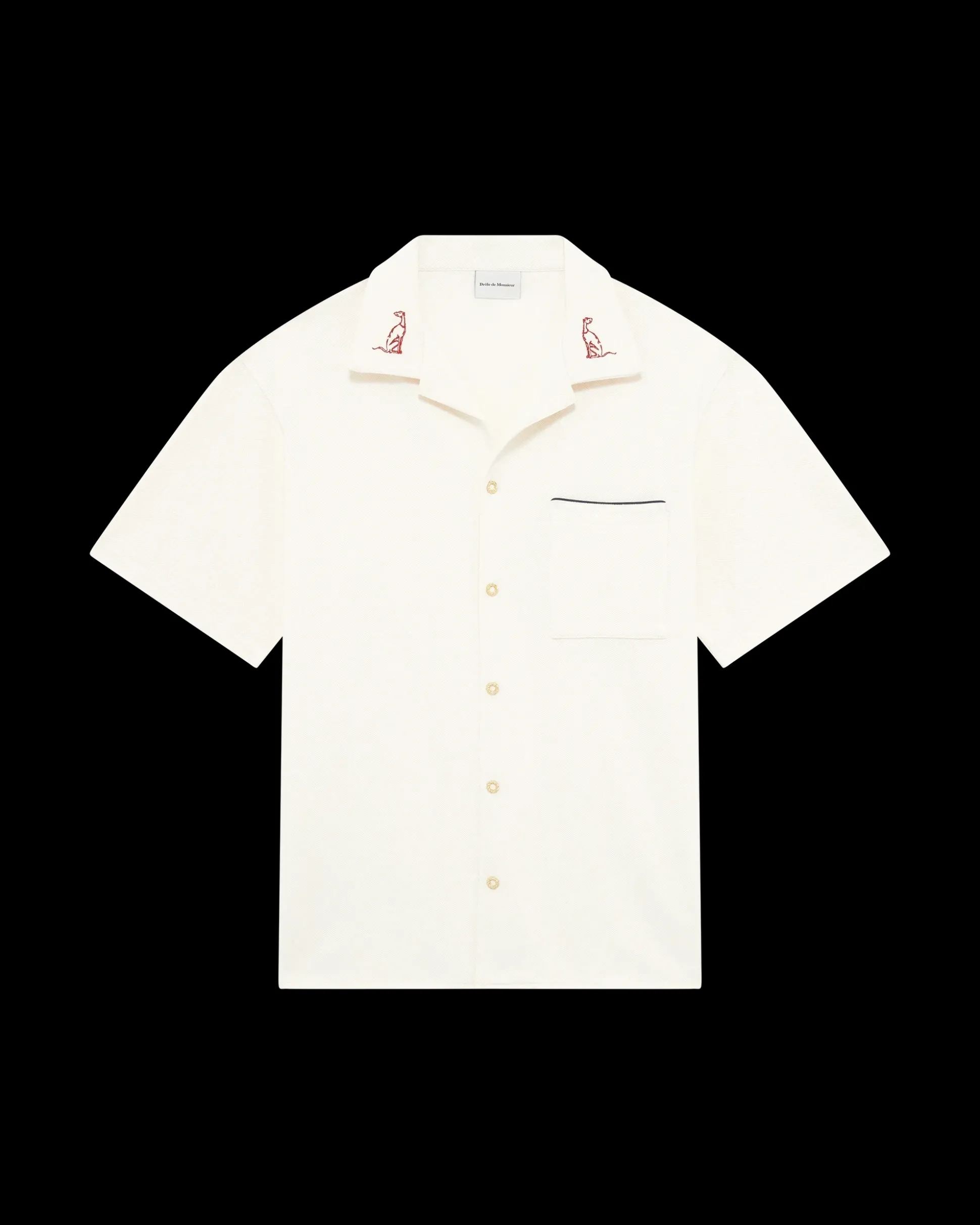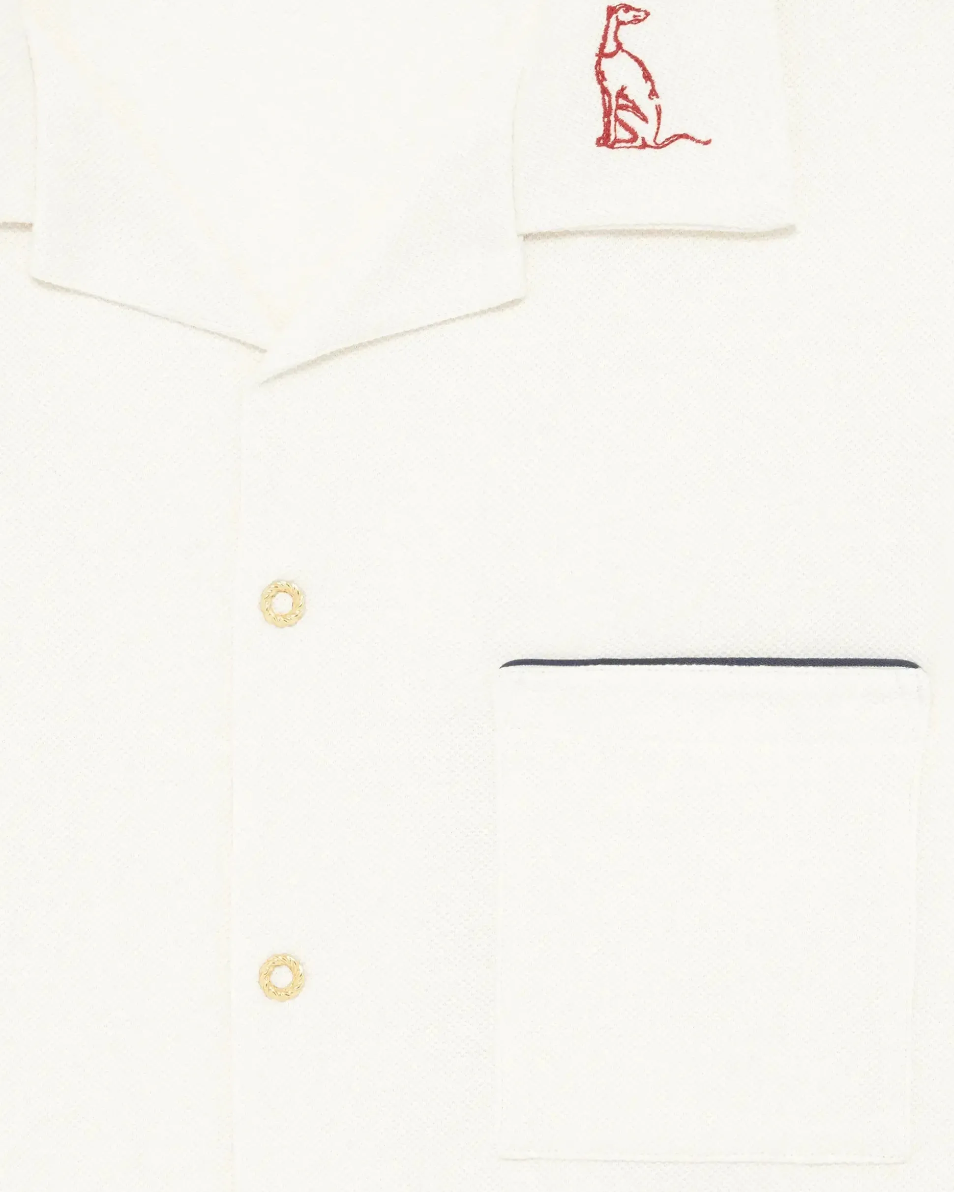 This off-white short-sleeved shirt is made from 100% cotton piqué. It has an open collar with a greyhound embroidery, a loose fit, a patch pocket on the chest and five braided snap buttons on the front.• Short-sleeved shirt• Open collar with greyhound embroidery• Loose fit• 1 chest patch pocket• 5 braided snap buttons on the front• 100% cotton piquéColor: Off whiteMade in Portugal