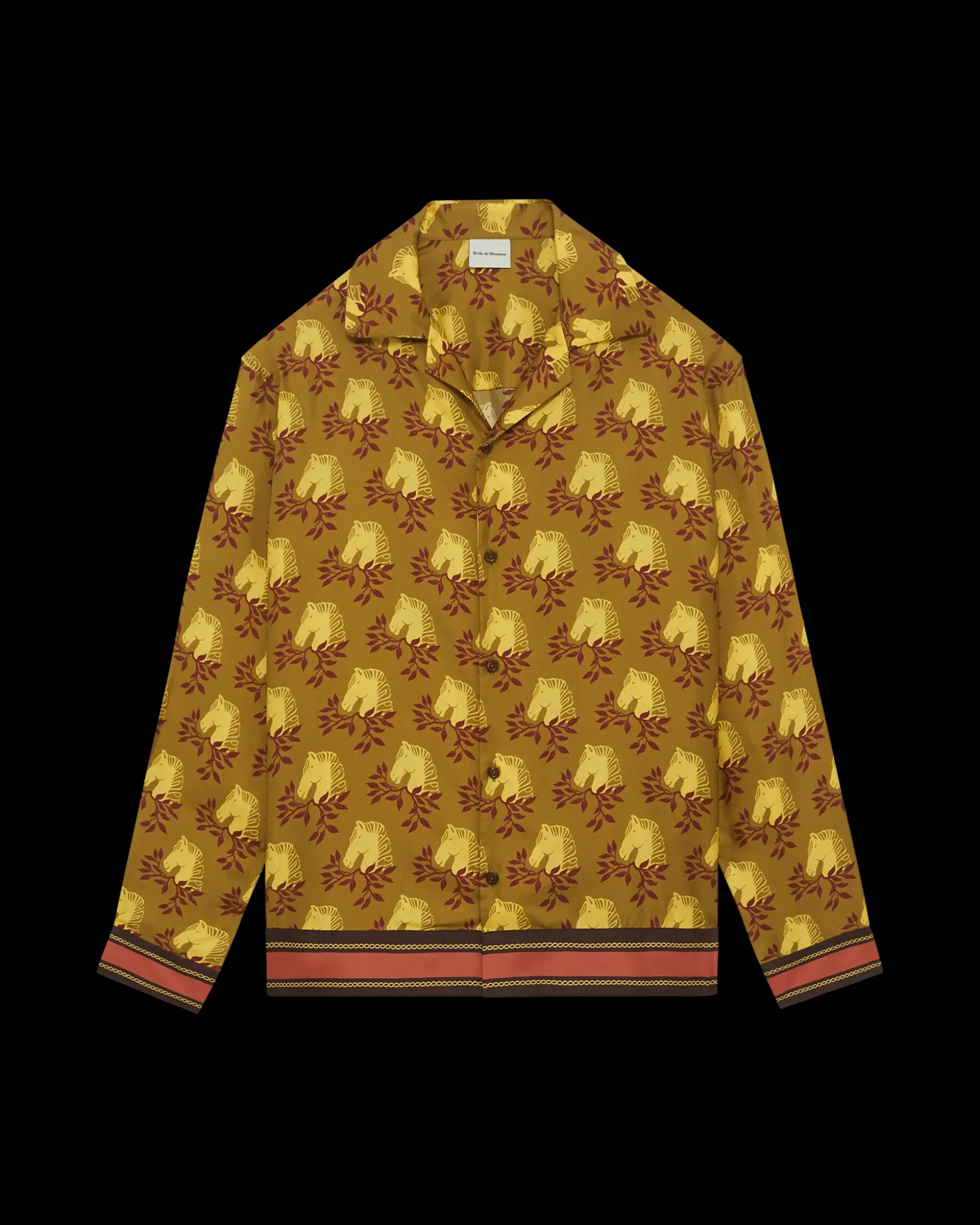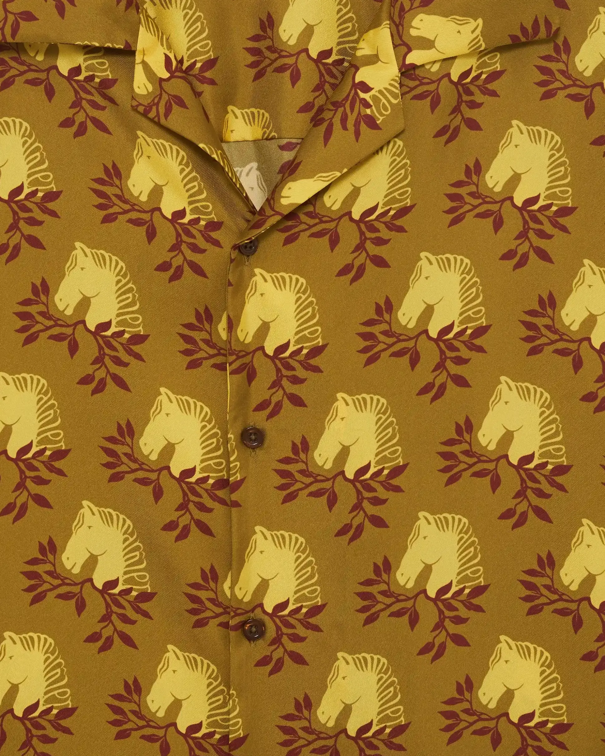 This mustard long-sleeved 100% silk shirt is printed with the Polo pattern. It has an open collar, a loose fit, contrasted wrists and hem and five engraved front buttons.• Long-sleeved shirt• Polo pattern• Open collar • Loose fit • Contrasted wrists and hem • 5 engraved front buttons• 100% silkColor: MustardMade in Portugal