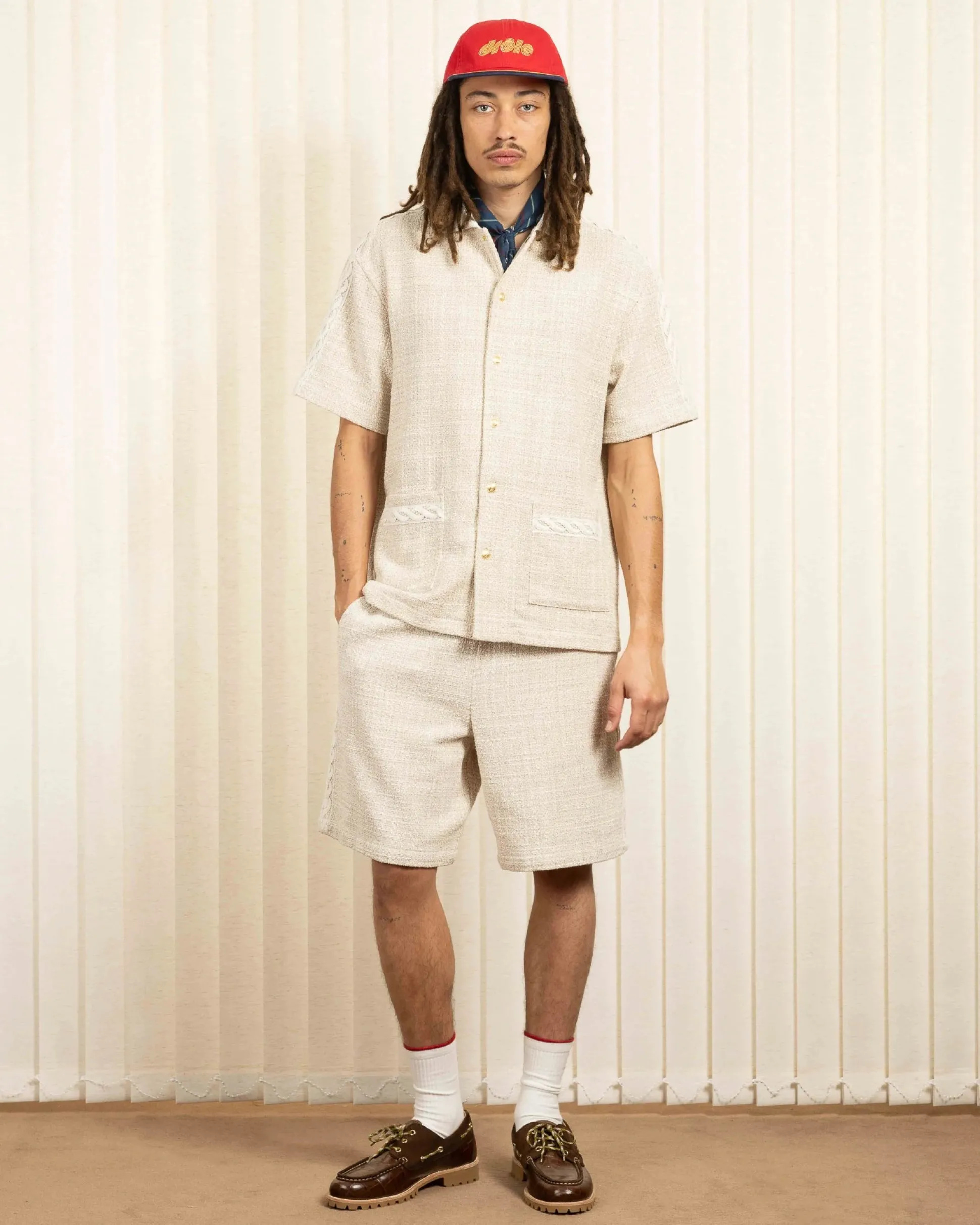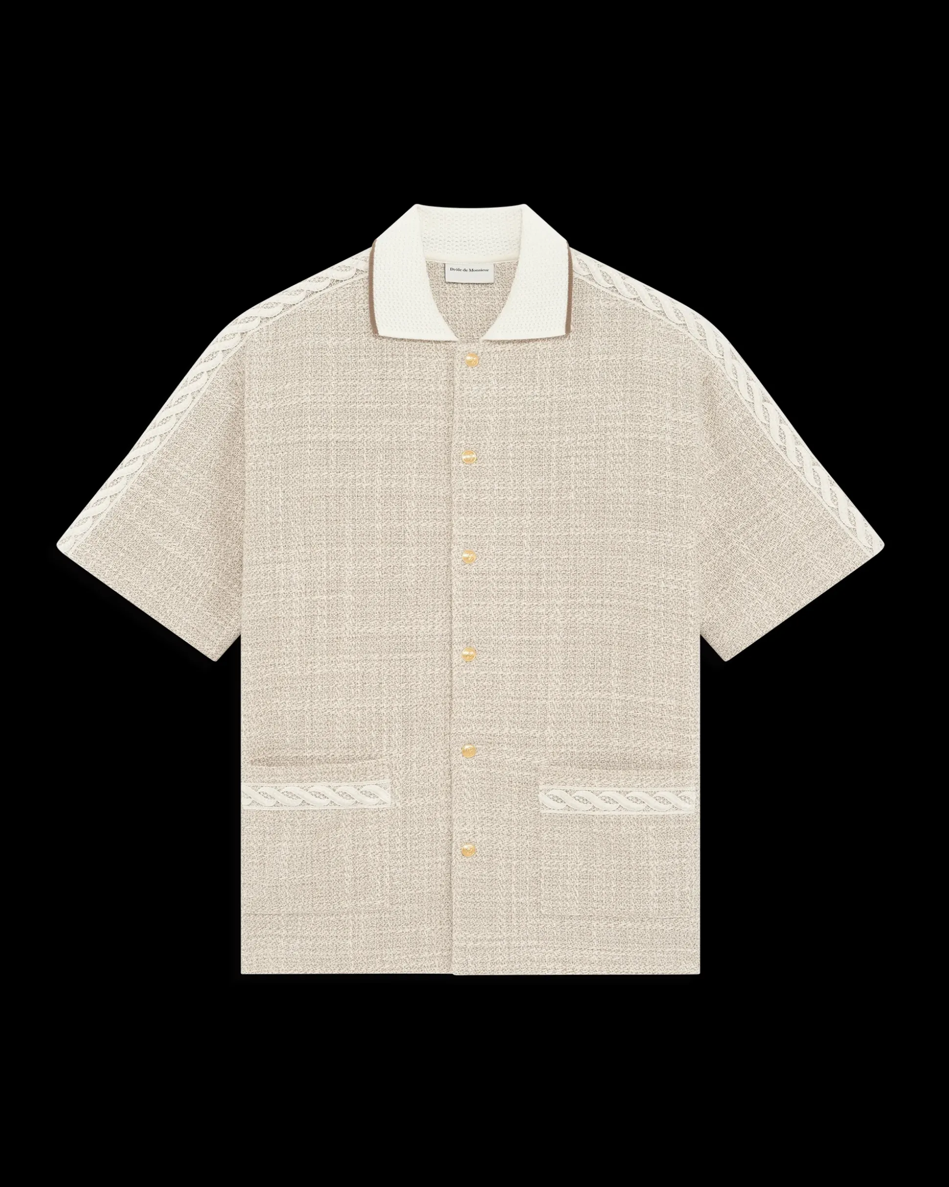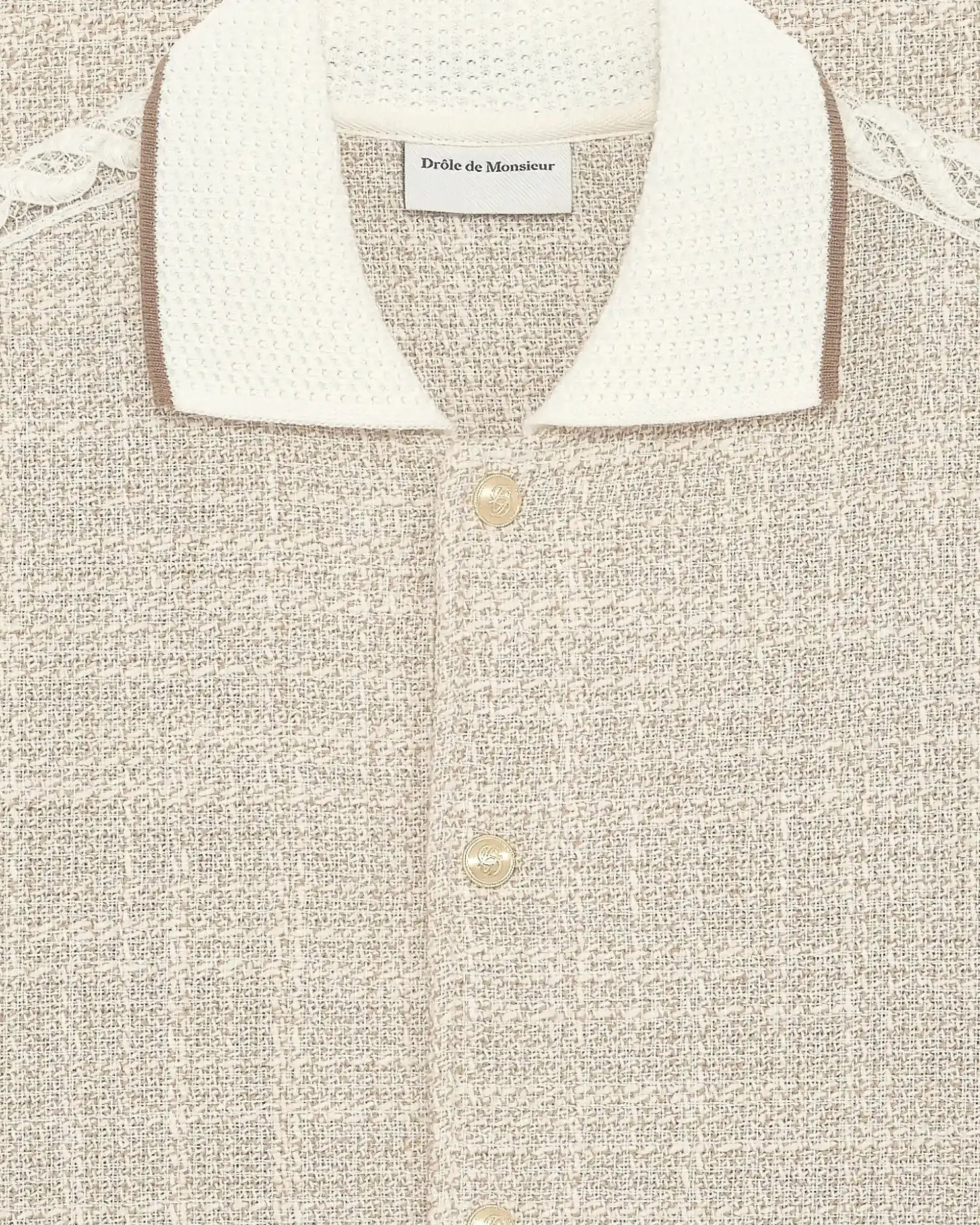 This beige tweed short-sleeved shirt is made from a cotton blend fabric. It has a knitted mesh collar, a loose fit, two patch pockets with a guipure trim and six engraved snap buttons on the front.• Tweed short-sleeved shirt• Knitted mesh collar• Loose fit• 2 patch pockets with guipure trim• 6 engraved snap buttons on the front• 68% cotton, 27% polyester and 5% other fibersColor: BeigeMade in Portugal