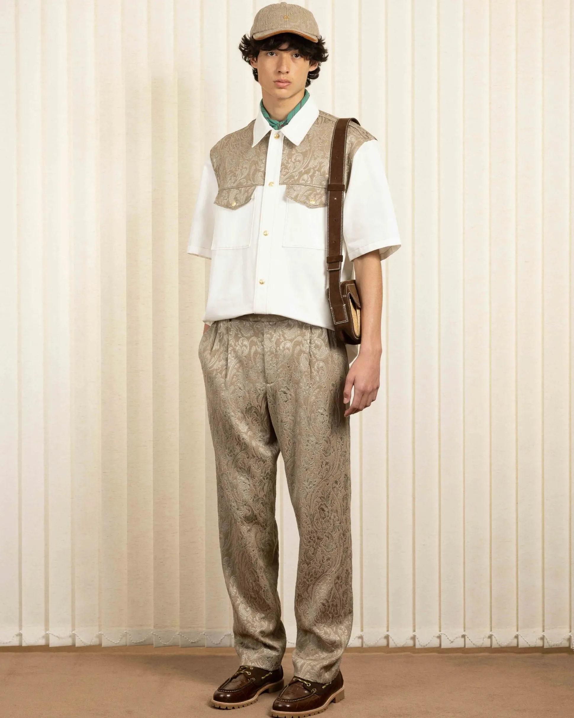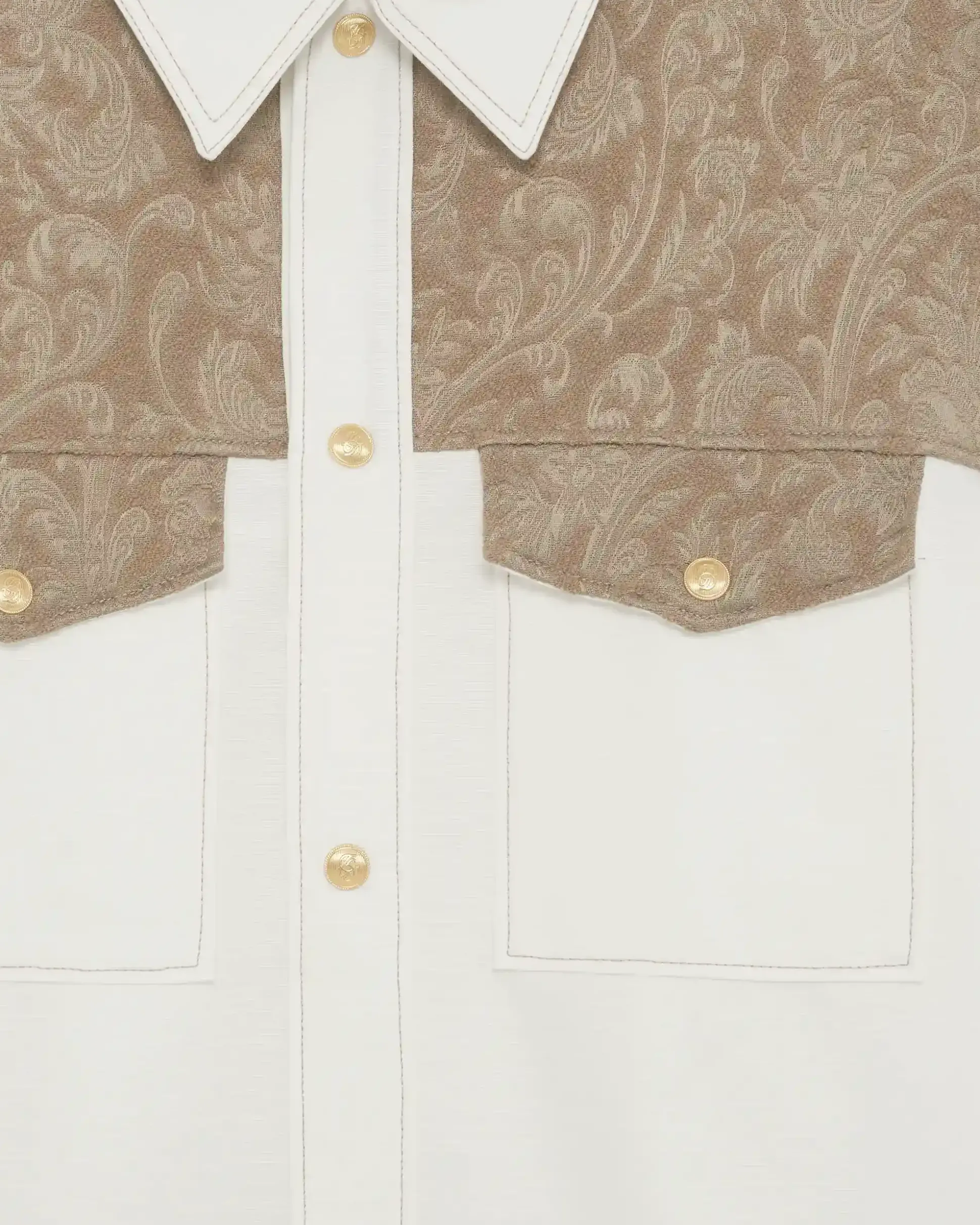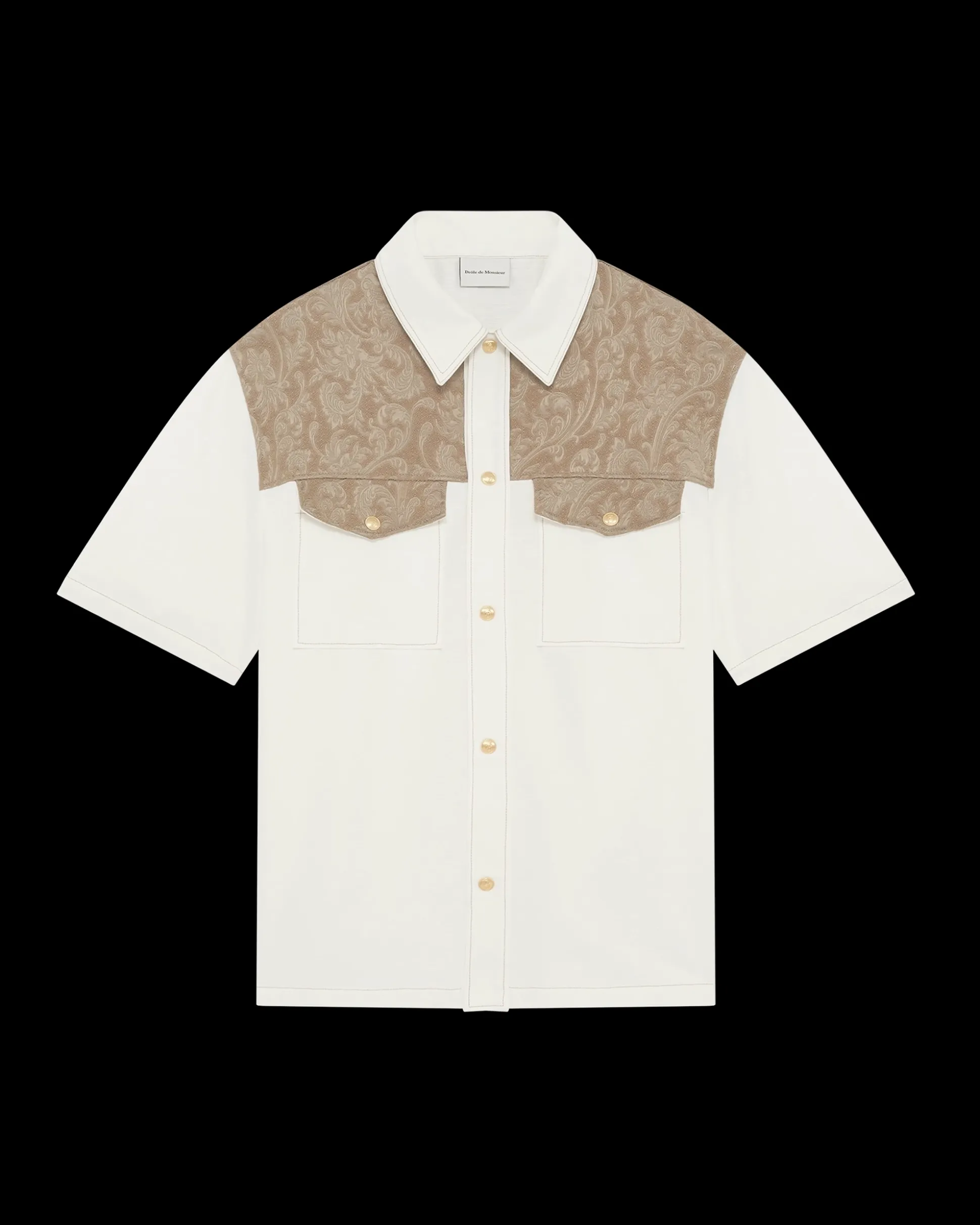 This white short-sleeved shirt is made from two fabrics: the body is 100% textured cotton with a wool blend jacquard insert. It has a loose fit, two patch pockets with a guipure trim and seven engraved snap buttons on the front.• Short-sleeved shirt• Jacquard and textured cotton• Loose fit• 2 patch pockets with guipure trim• 7 engraved snap buttons on the front• Fabric 1 : 100% cotton• Fabric 2 : 43% viscose, 9% polyamid, 37% wool and 1% elasthaneColor: WhiteMade in Portugal