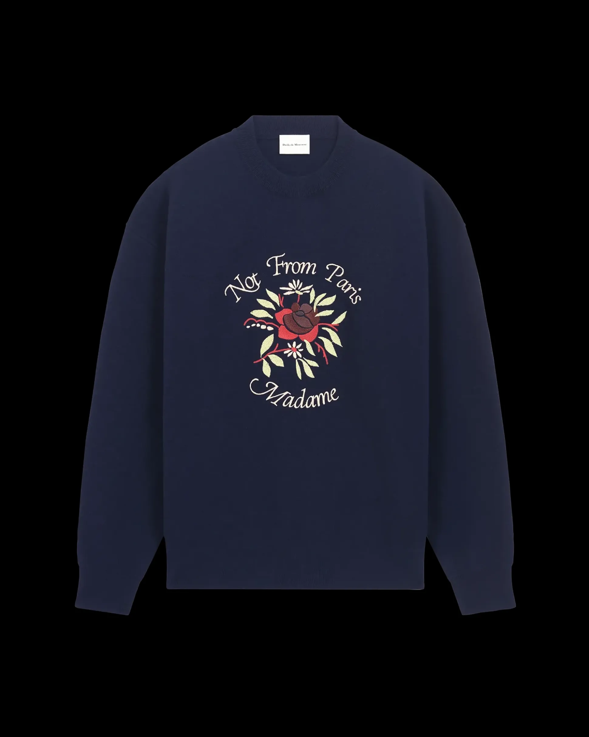 This navy 100% merino wool sweater has a round collar, low armholes and a ribbed finish. It features the ‘Slogan Fleurs’ embroidery on the front.