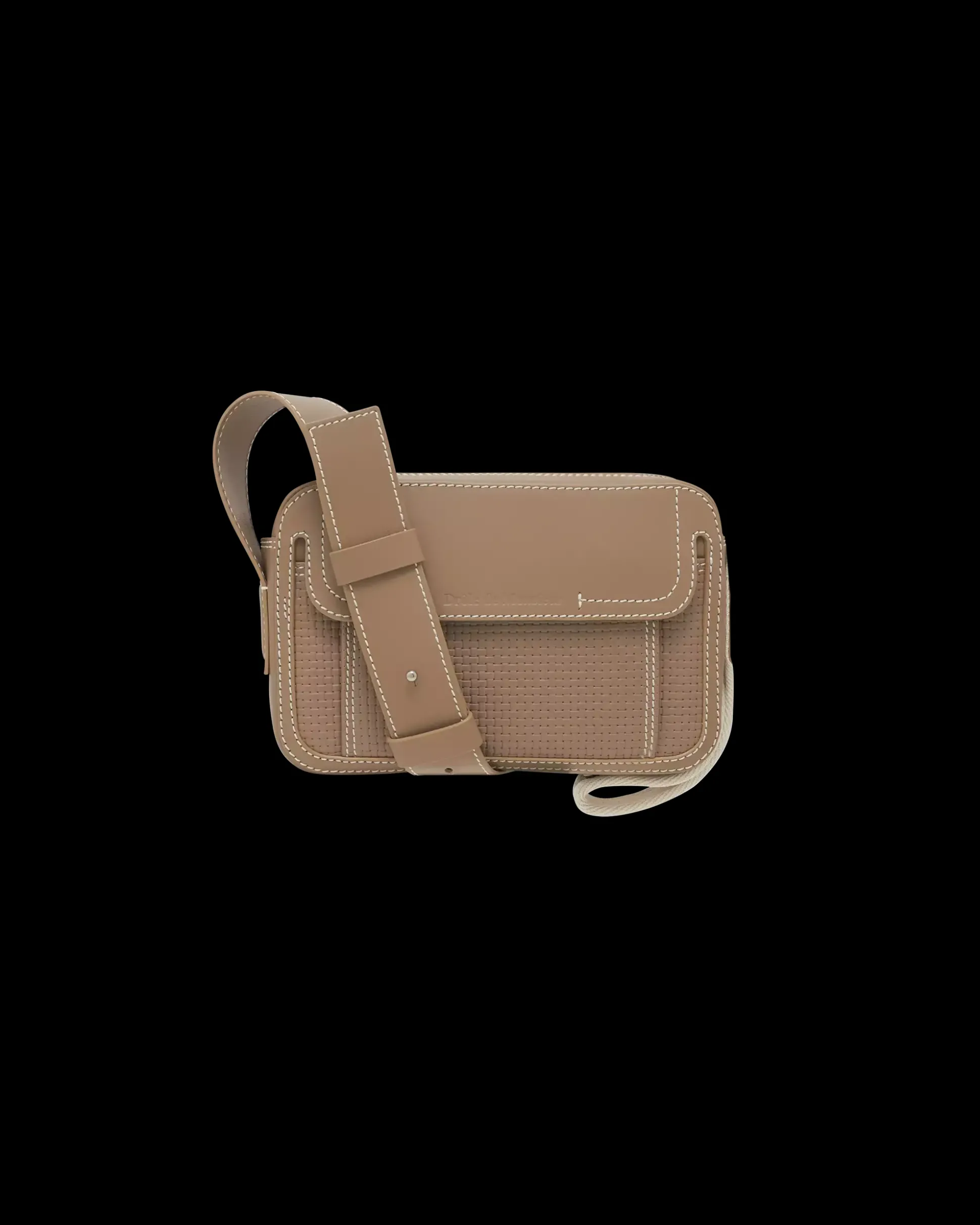 Practical and compact. Introducing an updated version of Drôle de Monsieur’s signature zipped bag: this cream embossed leather bag has contrast stitching, a front flap pocket with an embossed logo, an adjustable leather and canvas shoulder strap, a decorative strap with snap fasteners and an interior pocket with a leather label.