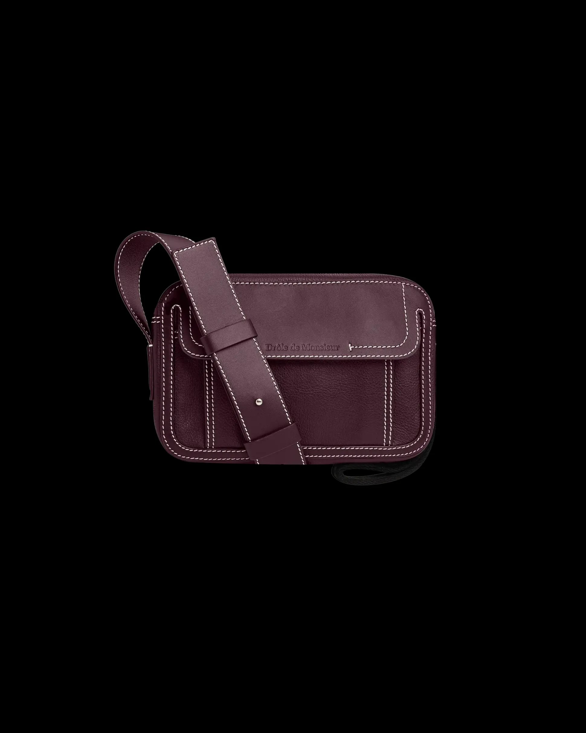 Practical and compact. Introducing Drôle de Monsieur’s signature zipped leather bag in burgundy: it features a front flap pocket with an embossed logo, an adjustable leather shoulder strap and contrast stitching.