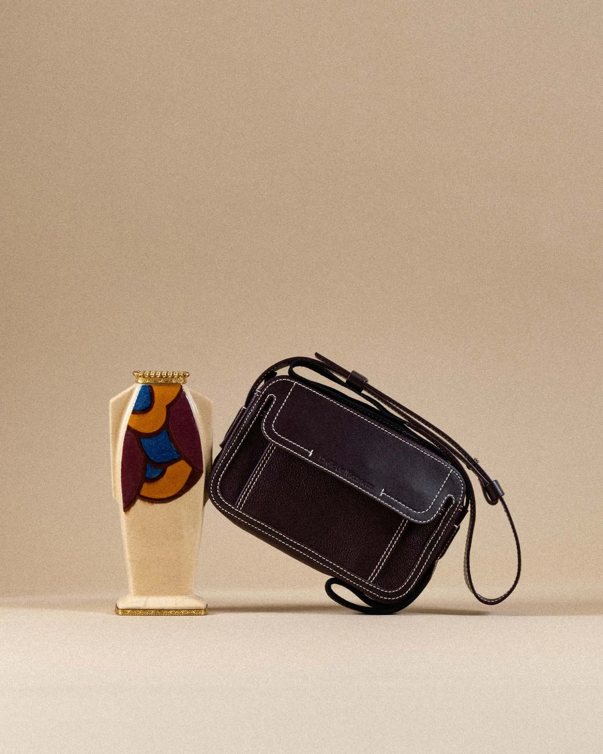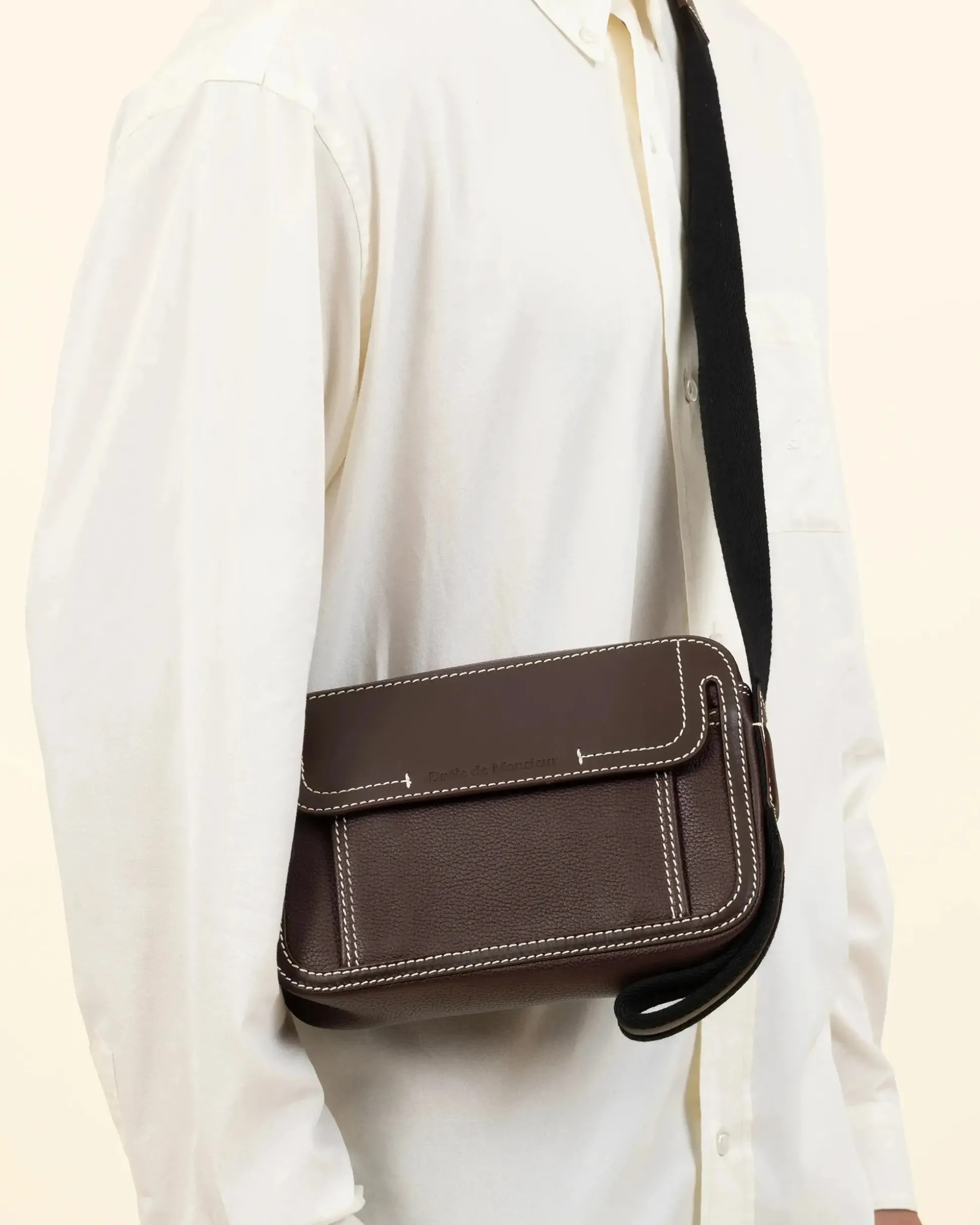 • Zipped bag in leather• Front flap pocket with embossed logo• Leather framed with contrasted stitching• Adjustable shoulder strap in leather• Decorative strap with snap fasteners• Interior pocket with leather label