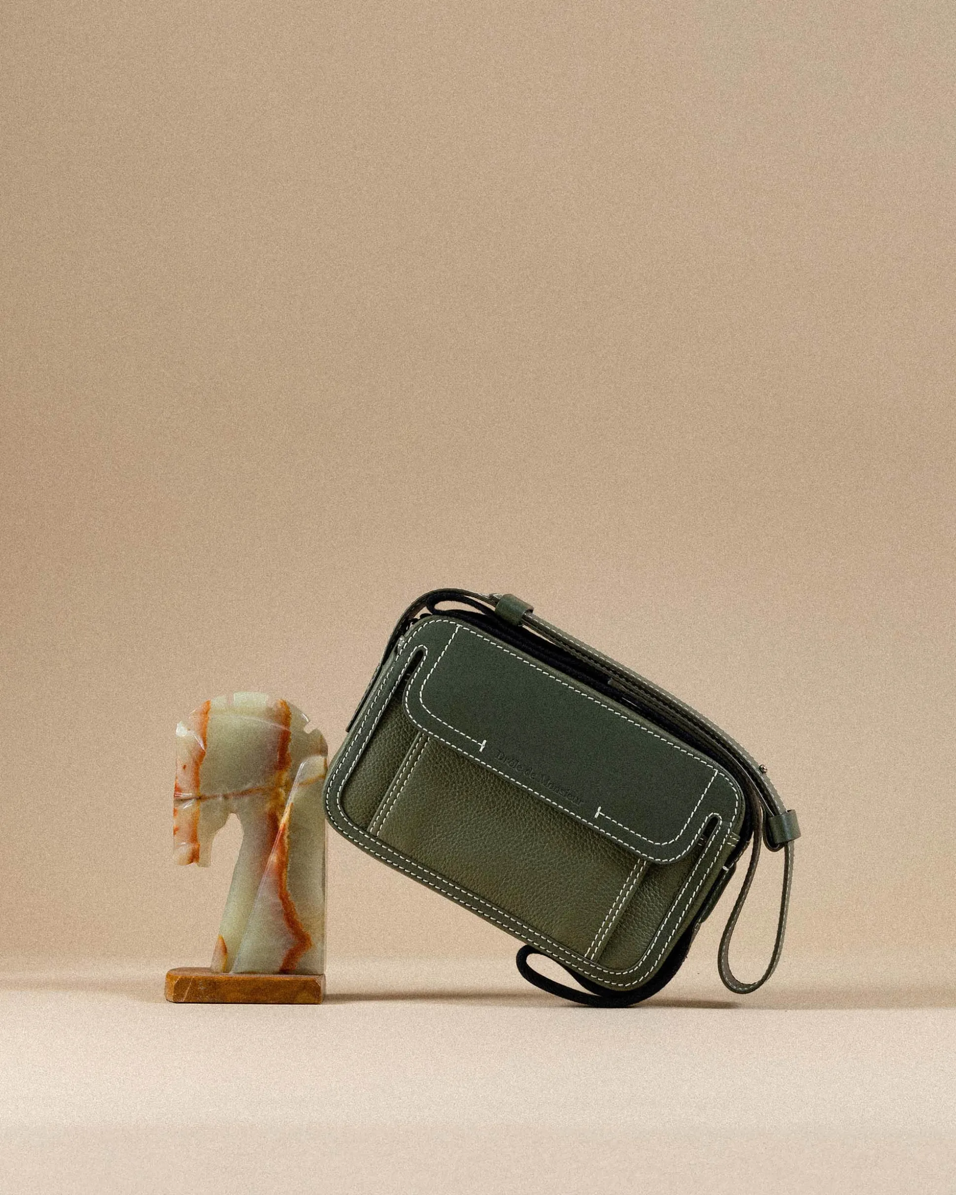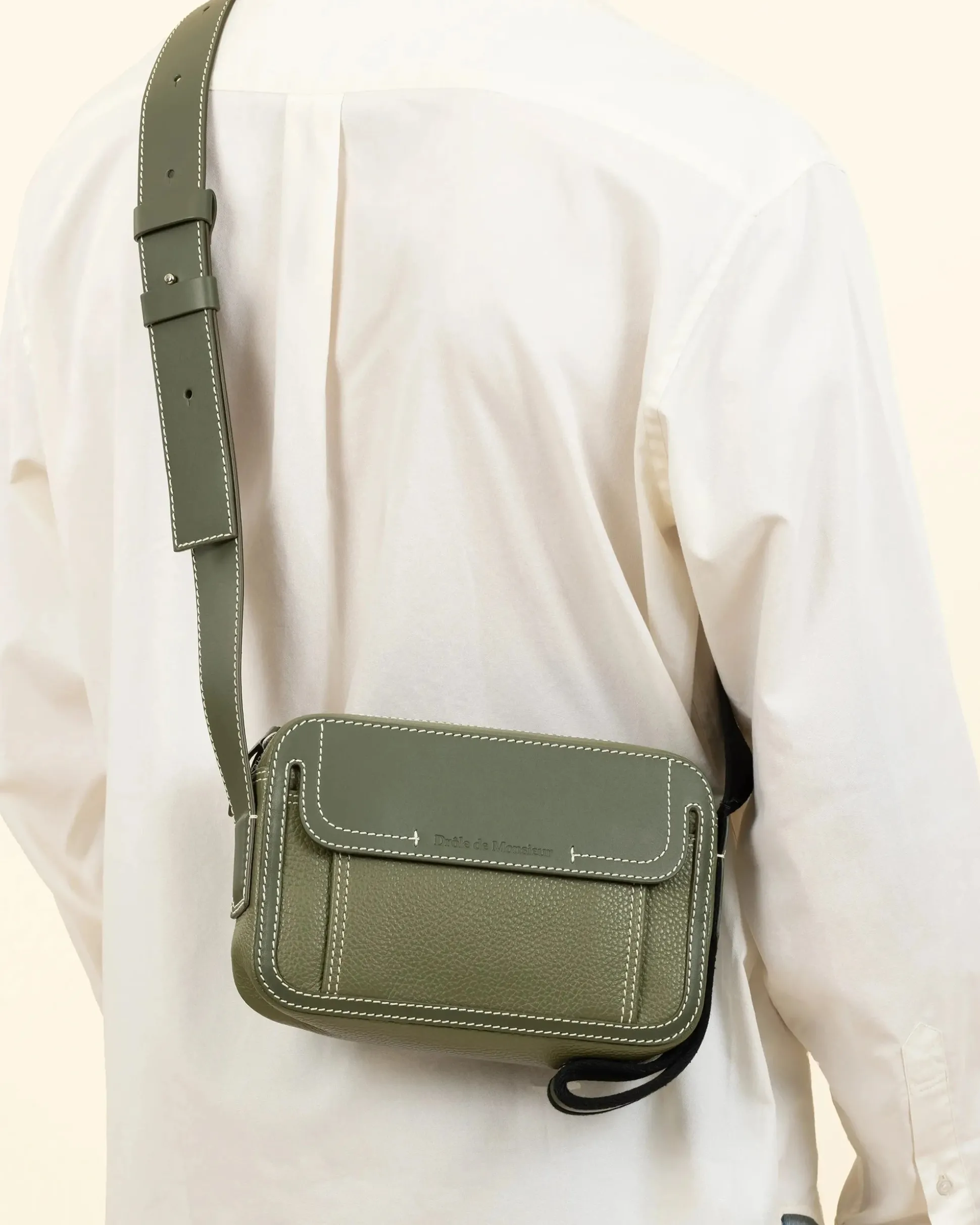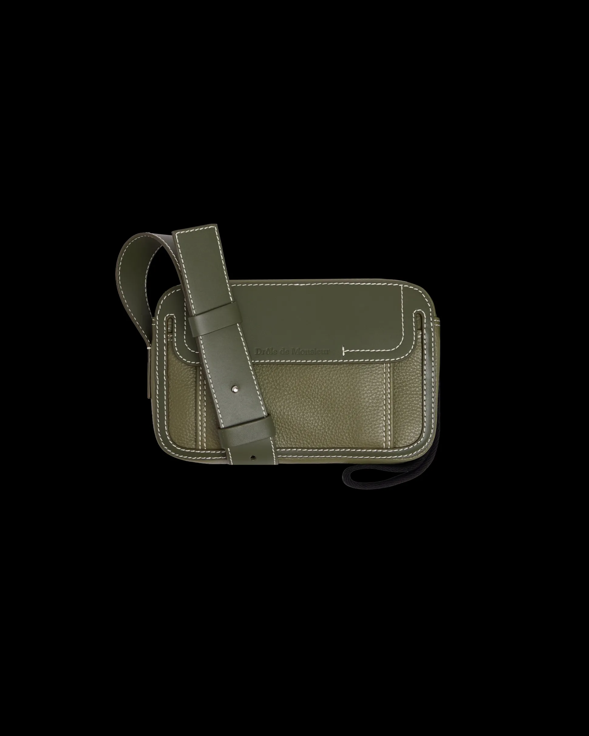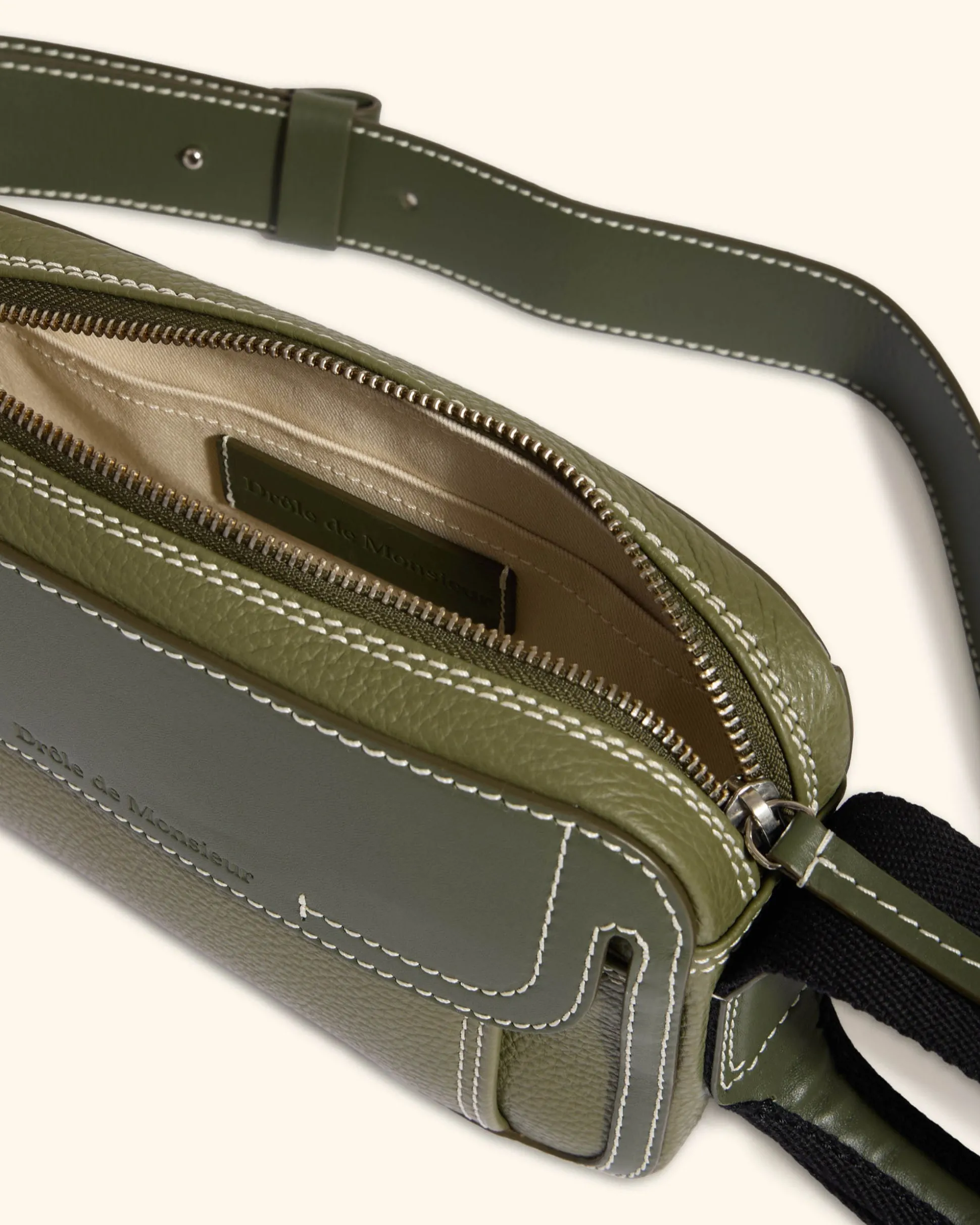 Practical and compact. This kaki zipped leather bag features a front flap pocket with an embossed logo, an adjustable leather shoulder strap and contrast stitching.
