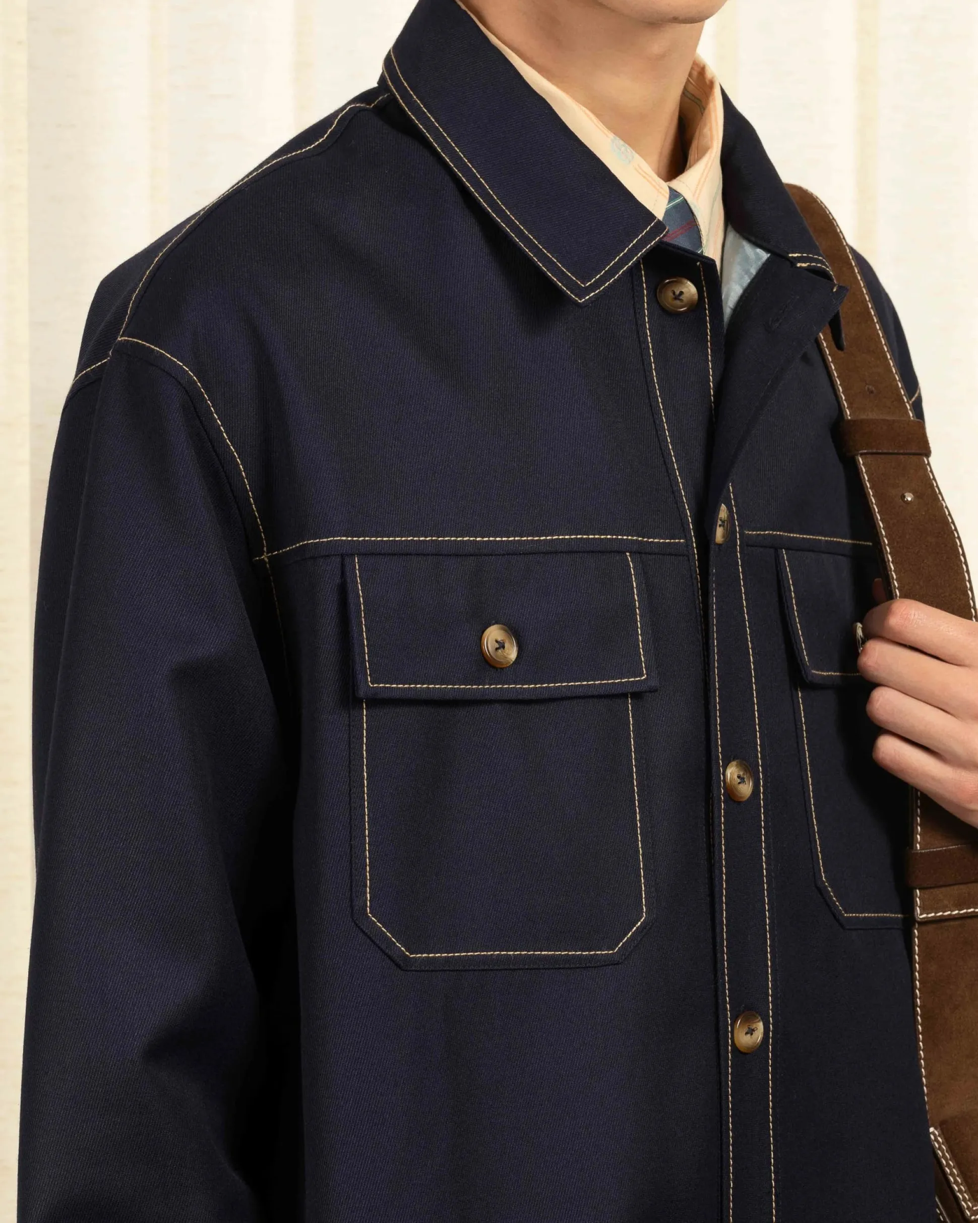 This navy wool blend overshirt has a viscose lining, contrast stitching, two front patch pockets with flaps on the chest, buttoned cuffs and six front buttons.• Wool blend overshirt• Viscose lining • Contrast stitching • 2 front patch pockets with flaps on the chest• Buttoned cuffs• 6 front buttons• 45% virgin wool and 55% polyesterColor: NavyMade in Europe