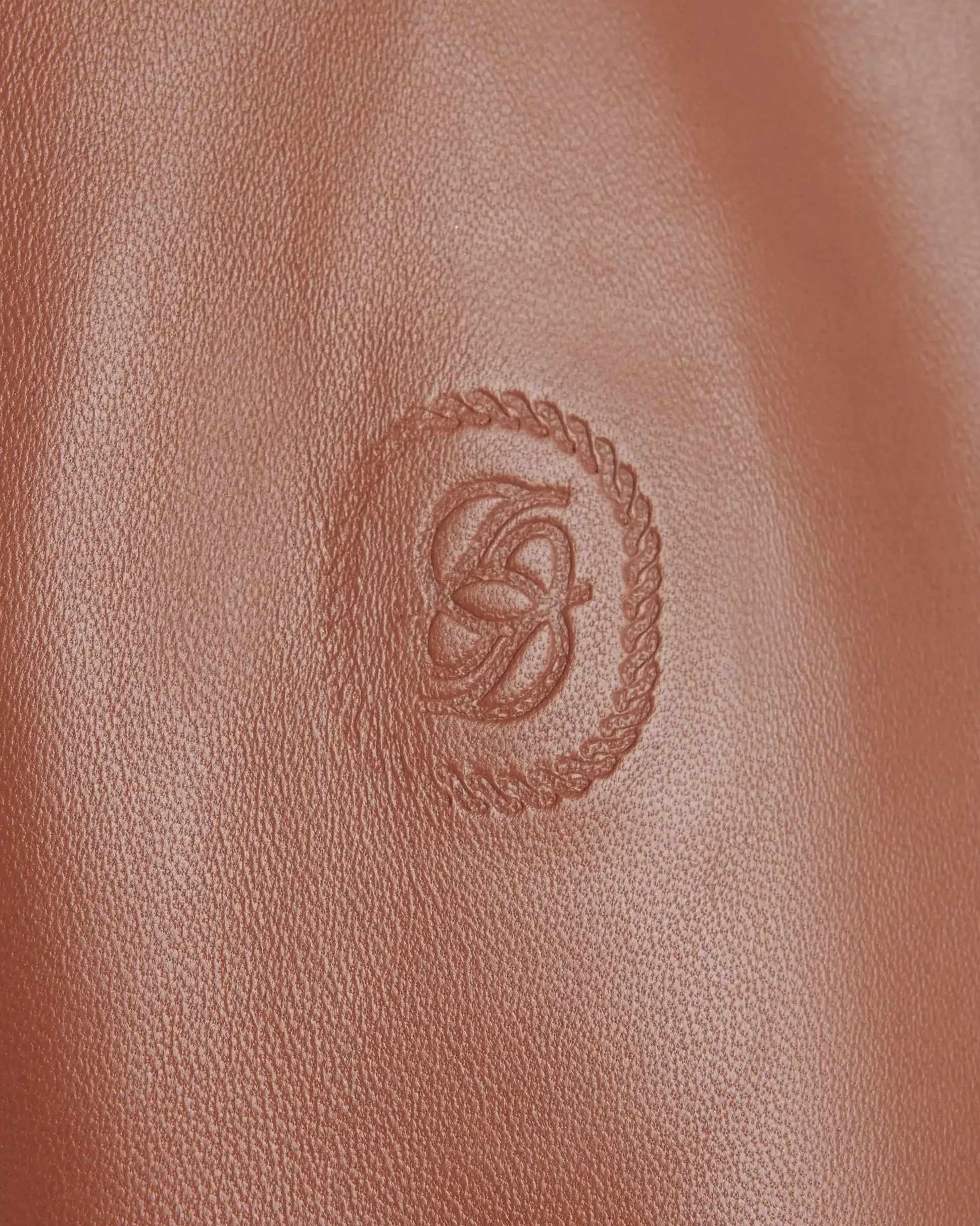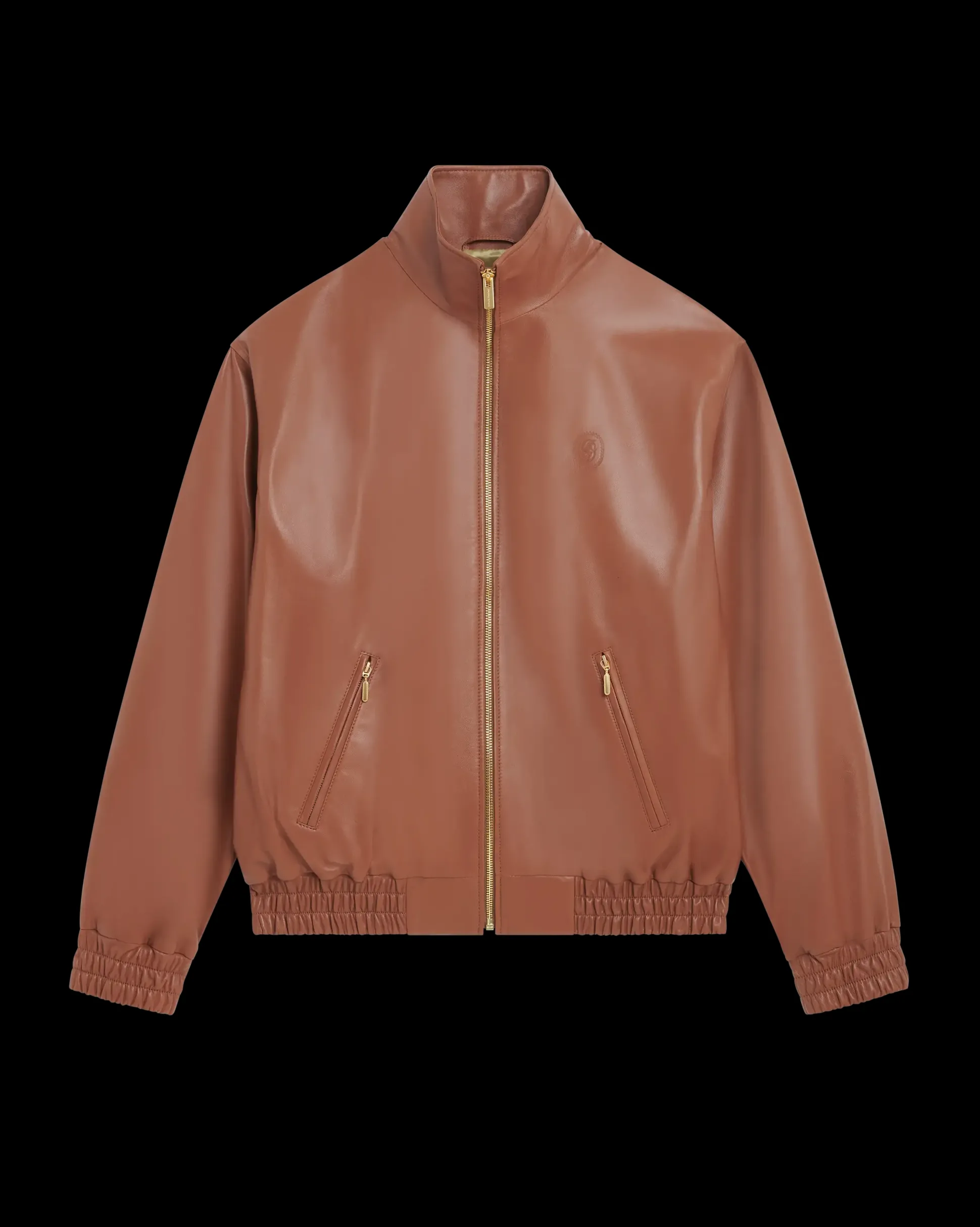 This brown leather tracksuit jacket features an embossed mirrored ‘D’ on the front. It has a high collar, two zipped welt pockets, an engraved zip down the middle front and elasticated finishes.