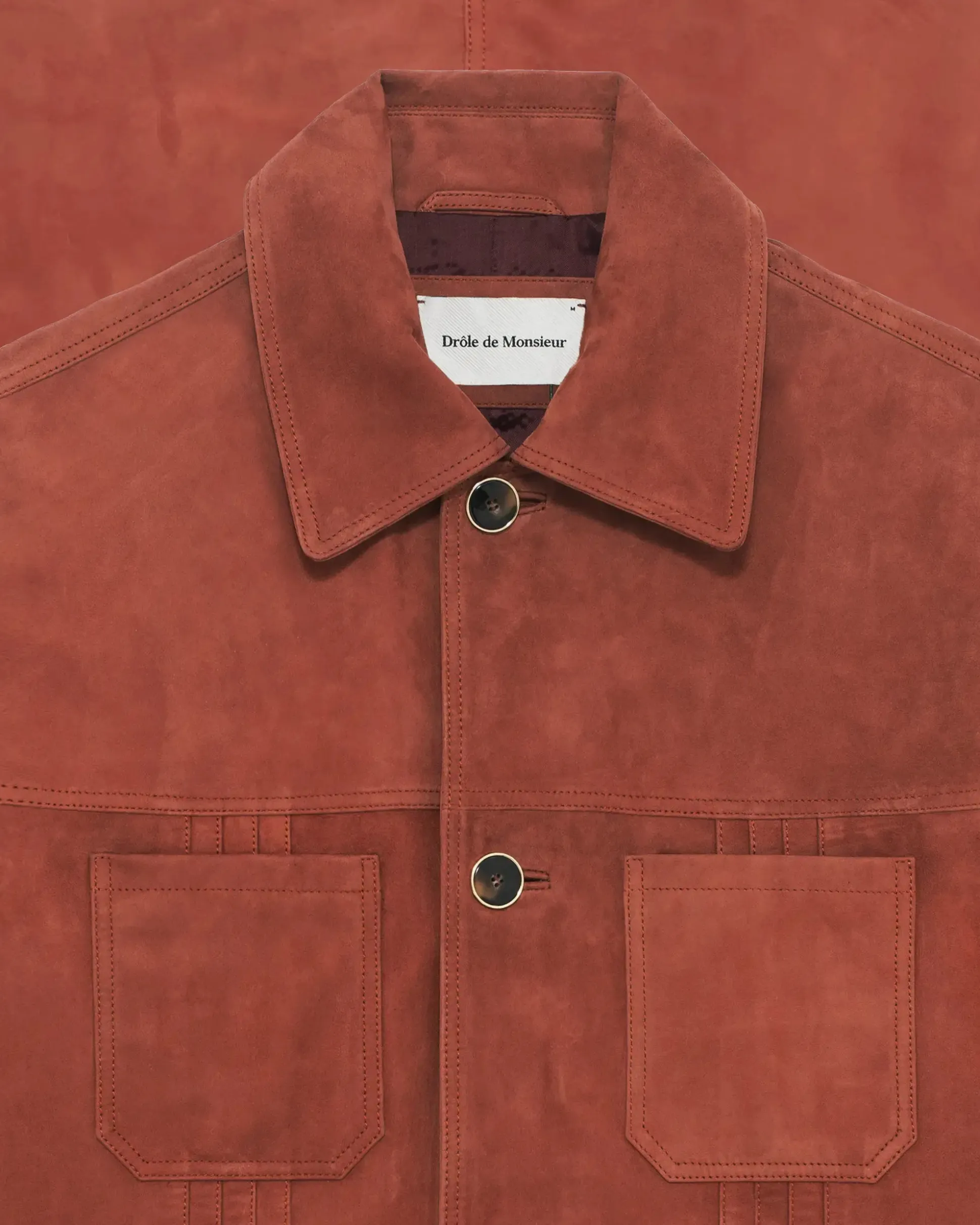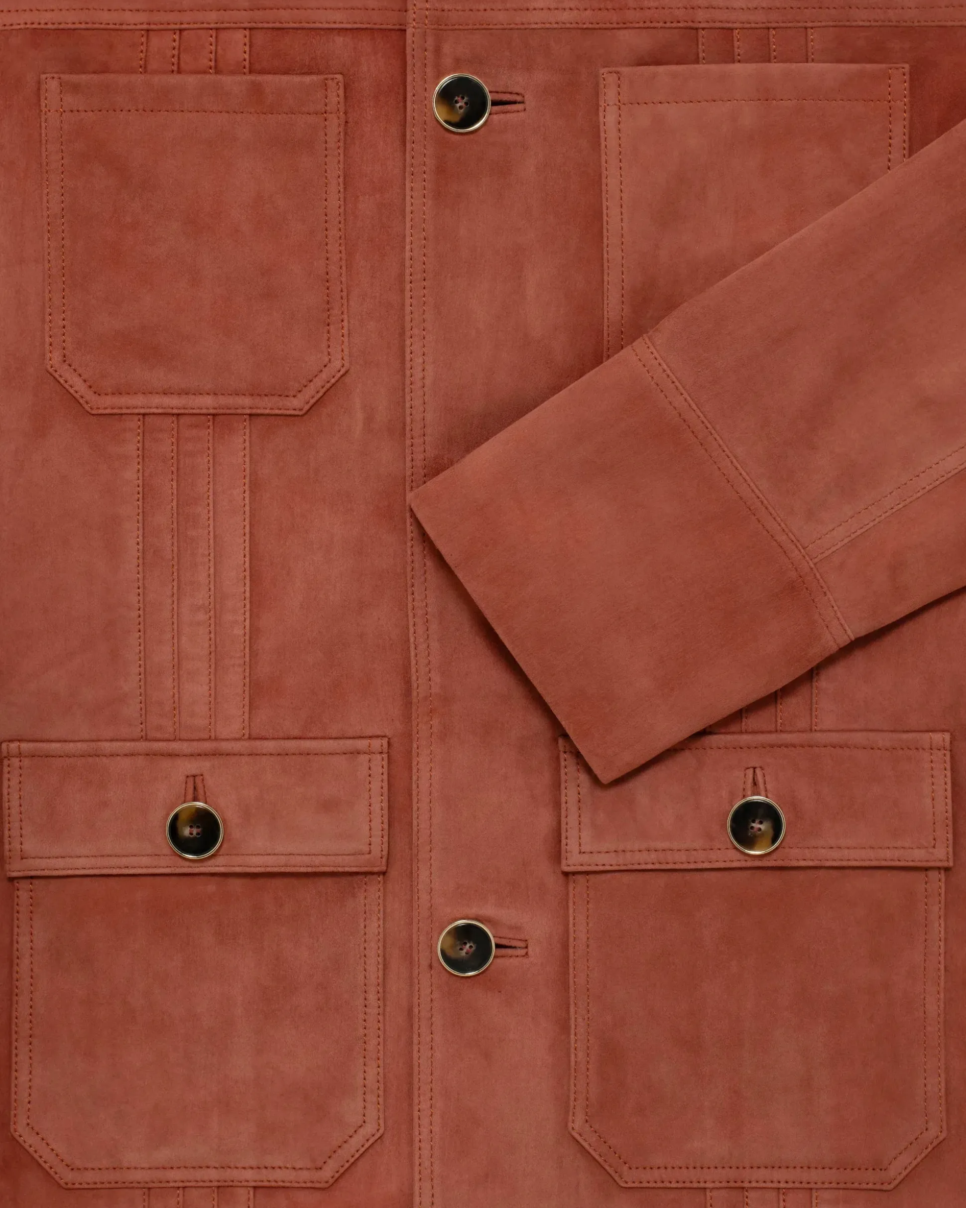 This red 100% leather suede jacket features pleated details. It has a viscose linin, two chest patch pockets, two flap pockets with buttons and five front buttons.• Suede jacket• Pleated details• Viscose lining• 2 chest patch pockets• 2 flap pockets with buttons• 5 front buttons• 100% leatherColor: RedMade in Europe