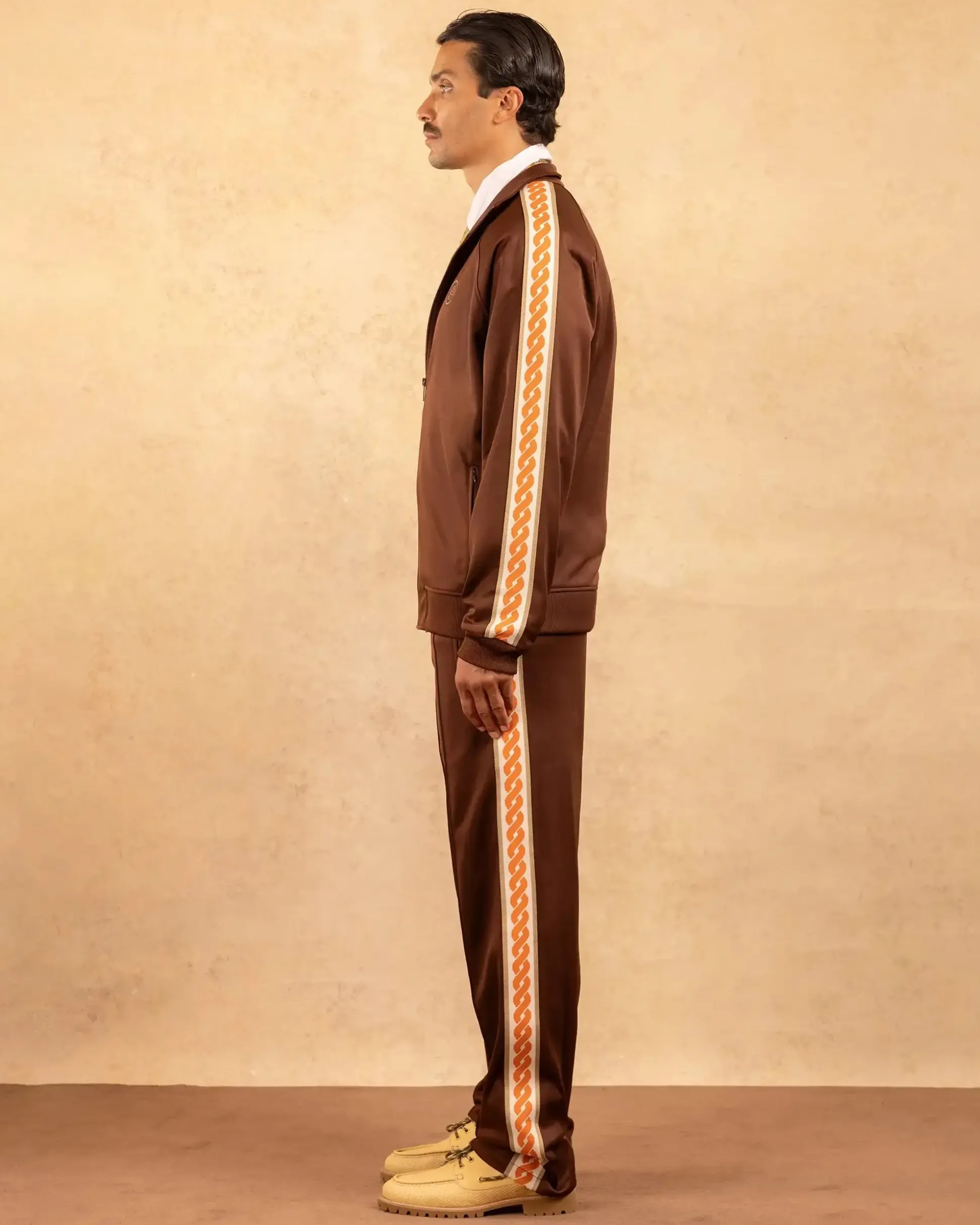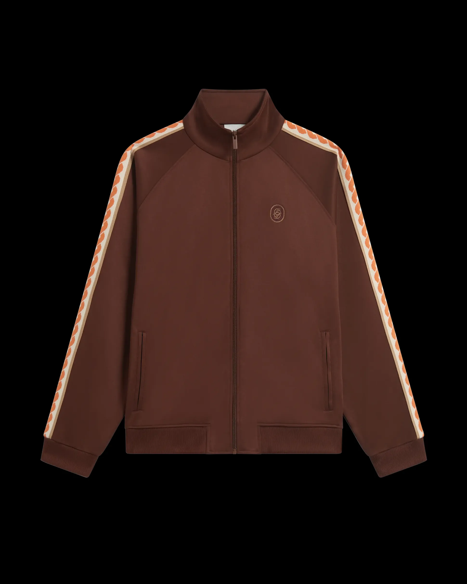 This brown double interlock tracksuit jacket features a mirrored ‘D’ embroidery on the front and contrast braided shoulder bands. It has a stand-up collar, two zipped welt pockets, an engraved central zipper closure and a ribbed trim.