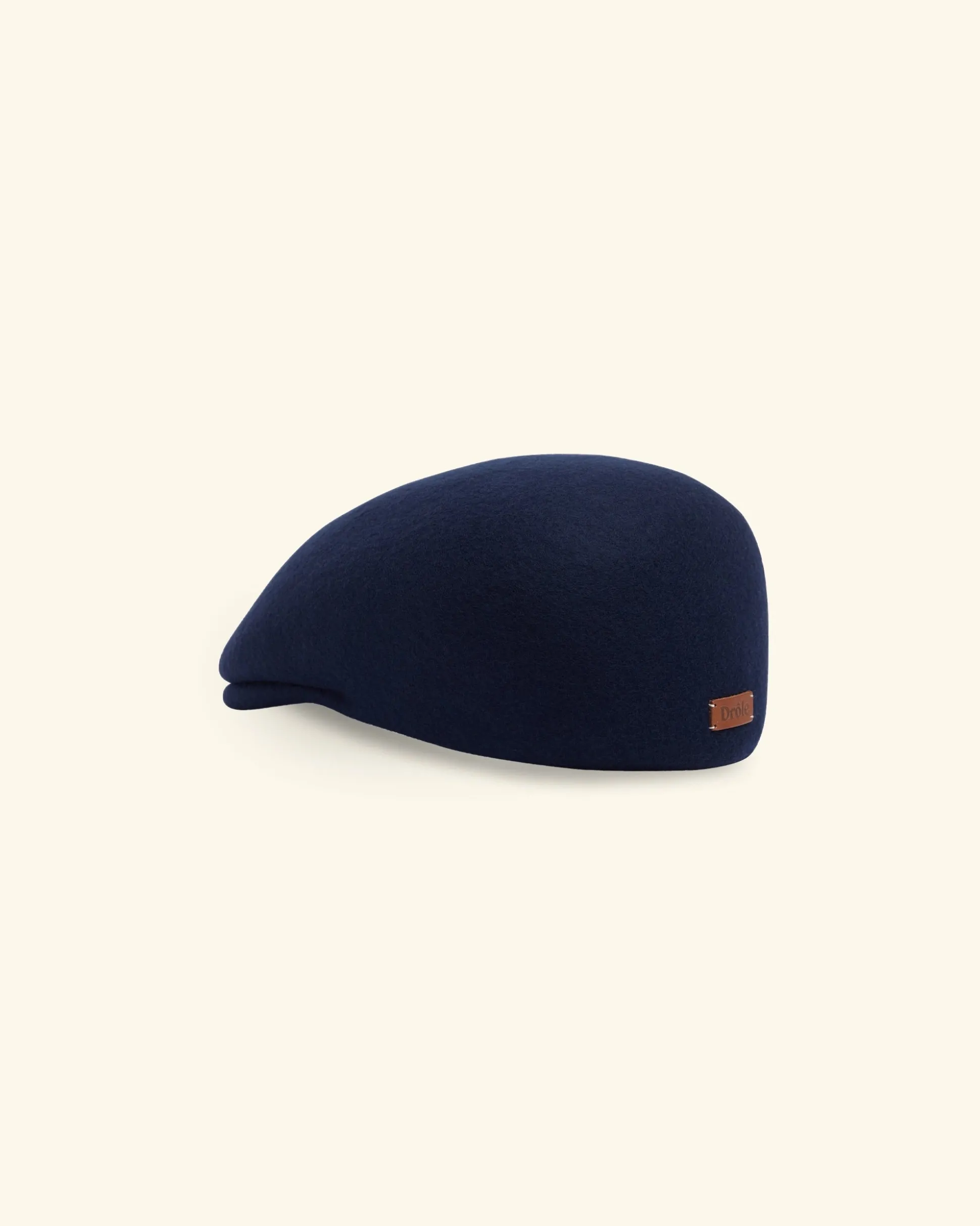 This navy felt beret features a ‘Drôle’ leather patch on back and an elastic band inside.• 100% wool felt beret• Elastic band inside• ‘Drôle’ leather patch on backMade in Italy