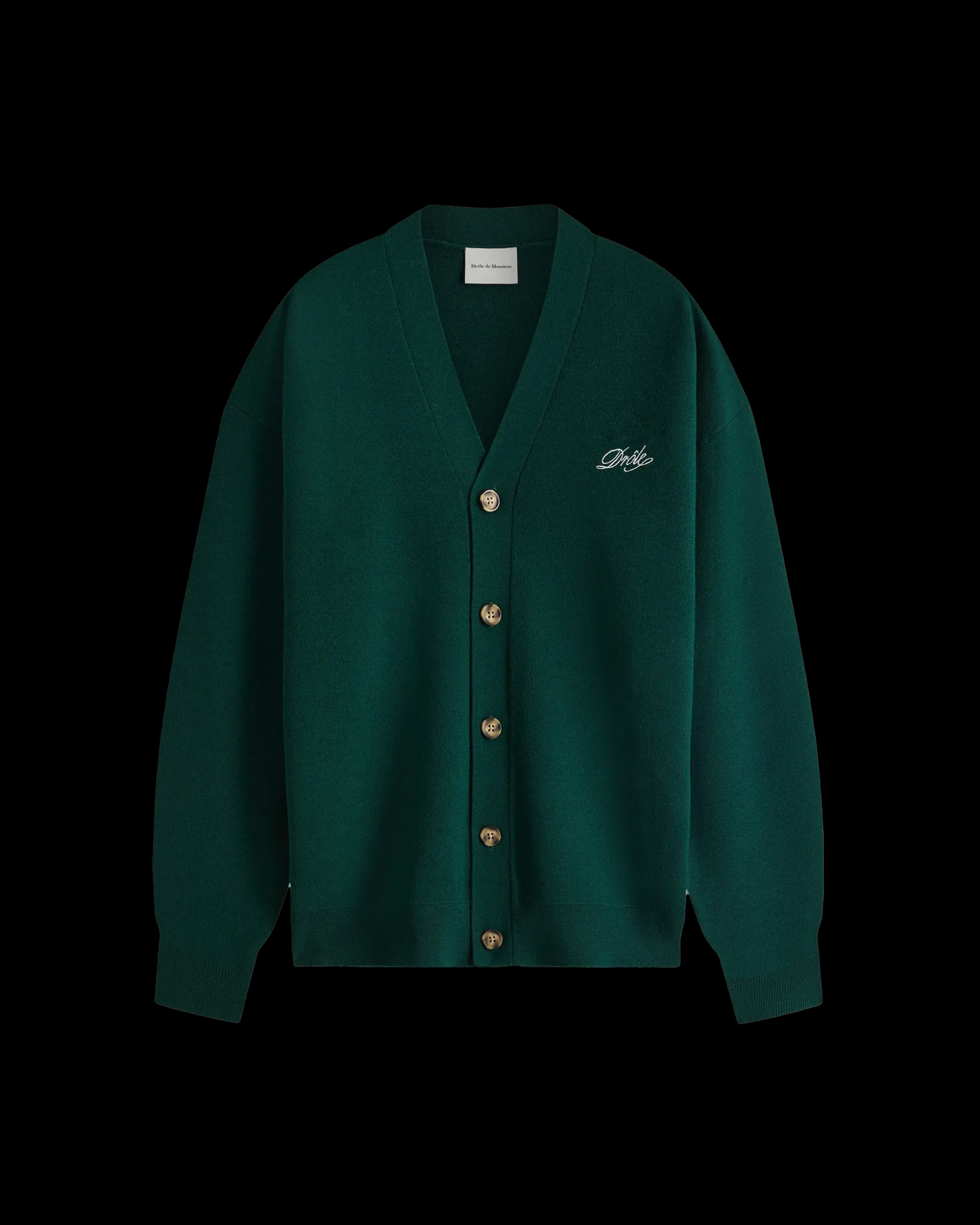 This dark green 100% wool knitted cardigan is features a ‘Drôle’ embroidery on chest, ribbed edges and five buttons on the front.• 100% wool knitted cardigan• ‘Drôle’ embroidery on chest• Ribbed trim• 5 buttons on front