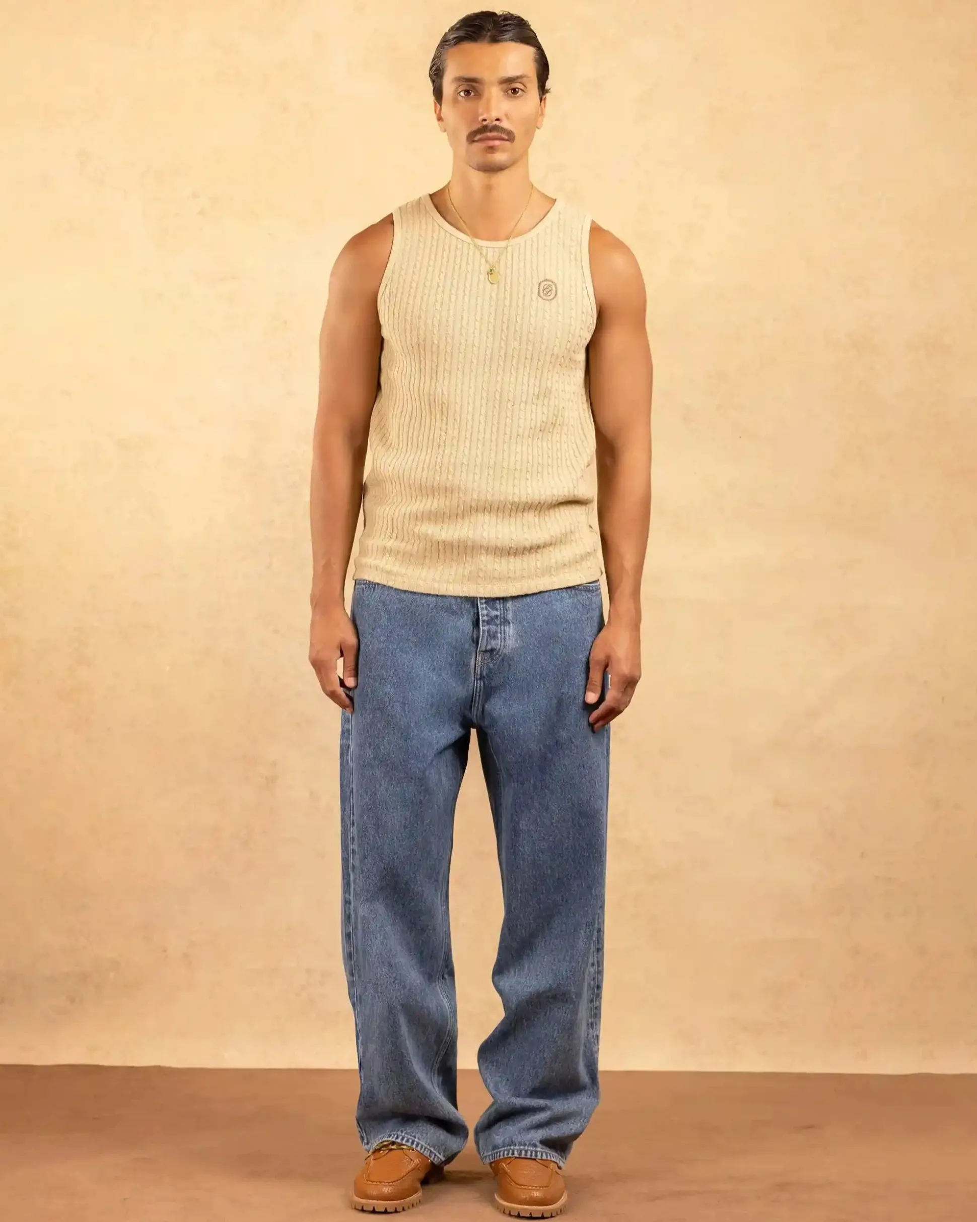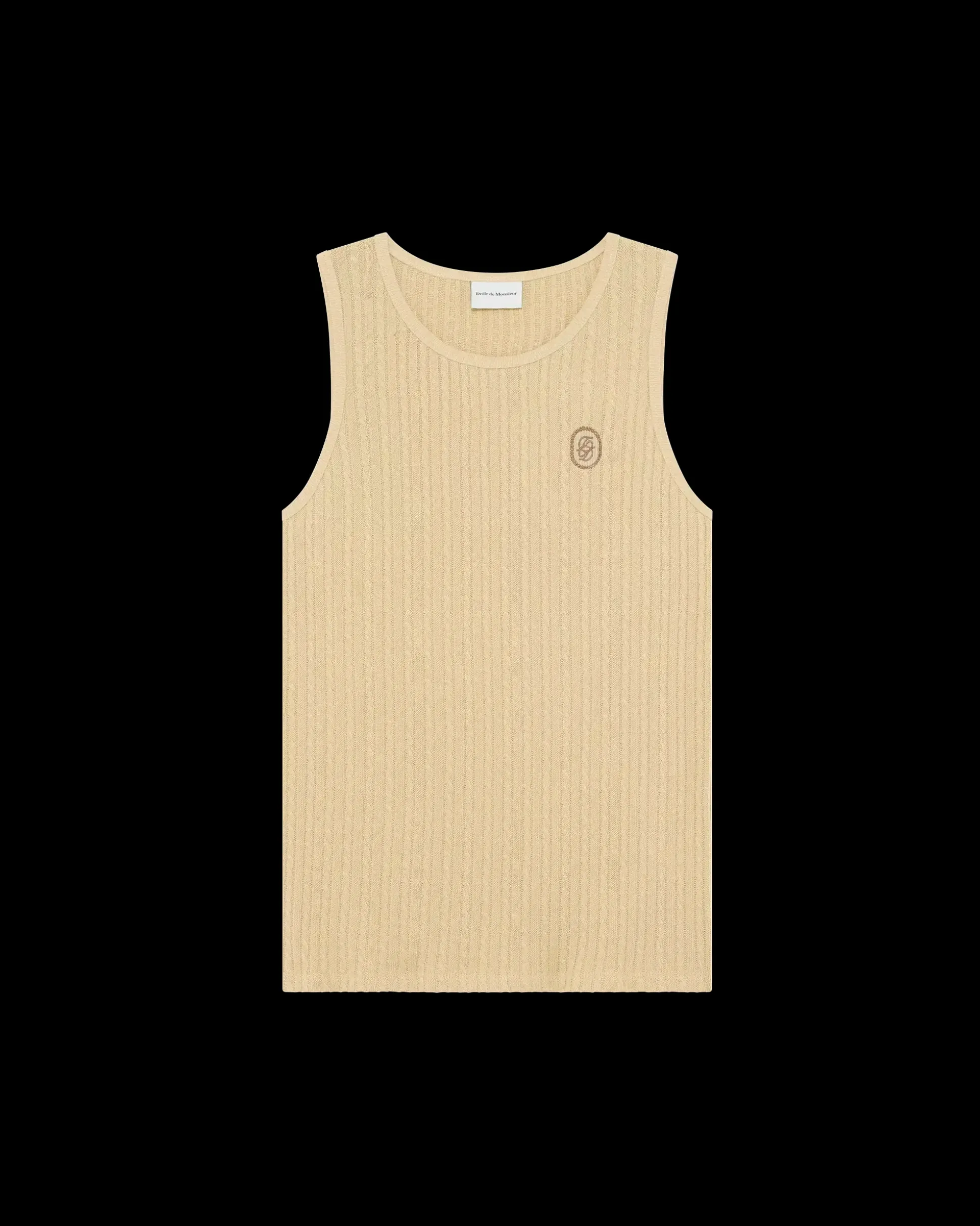 This beige 100% braided cotton tank top has a round neck and a mirrored ‘D’ embroidery on the front.