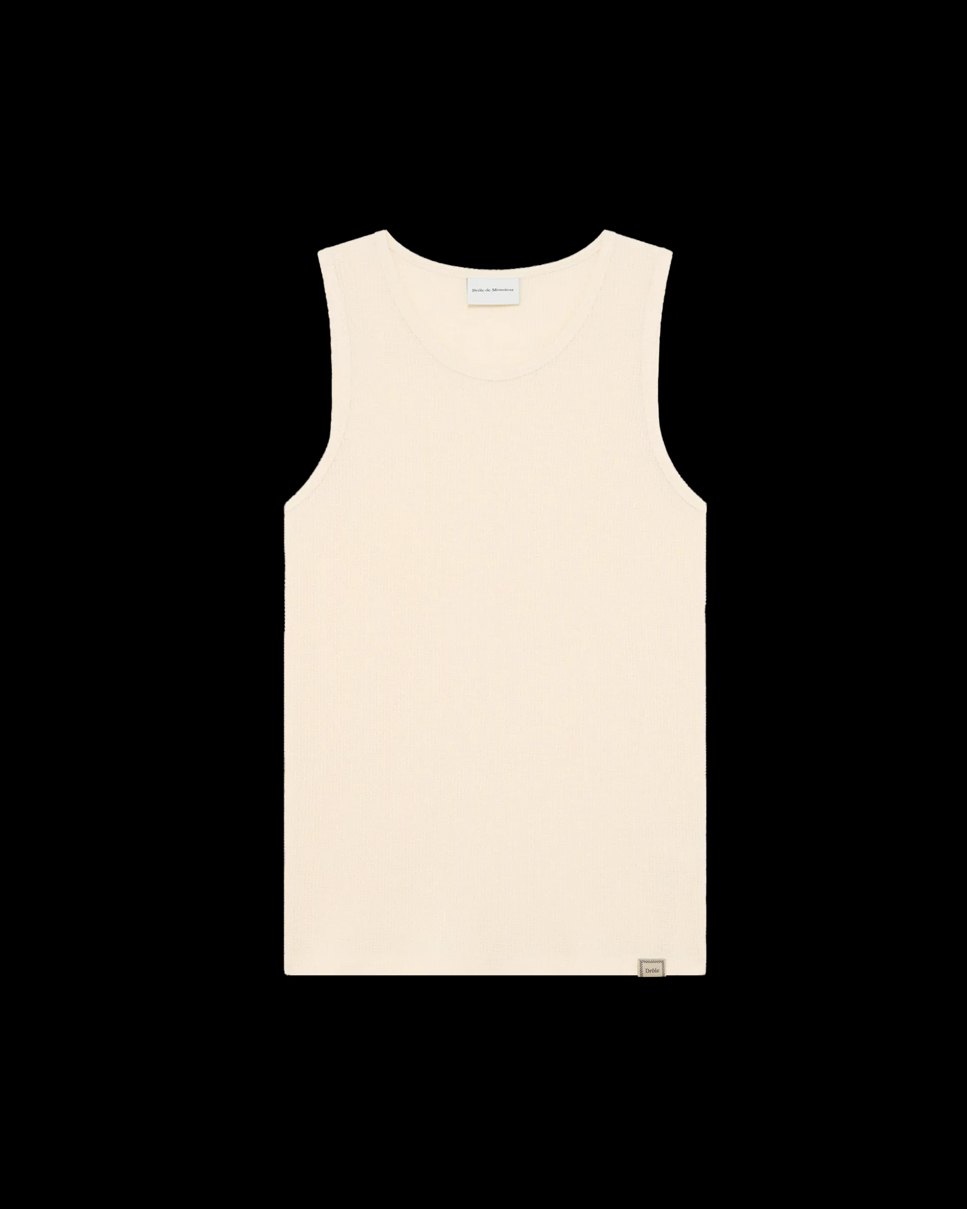 This cream 100% braided cotton tank top has a round neck and a woven ‘Drôle’ label on the front.