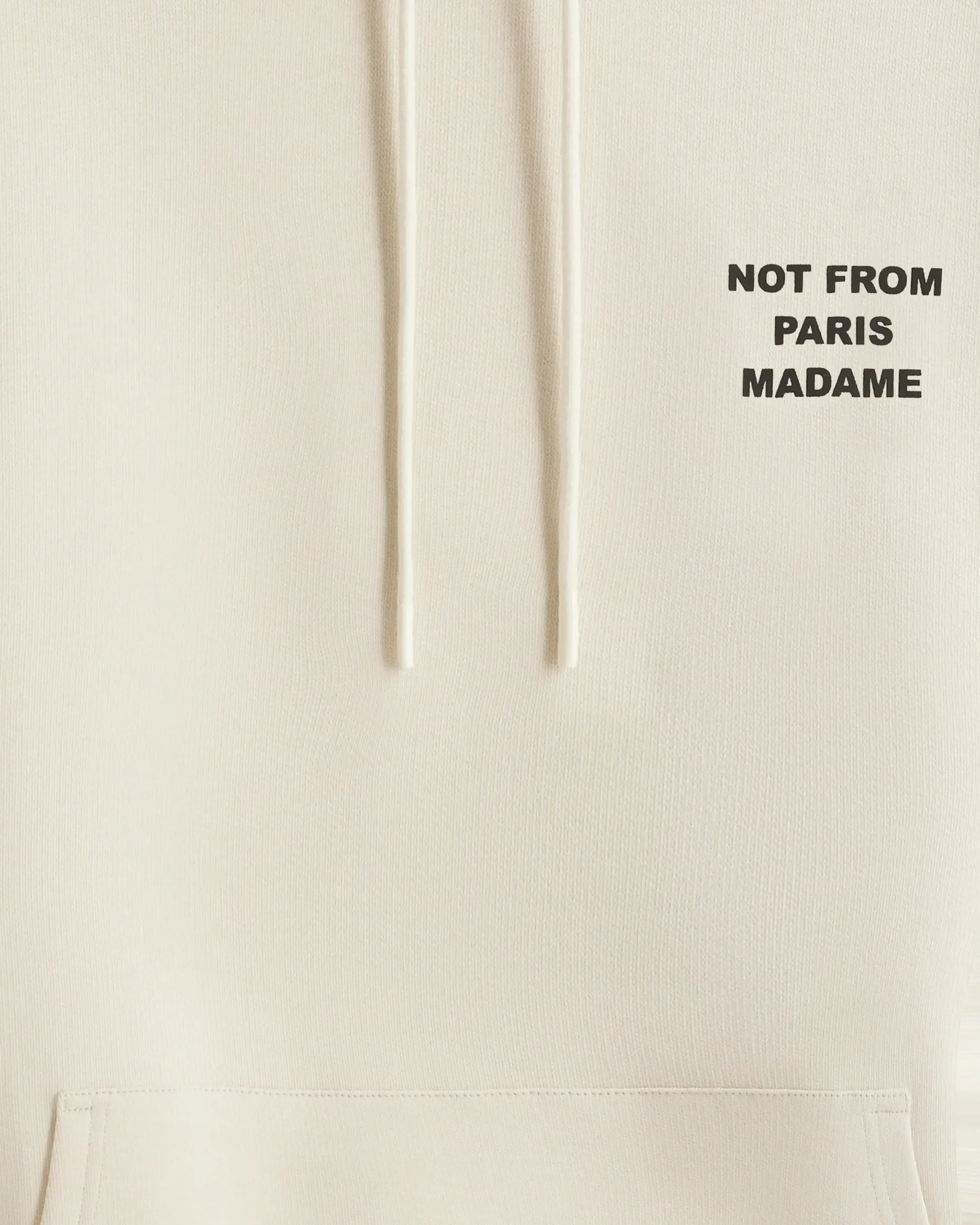 This beige 100% cotton French terry hoodie with ribbed hem and cuffs is printed with the ‘Not From Paris Madame’ slogan on the front and embroidered on the back.• Slogan printed at front and embroidered on the back• French terry hoodie• Ribbed hem and cuffs• 100% cotton – 430 GSMMade in Portugal