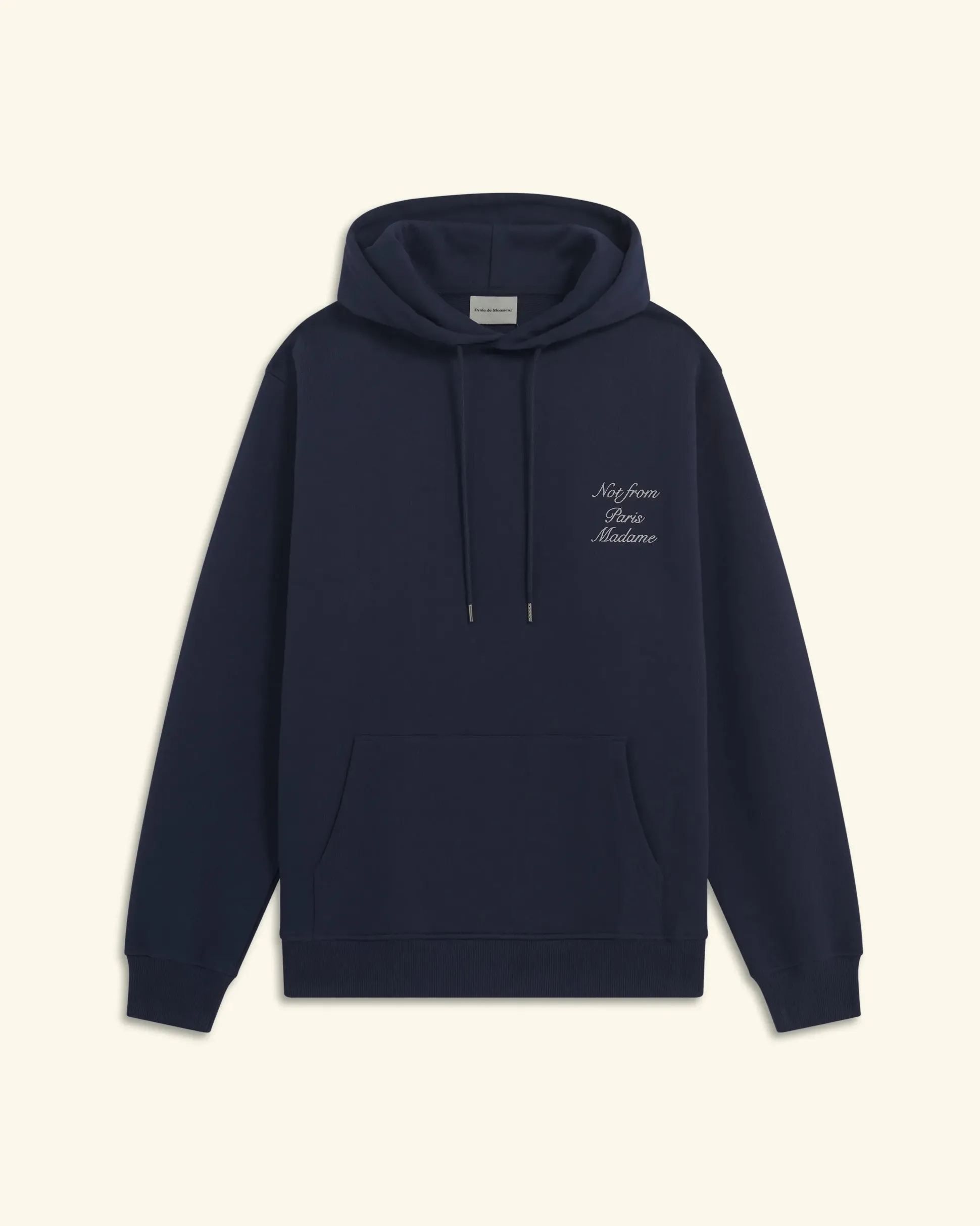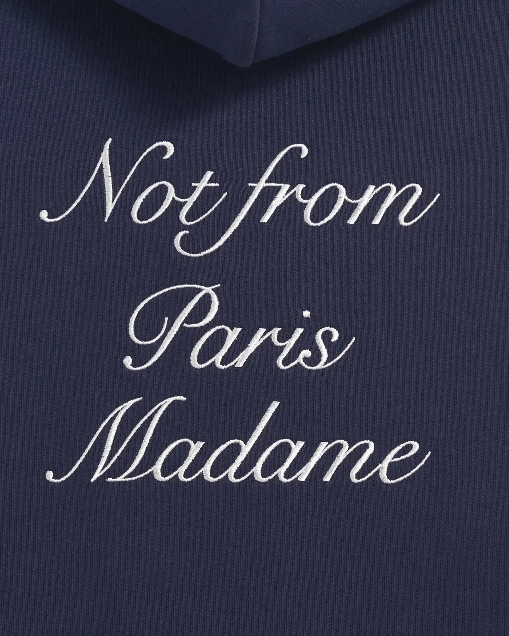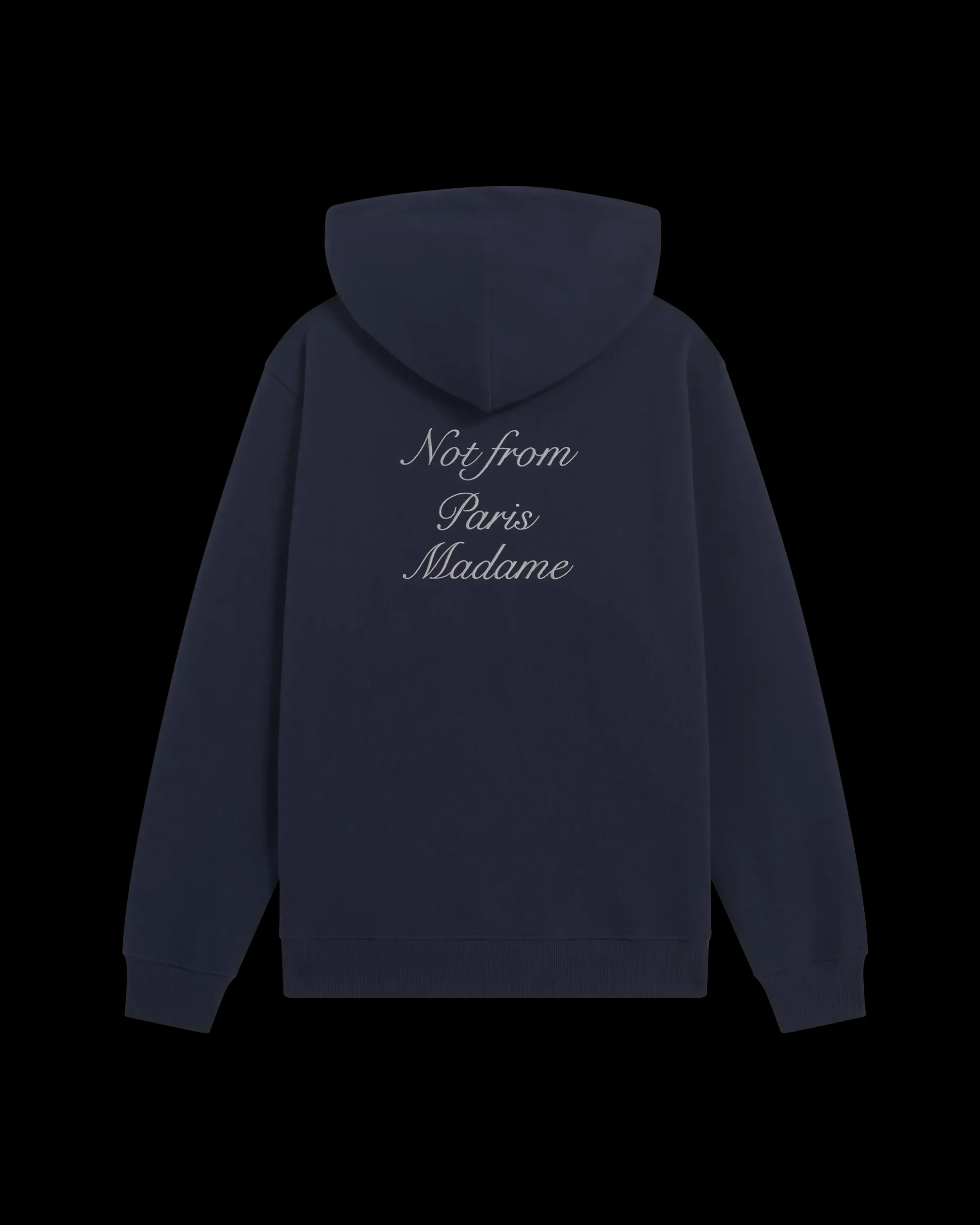 This navy 100% cotton French terry hoodie features the ‘Not from Paris Madame’ slogan embroidered calligraphy-style on the front and back. It has a drawstring hood with waxed tips, a kangaroo pocket and ribbed hem and cuffs.