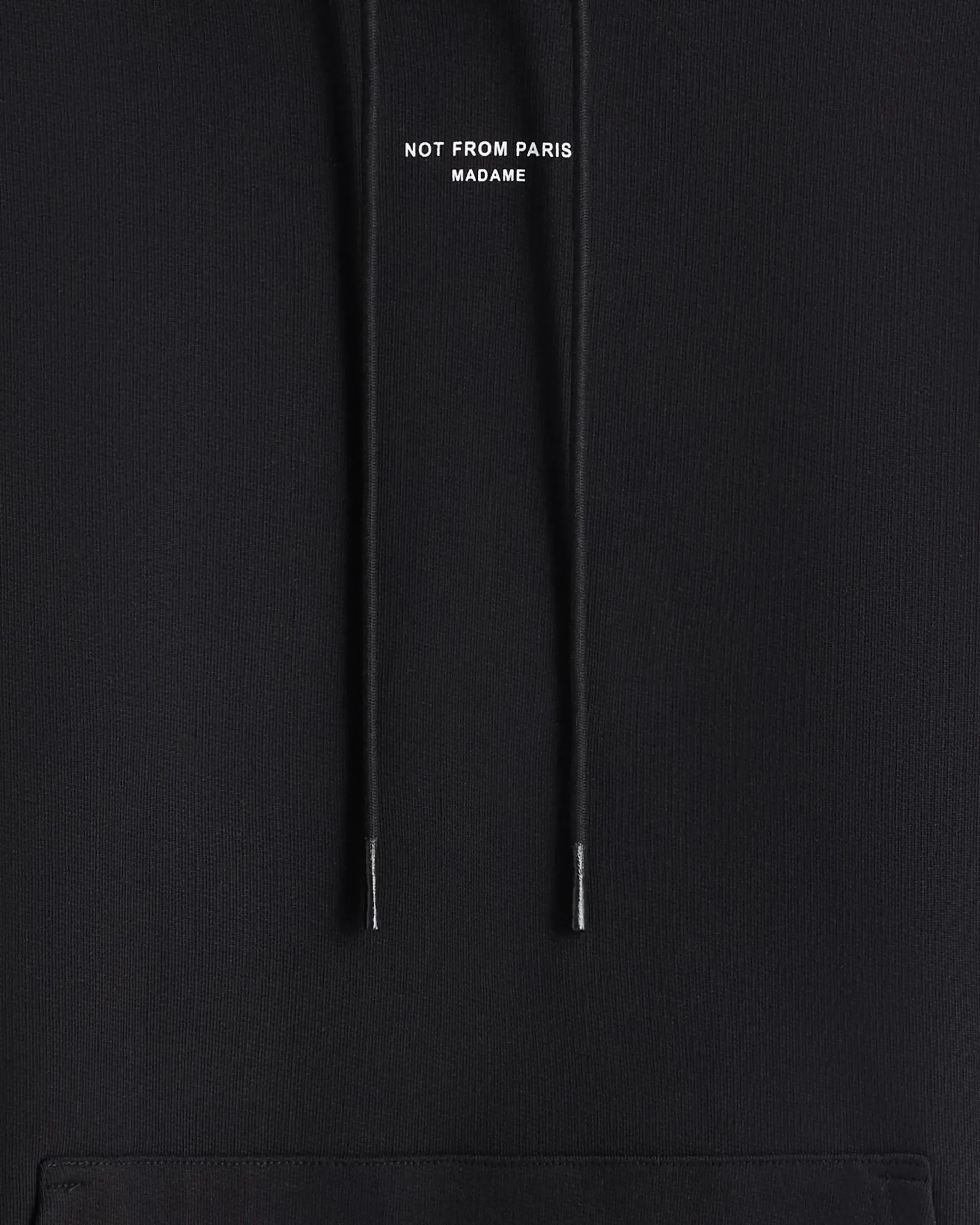 This black 100% cotton French terry hoodie is printed with the ‘Not From Paris Madame’ slogan on the front. It has a drawstring hood with waxed tips, a front kangaroo pocket and ribbed hem and cuffs.