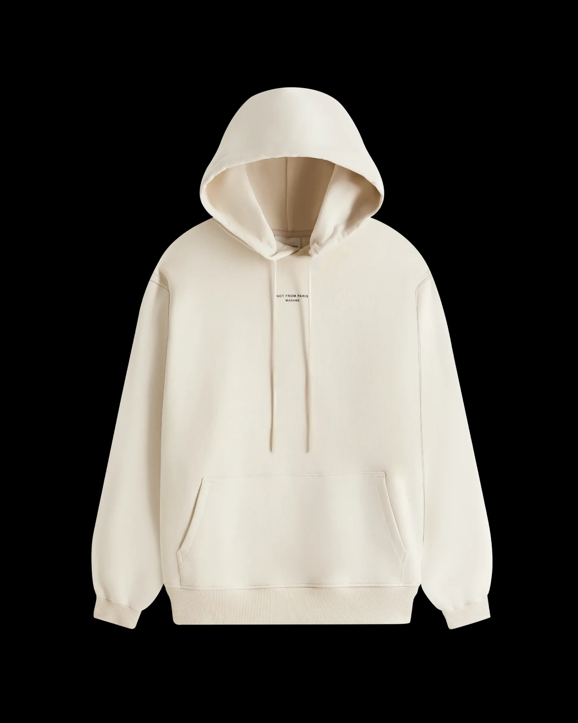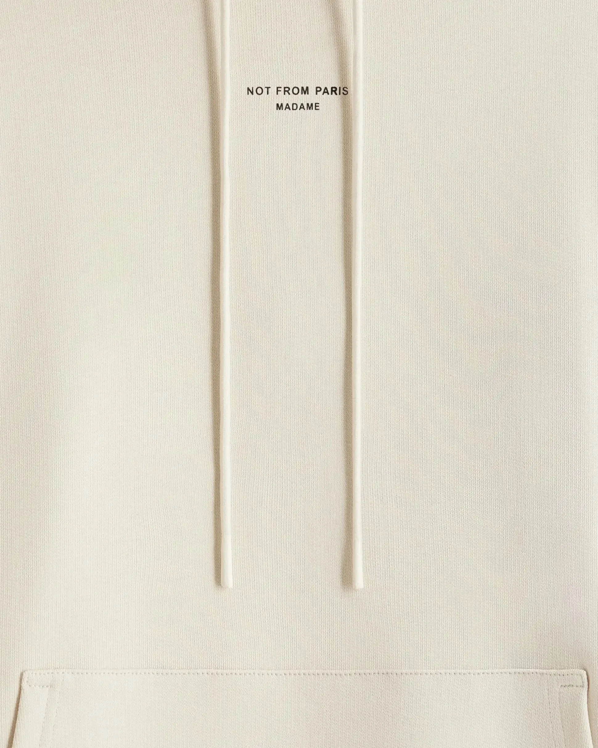 This beige 100% cotton French terry hoodie is printed with the ‘Not From Paris Madame’ slogan on the front. It has a drawstring hood with waxed tips, a front kangaroo pocket and ribbed hem and cuffs.• Front Slogan print• Ribbed hem and cuffs• French terry fabric• 100% Cotton – 430 GSMMade in Portugal