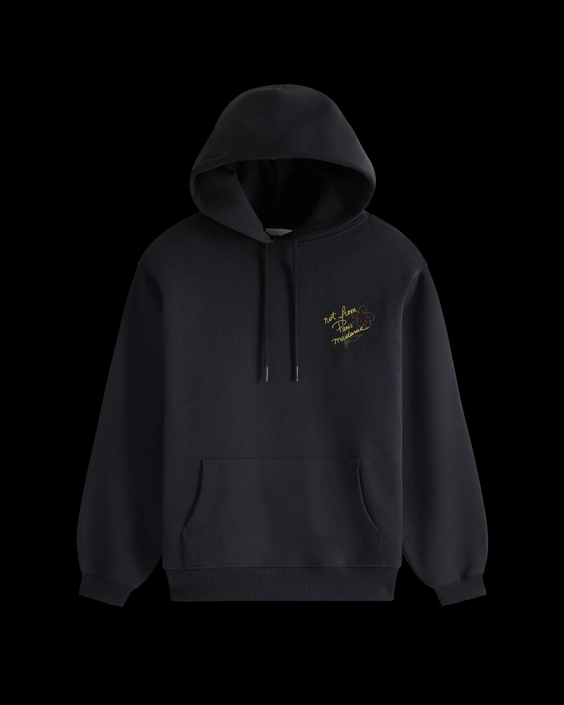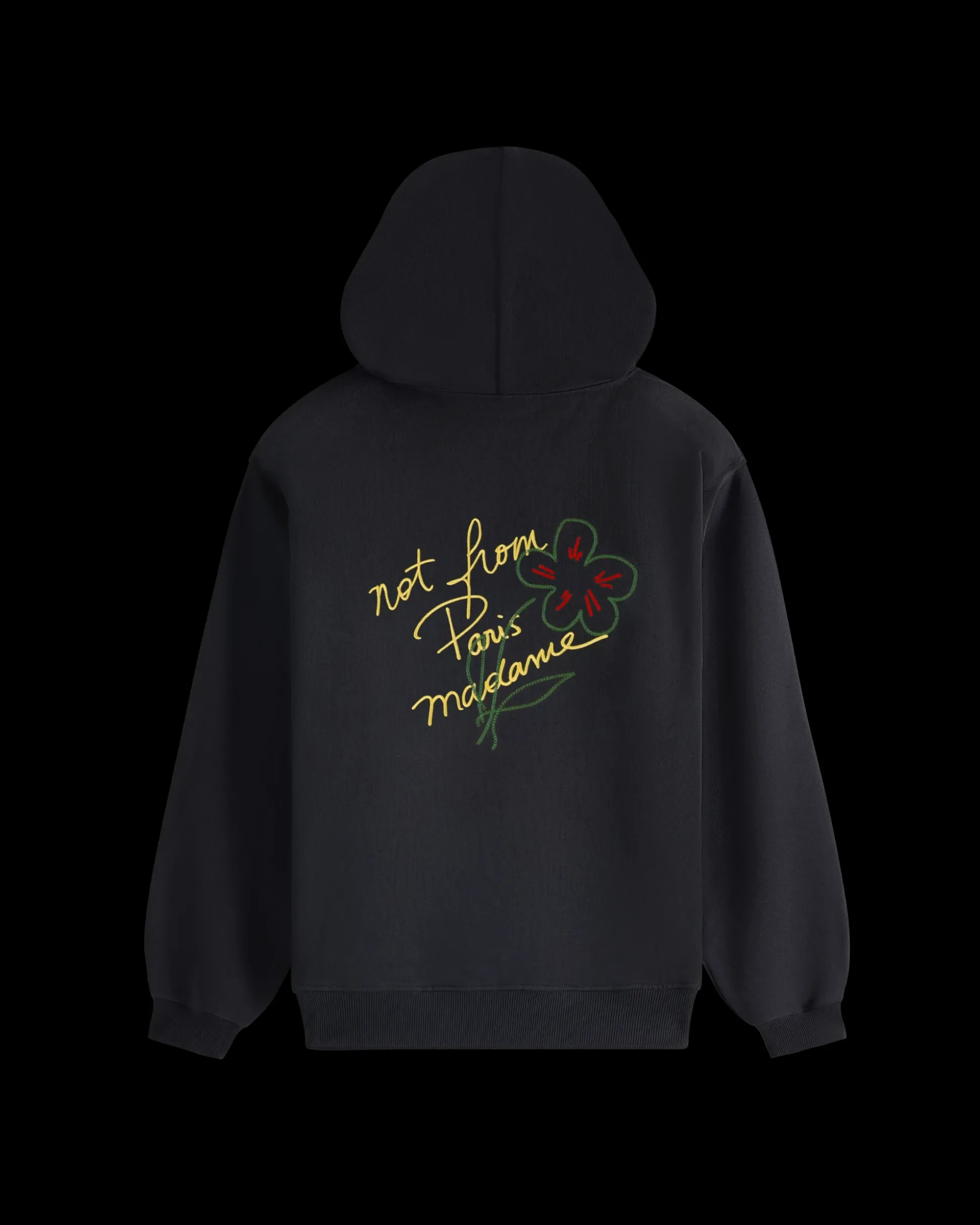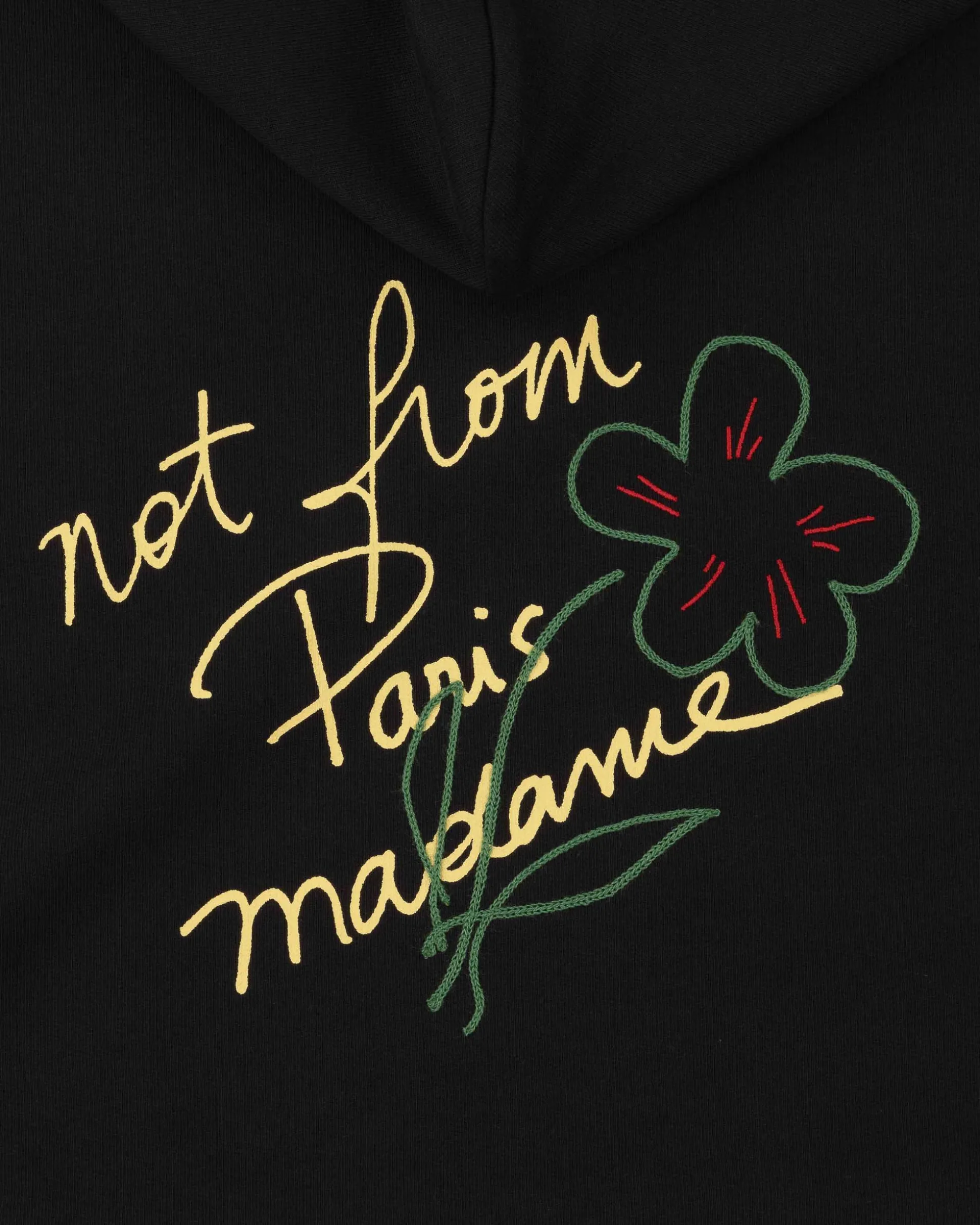 Handwritten note. This black 100% cotton French terry hoodie features a drawstring hood, a front kangaroo pocket and a ribbed hem and cuffs. It displays a ‘Not From Paris Madame’ print and embroidery on the front and back.