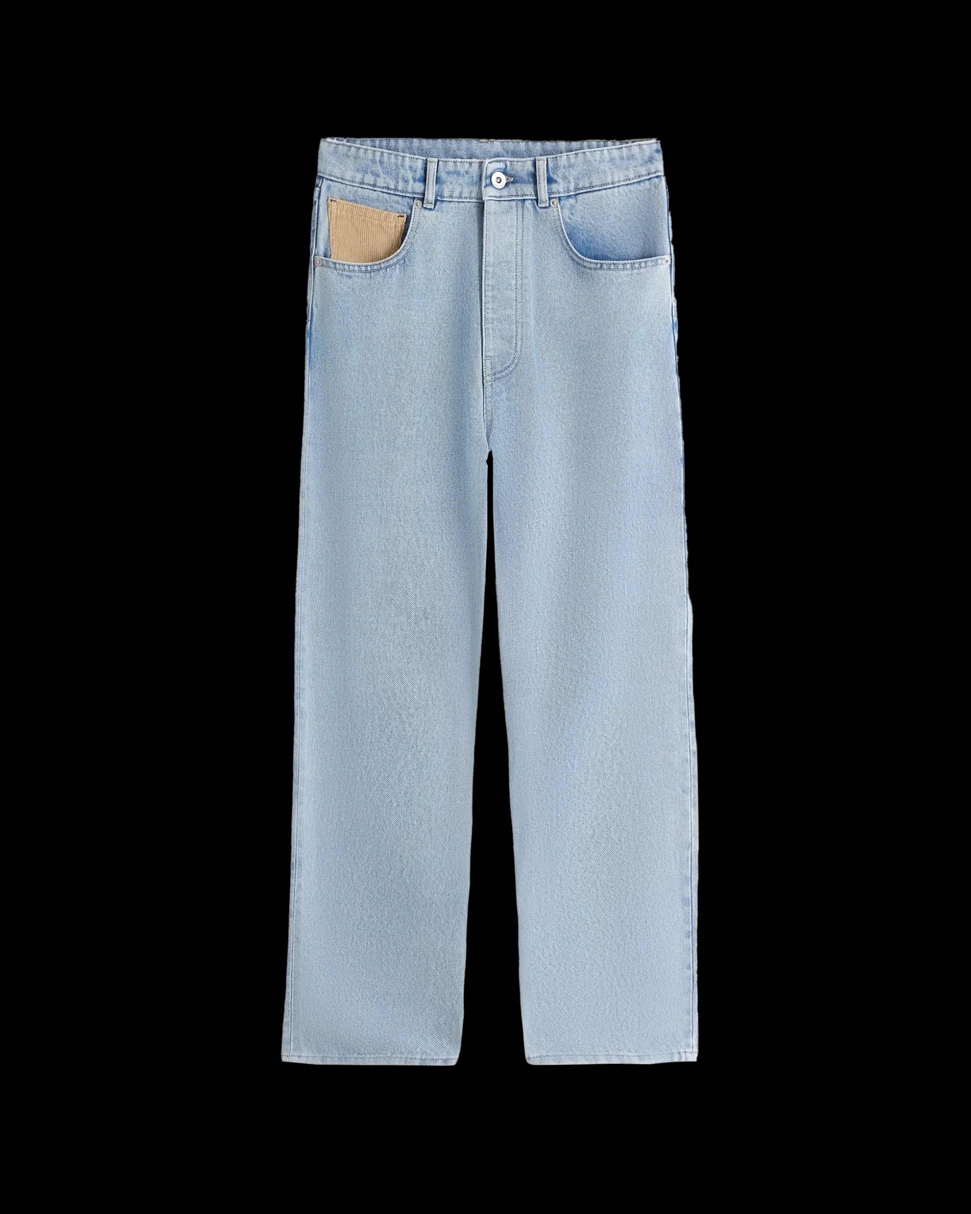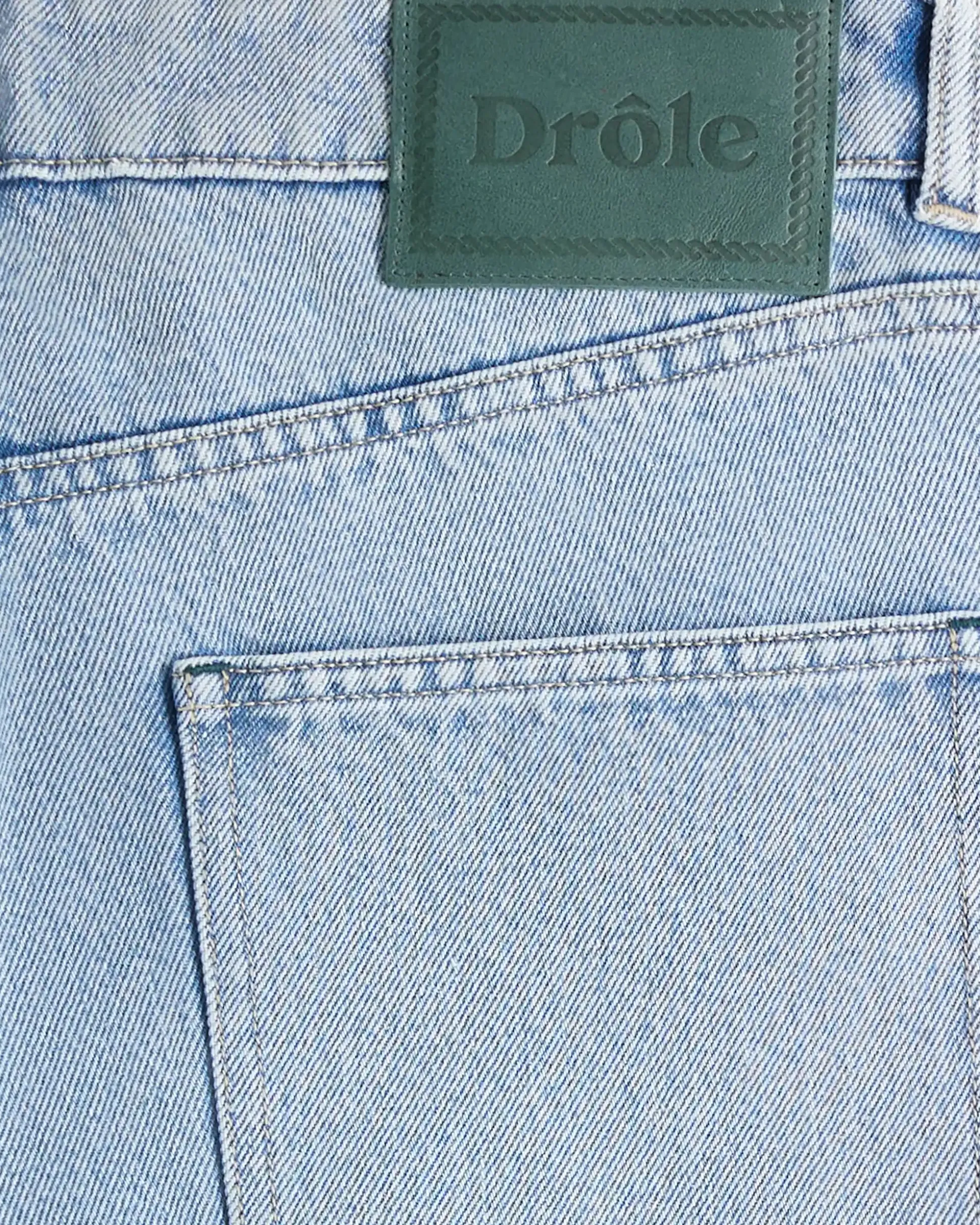 • 5-pocket jeans• Corduroy detail in the front right pocket• Engraved rivets and buttons• ‘Drôle’ embossed green leather strap