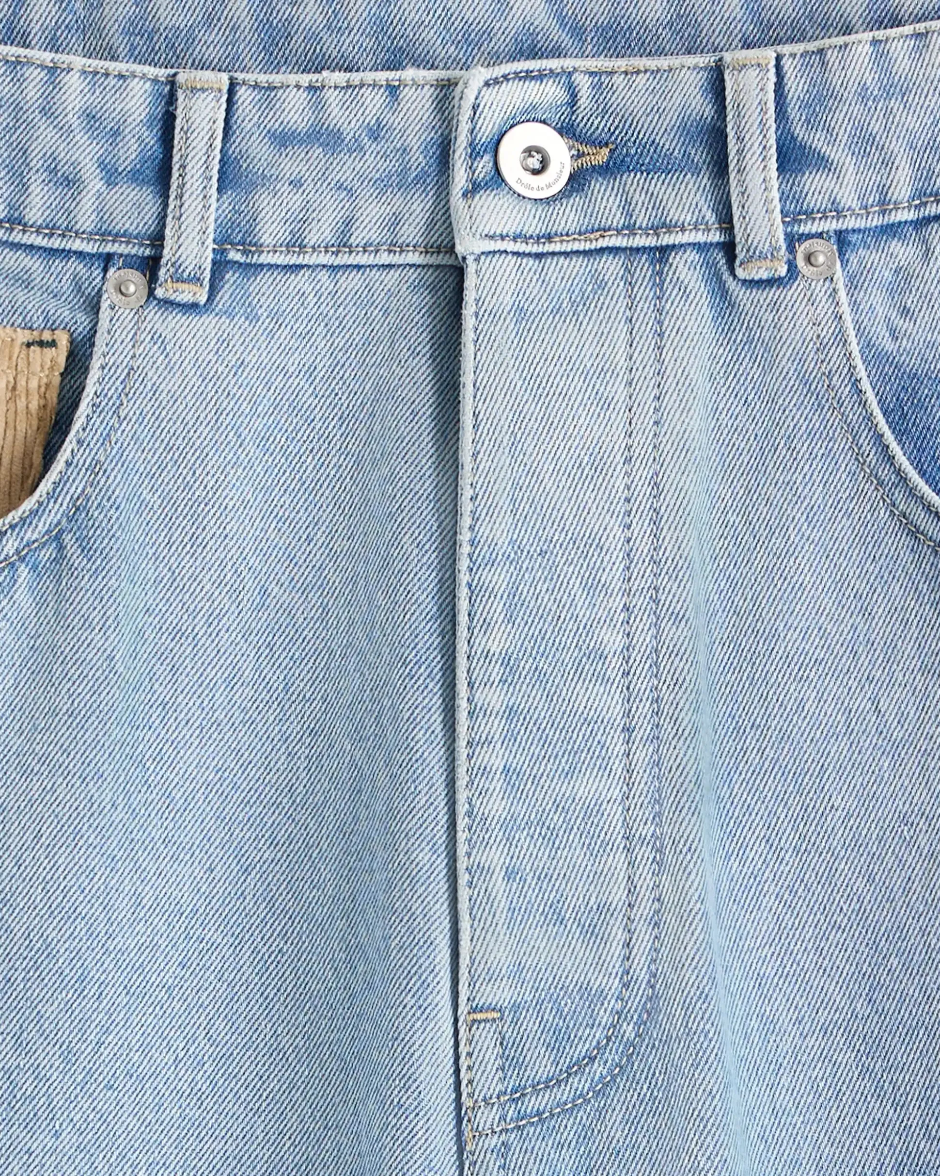 These light blue 100% cotton jeans have five pockets, engraved rivets and buttons and a green embossed leather trim. They are decorated with corduroy details in the front right pocket.