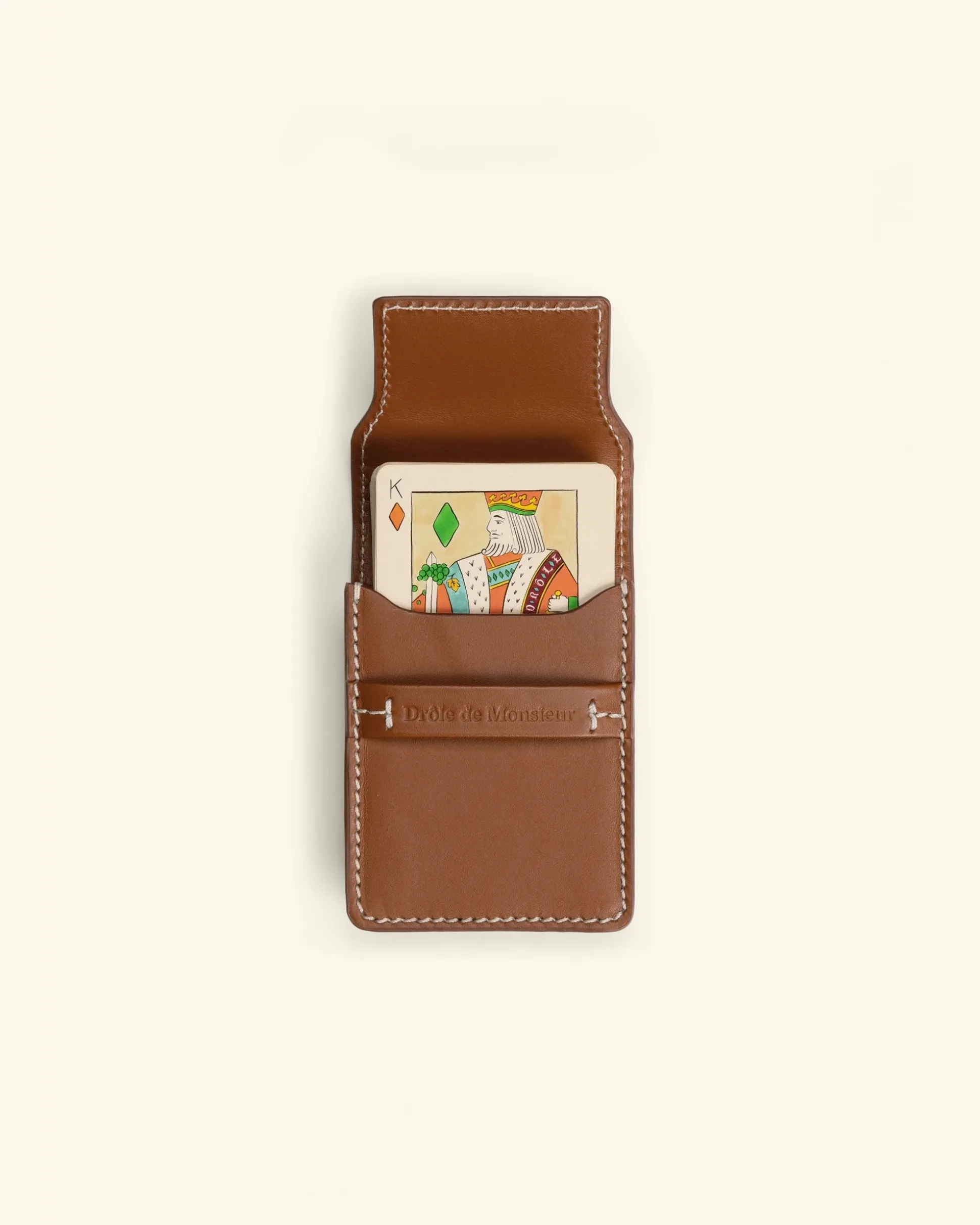 • Card case in smooth leather, embossed ‘Drôle de Monsieur’• Flap closure• 54-card Poker pack • Hand-drawn and printed• Rounded corners • 350g card with four-colour printing on front and back• Gold edge dyeing