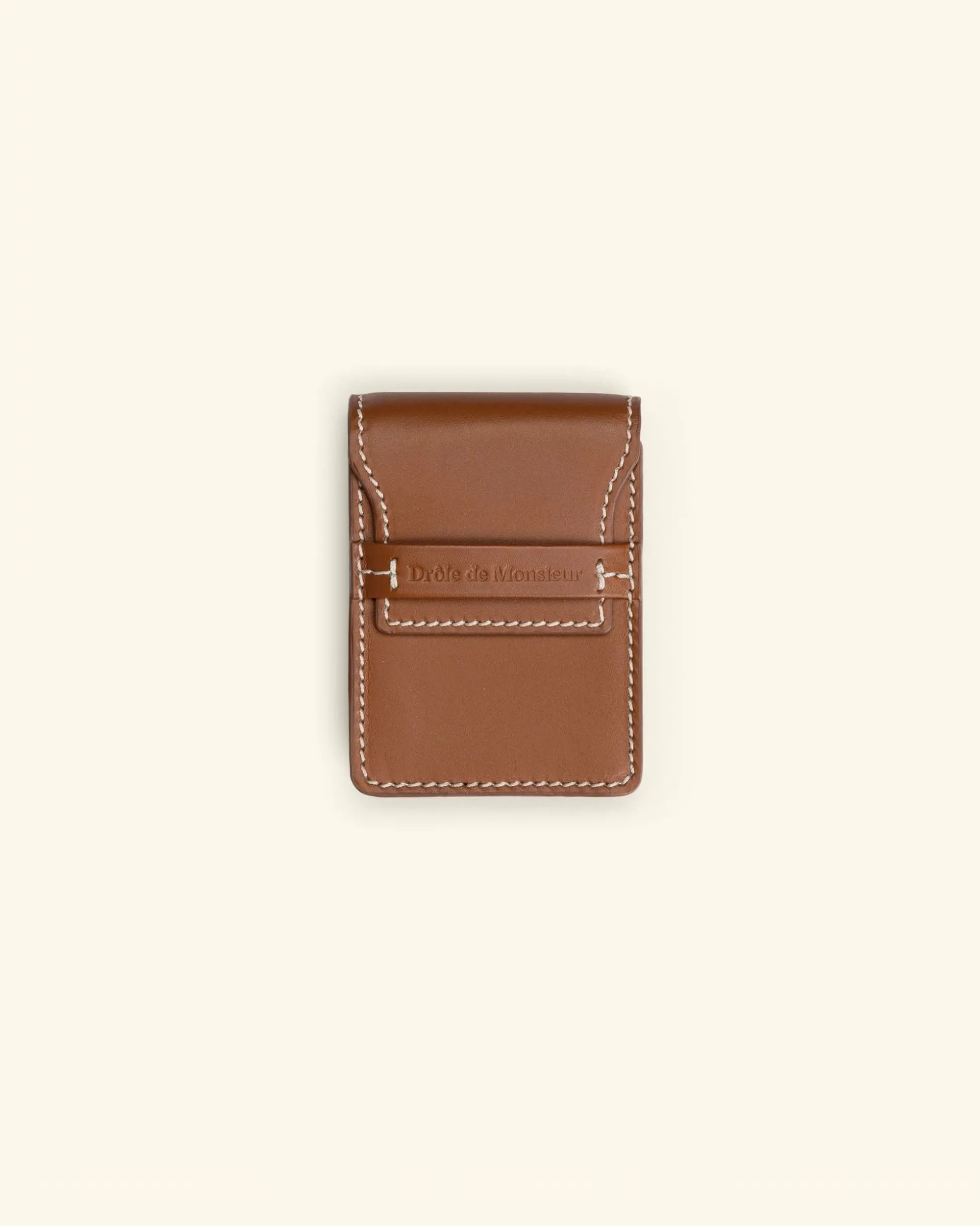 Play art. This pack of 54 playing cards comes in a smooth brown leather card case with a flap closure and embossed “Drôle de Monsieur” logo. The cards are all hand-drawn, have rounded corners and a golden edge.