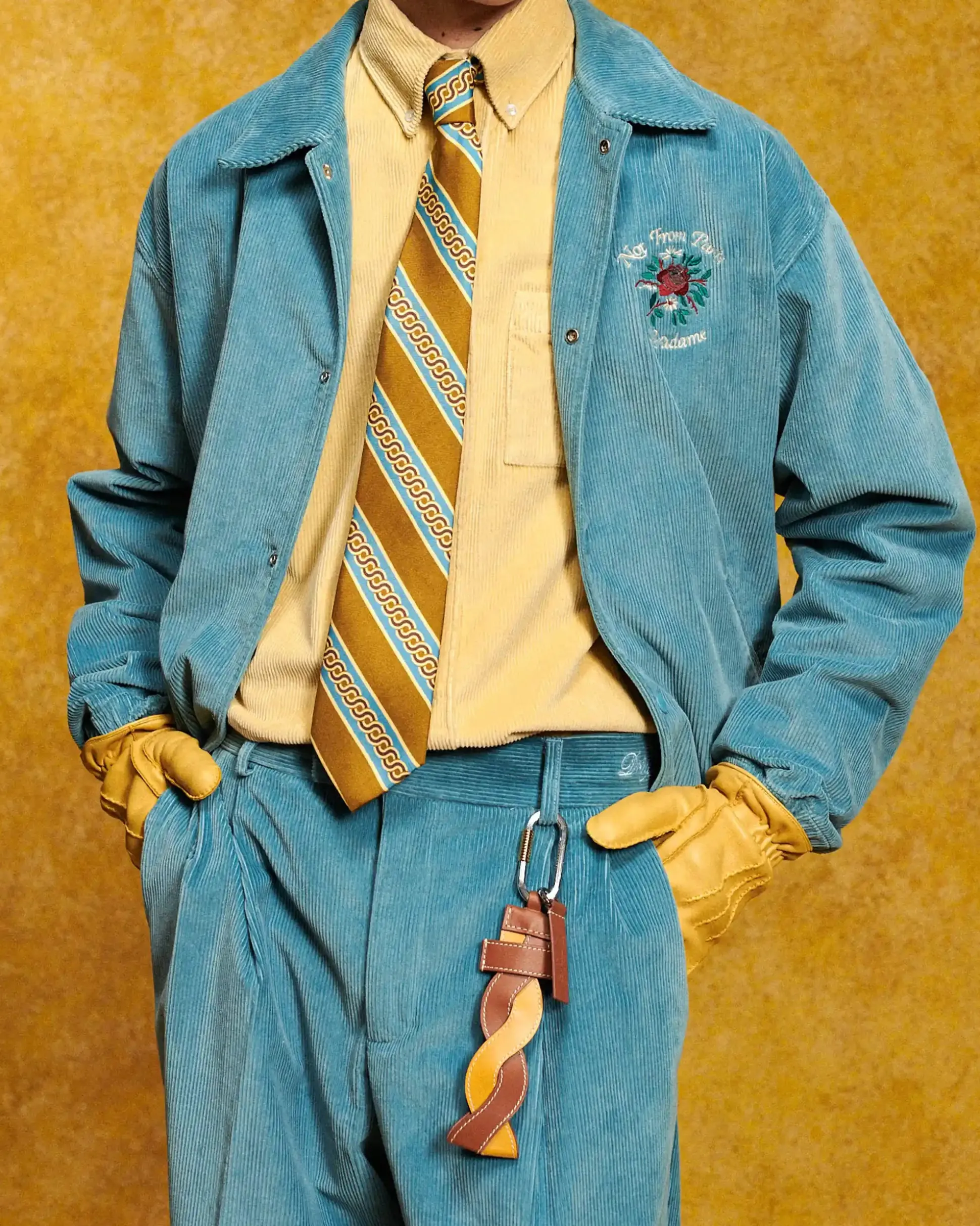 The signature braid. This yellow and orange keyring is made of stitched smooth leather with a ribbed snap hook.