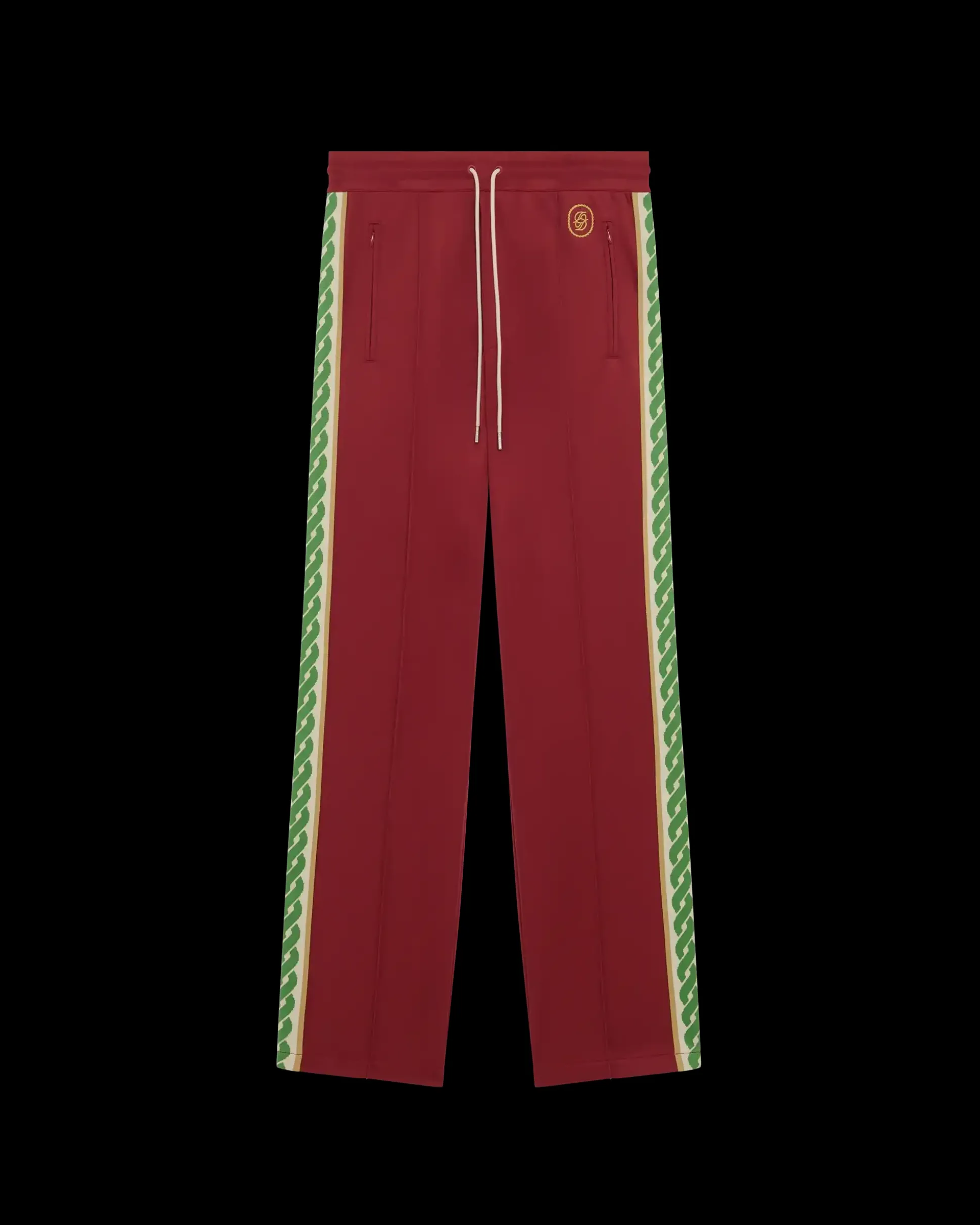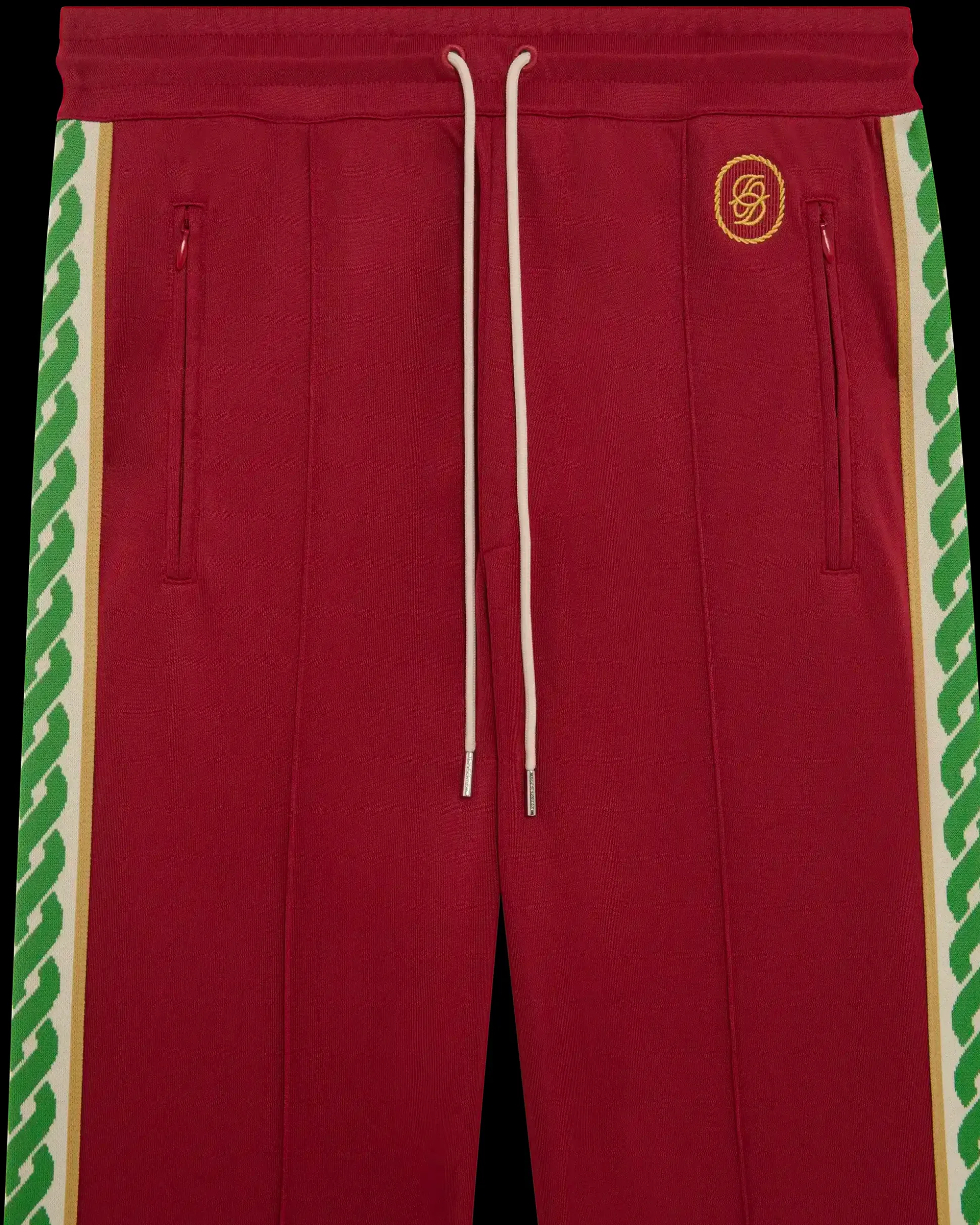 These dark red double interlock sweatpants feature a mirrored ‘D’ embroidery and a braided side stripe. They have an elasticated waist, zippered pockets, one back patch pocket and a drawstring with metal tips.