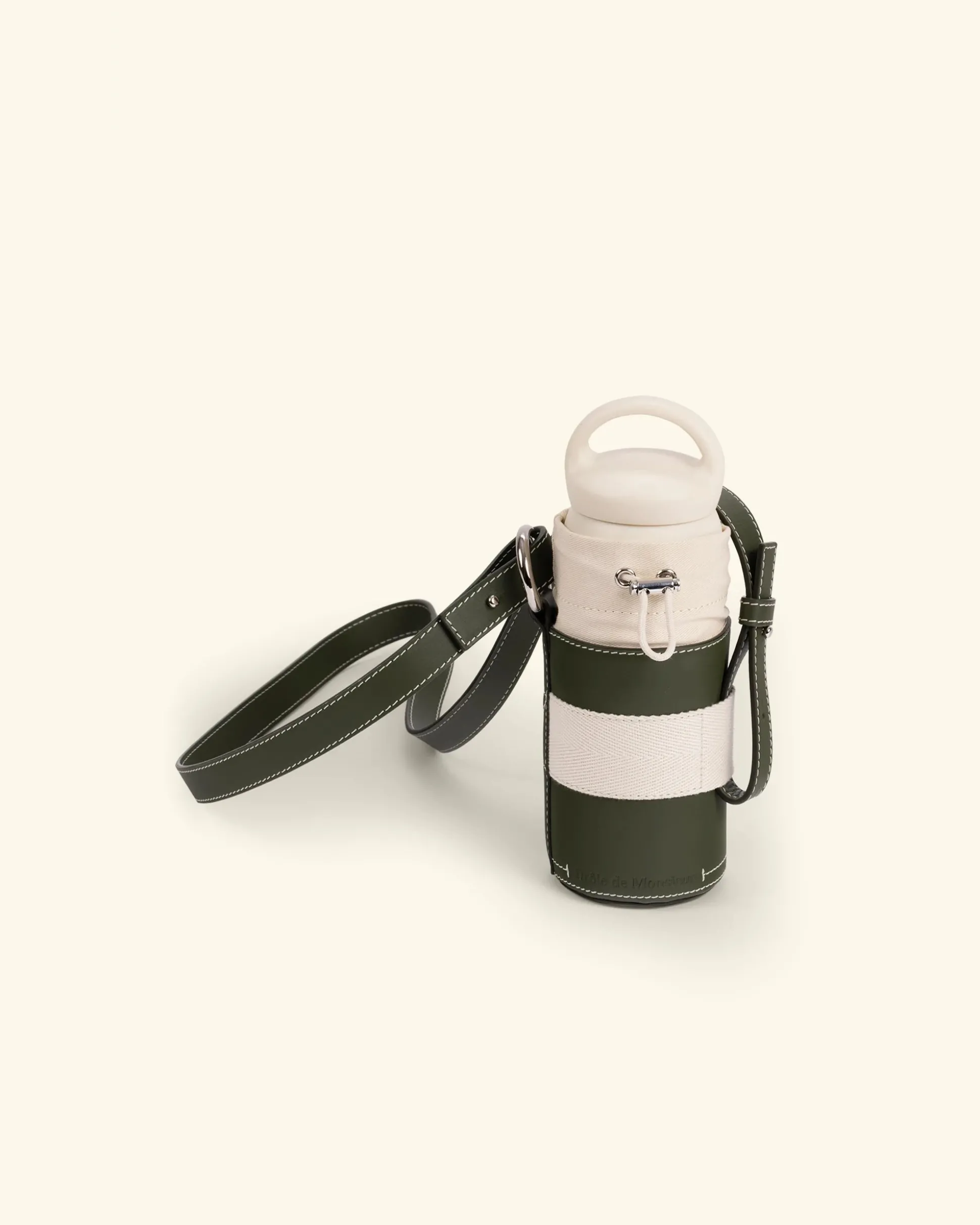 A new essential. This khaki cotton and leather waterbottle holder features a drawstring closure with a metal stopper as well as an adjustable shoulder strap.