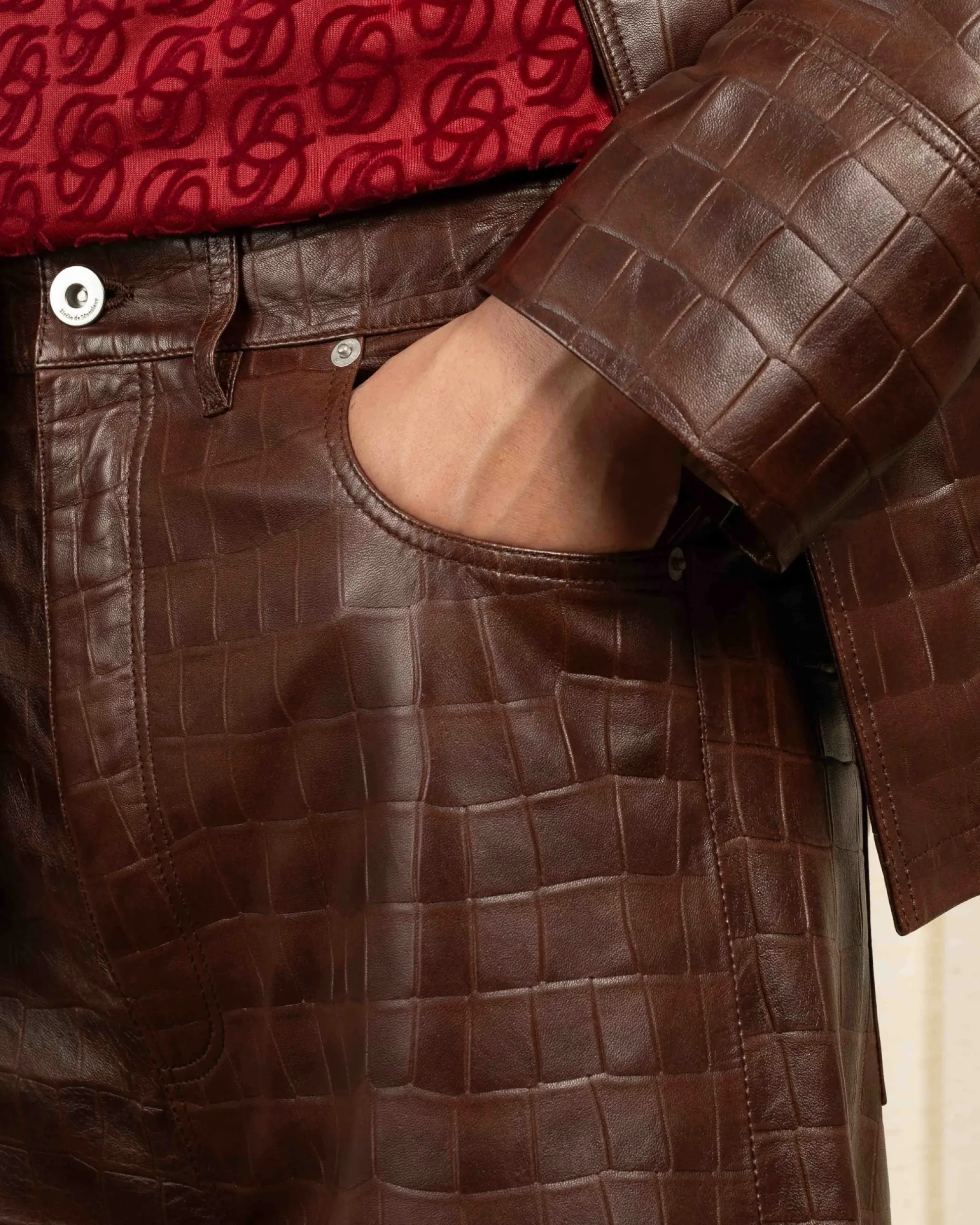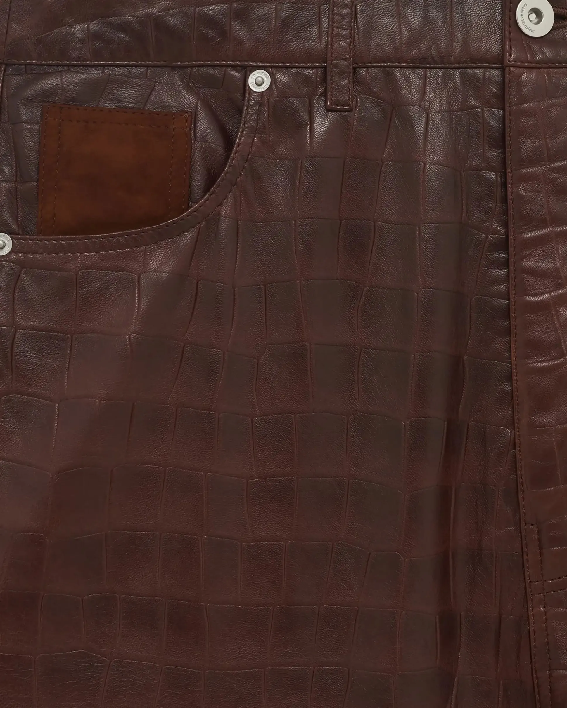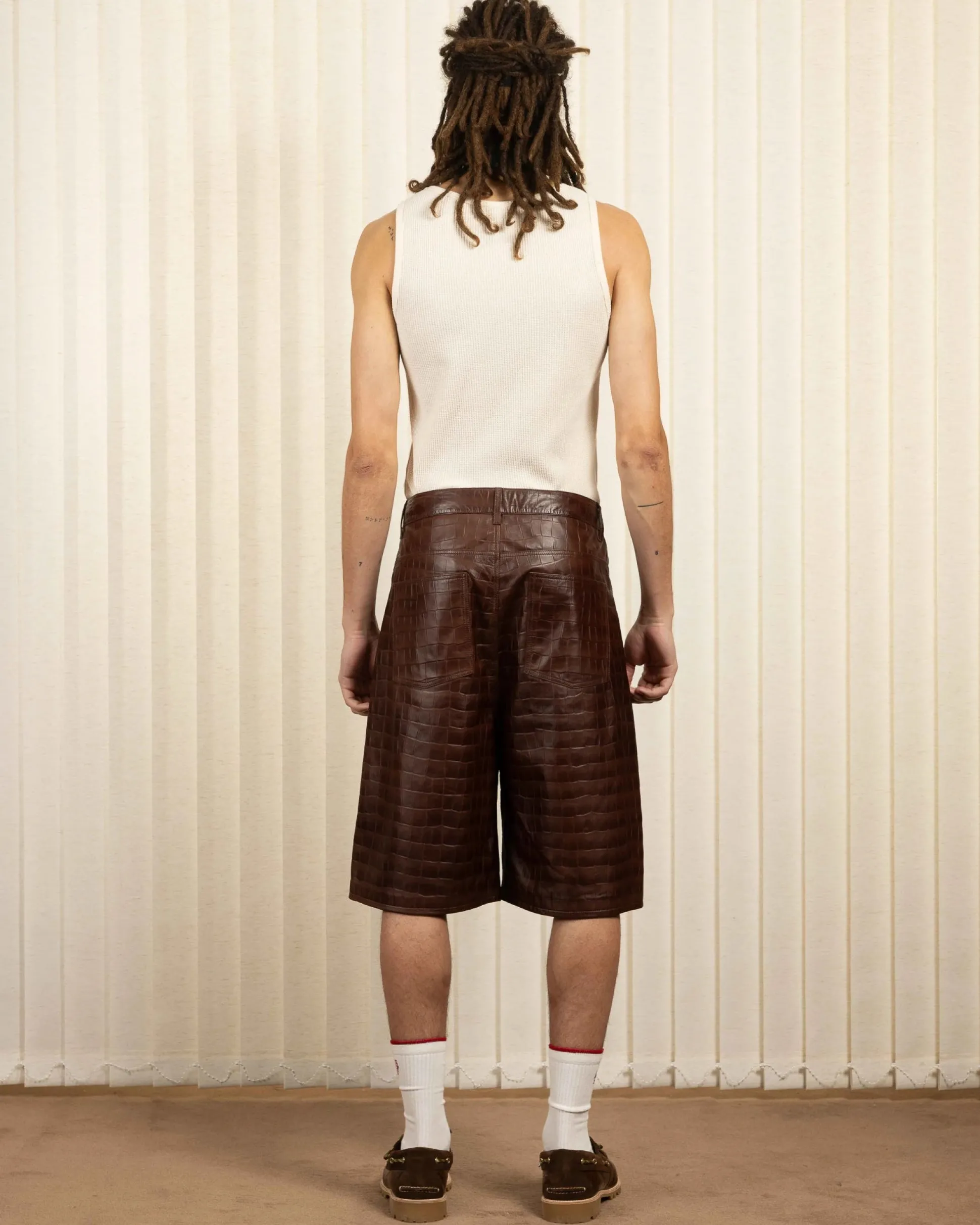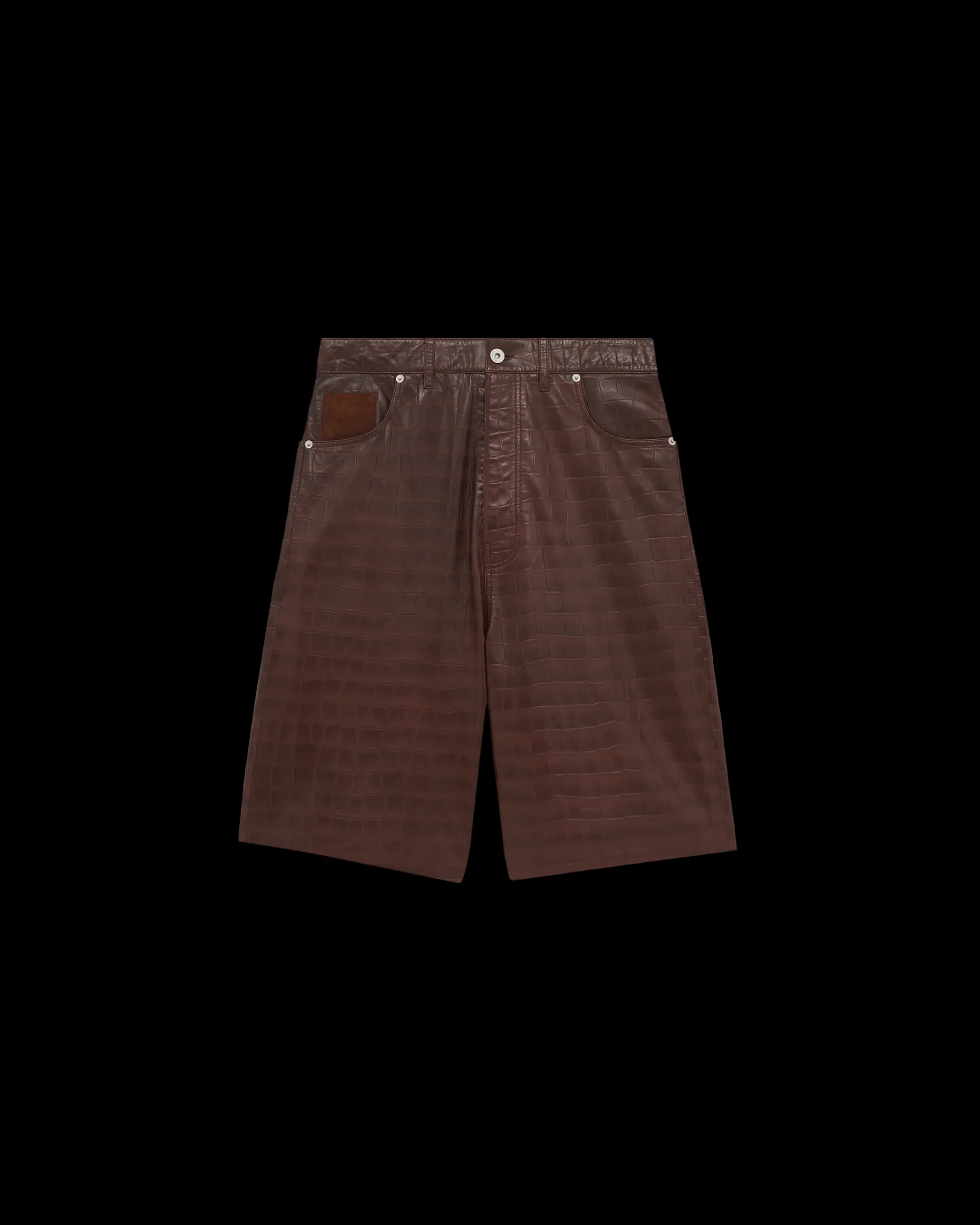 These brown 100% leather shorts have a regular waist, a loose fit and a slightly flared leg. They feature five pockets, engraved rivets, a suede ticket pocket, an engraved denim button and a zip closure.• 5 pocket croc-style leather shorts• Regular waist• Loose fit• Slightly flared leg• Engraved rivets on the front• Suede ticket pocket• Engraved denim button• Zip closure• 100% leatherColor: Brown Made in Europe