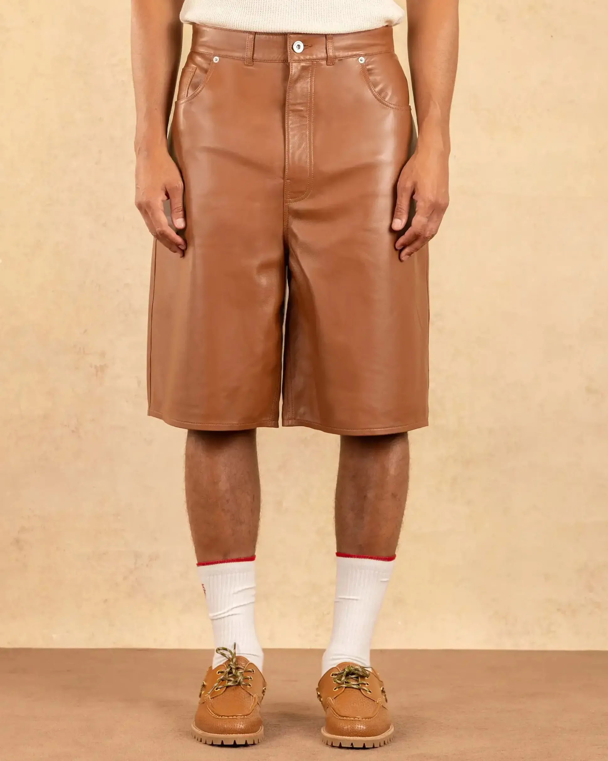 These brown 5-pocket leather shorts have a slightly flared fit. They feature engraved rivets on the front pockets, one engraved denim button and a zipper closure.