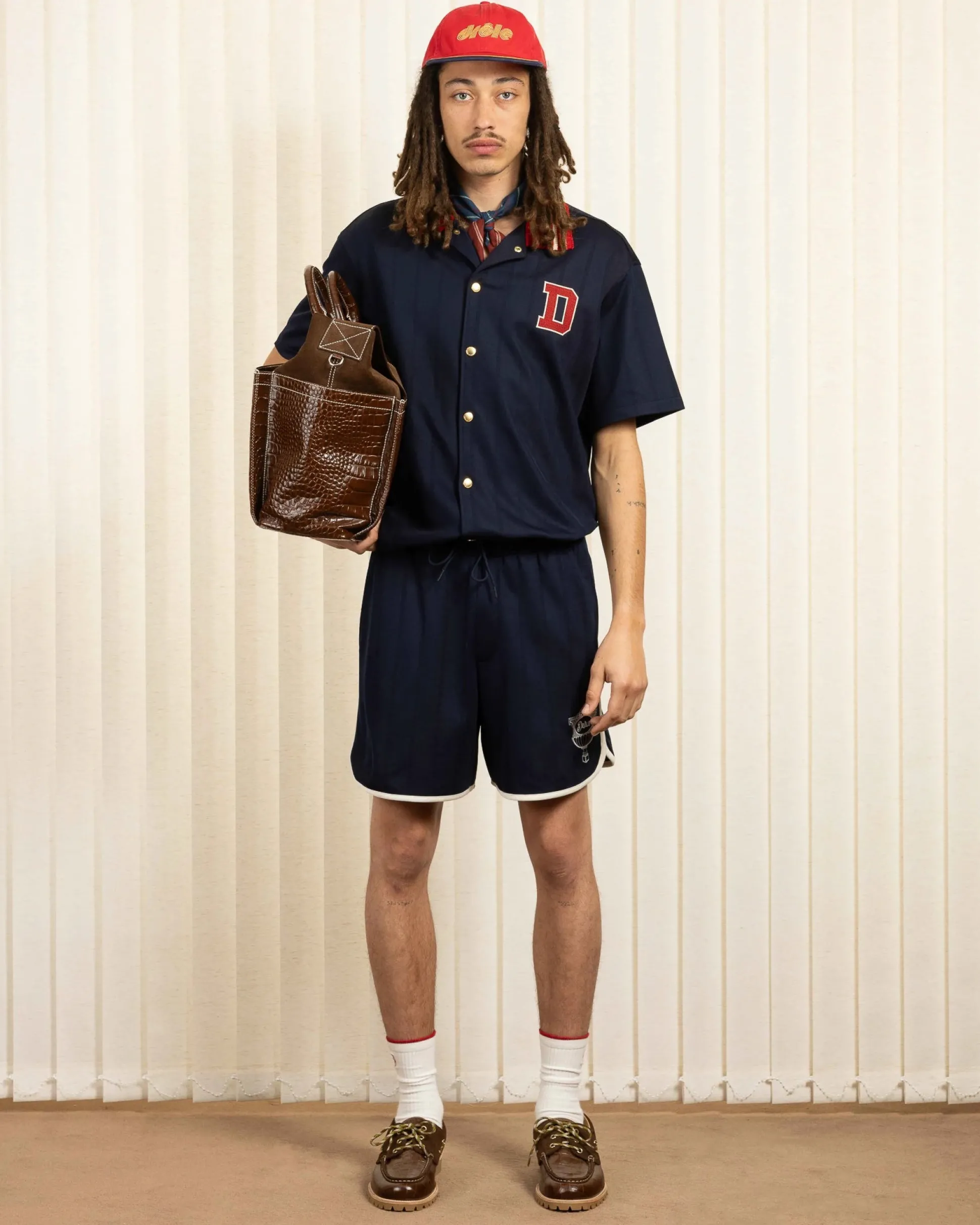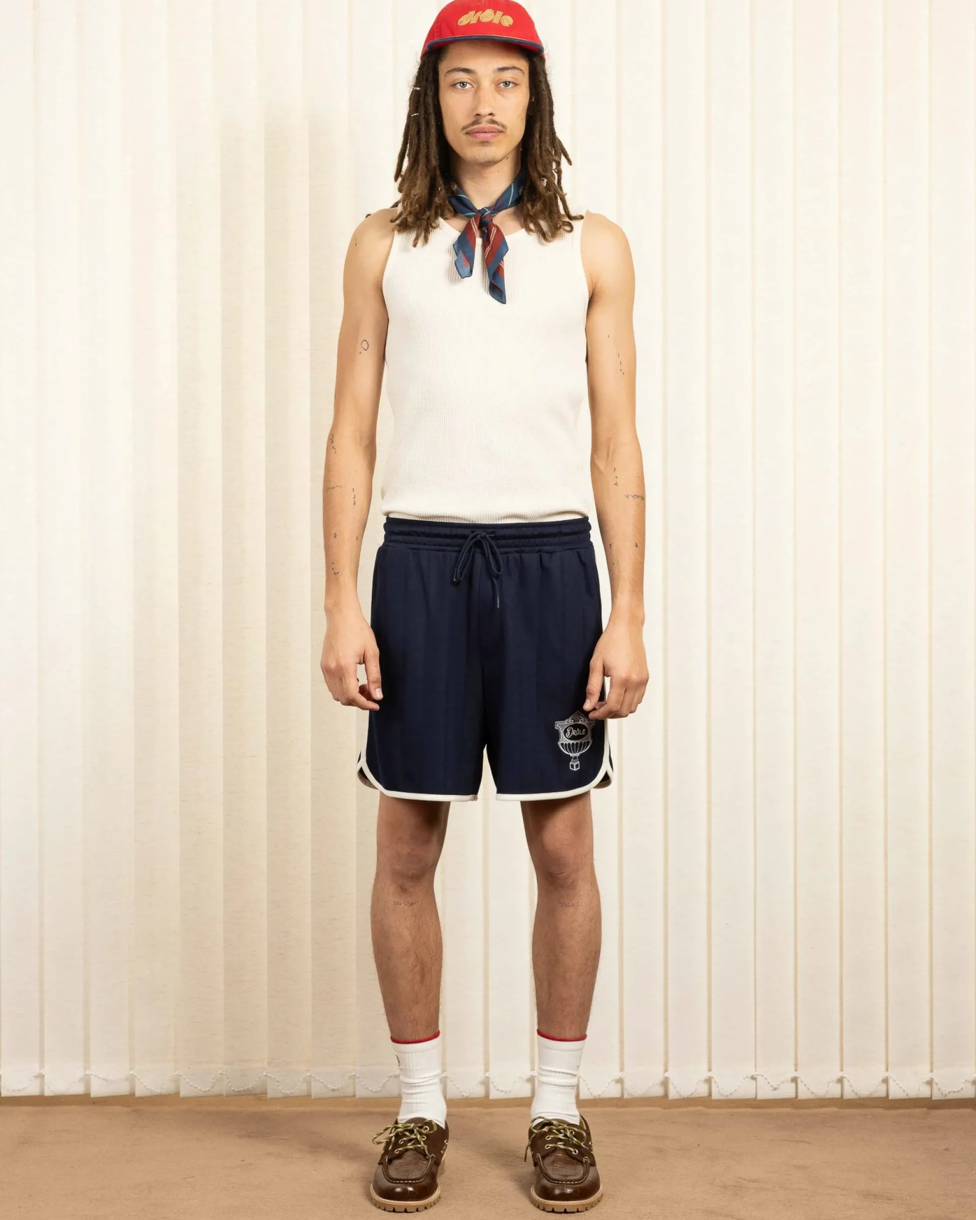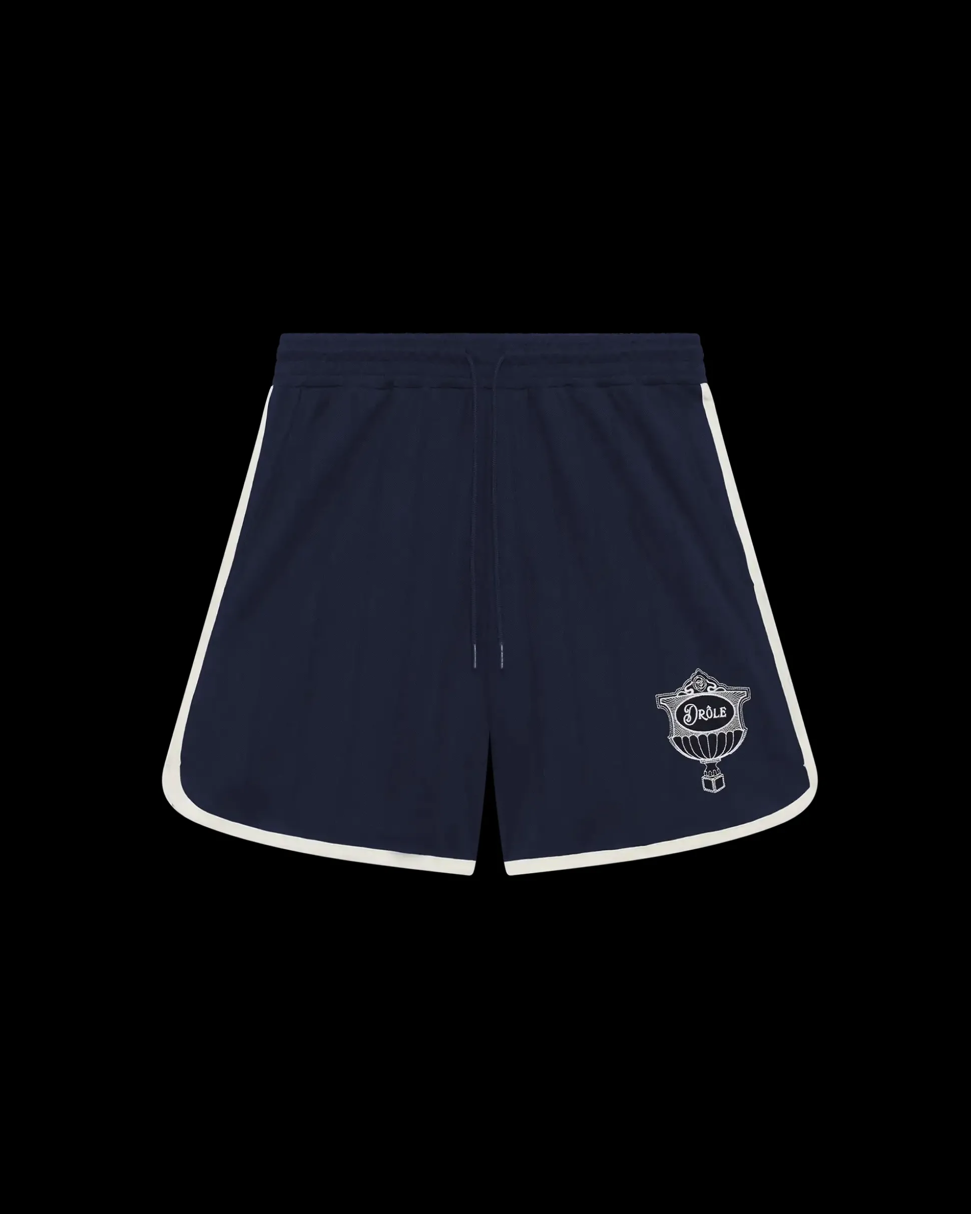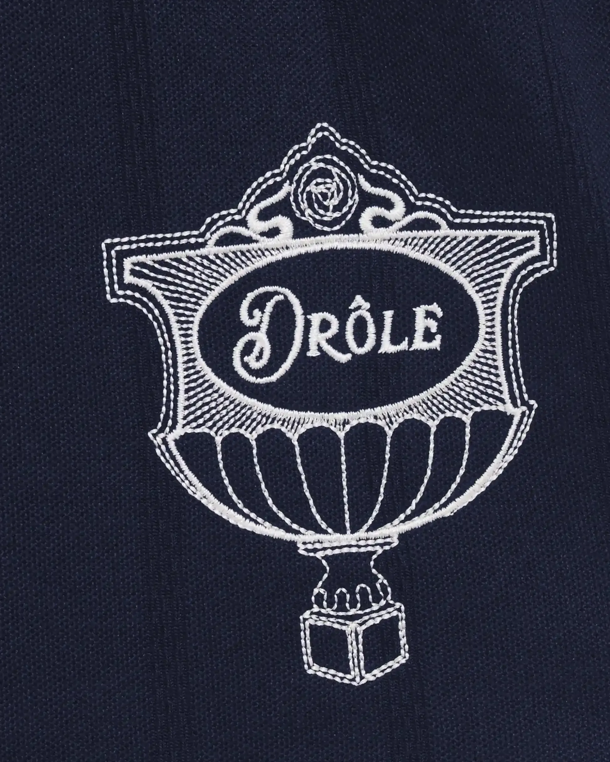 These navy cotton blend mesh shorts feature a Drôle Cup embroidery on the front. They have an elasticated waist with drawstring, a jersey lining and one piped pocket on the back.• Mesh shorts• Drôle Cup embroidery• Elasticated waist with drawstring• Jersey lining• 1 piped pocket on the back• 52% polyester and 48% cottonColor: NavyMade in Portugal
