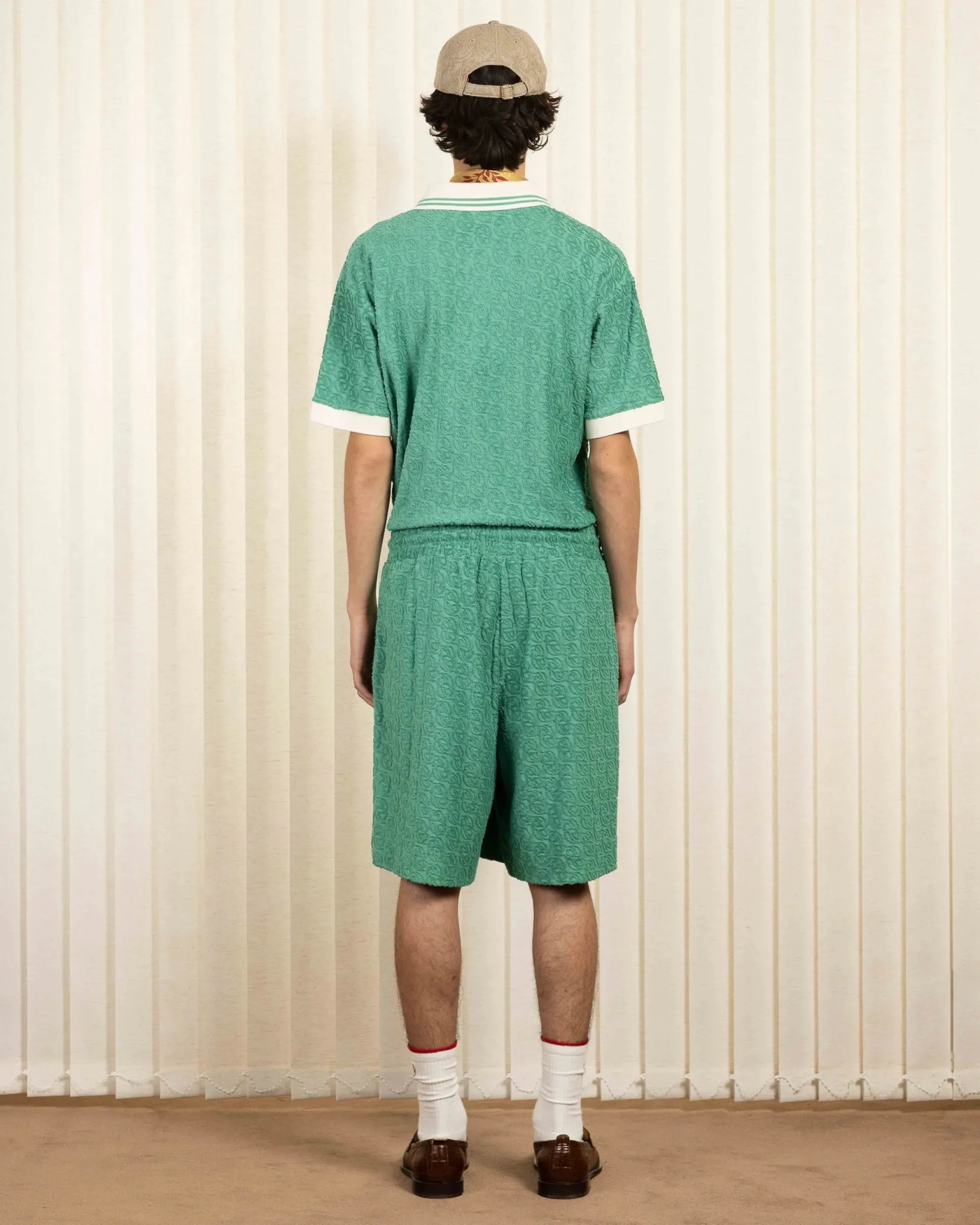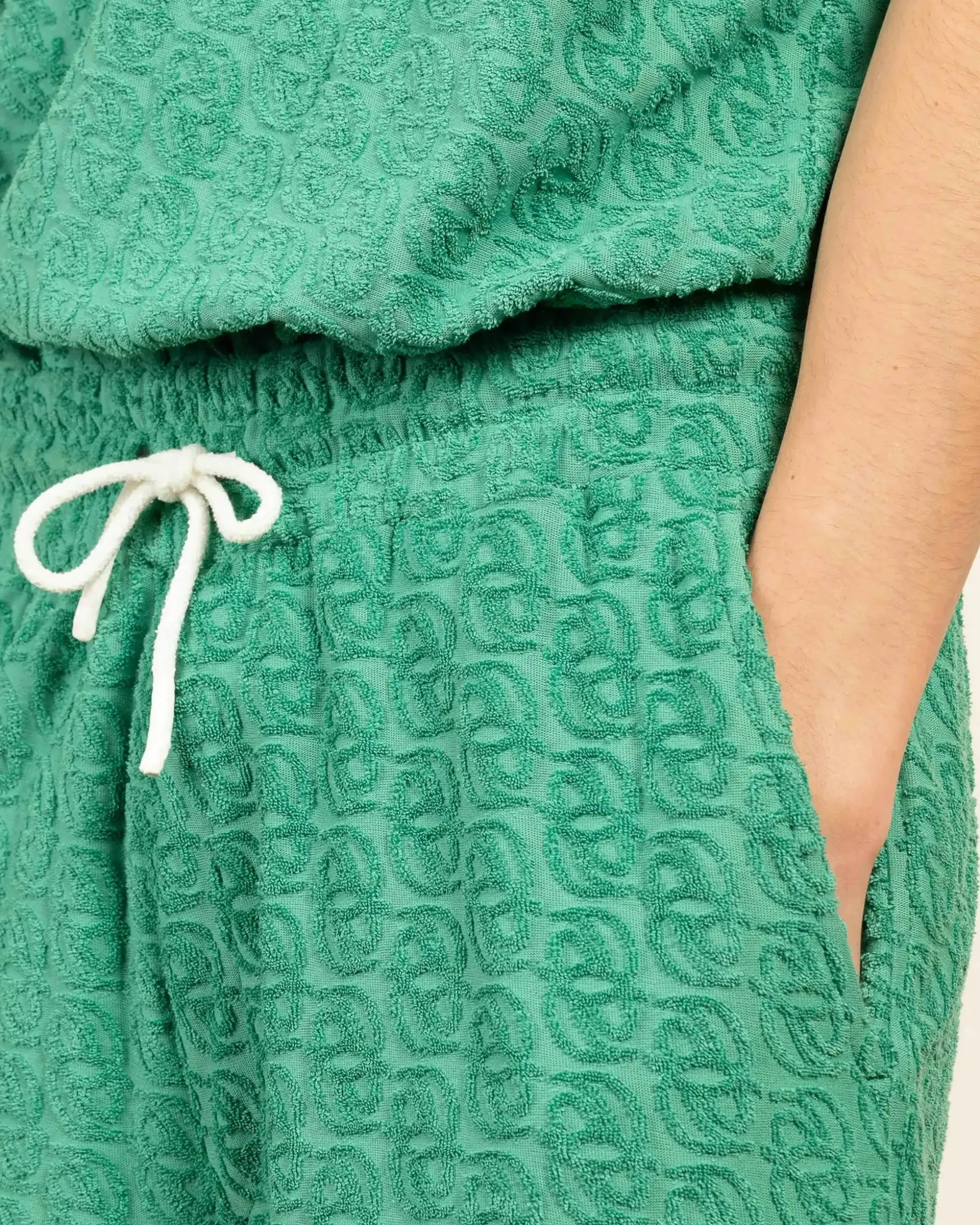 These 100% cotton terry cloth shorts feature a ‘D’ mirror jacquard. They have an elasticated drawstring waist and two Italian pockets.• Terry cloth shorts• ‘D’ mirror jacquard• Elasticated drawstring waist• 2 Italian pockets • 100% cottonColor: EmeraldMade in Portugal