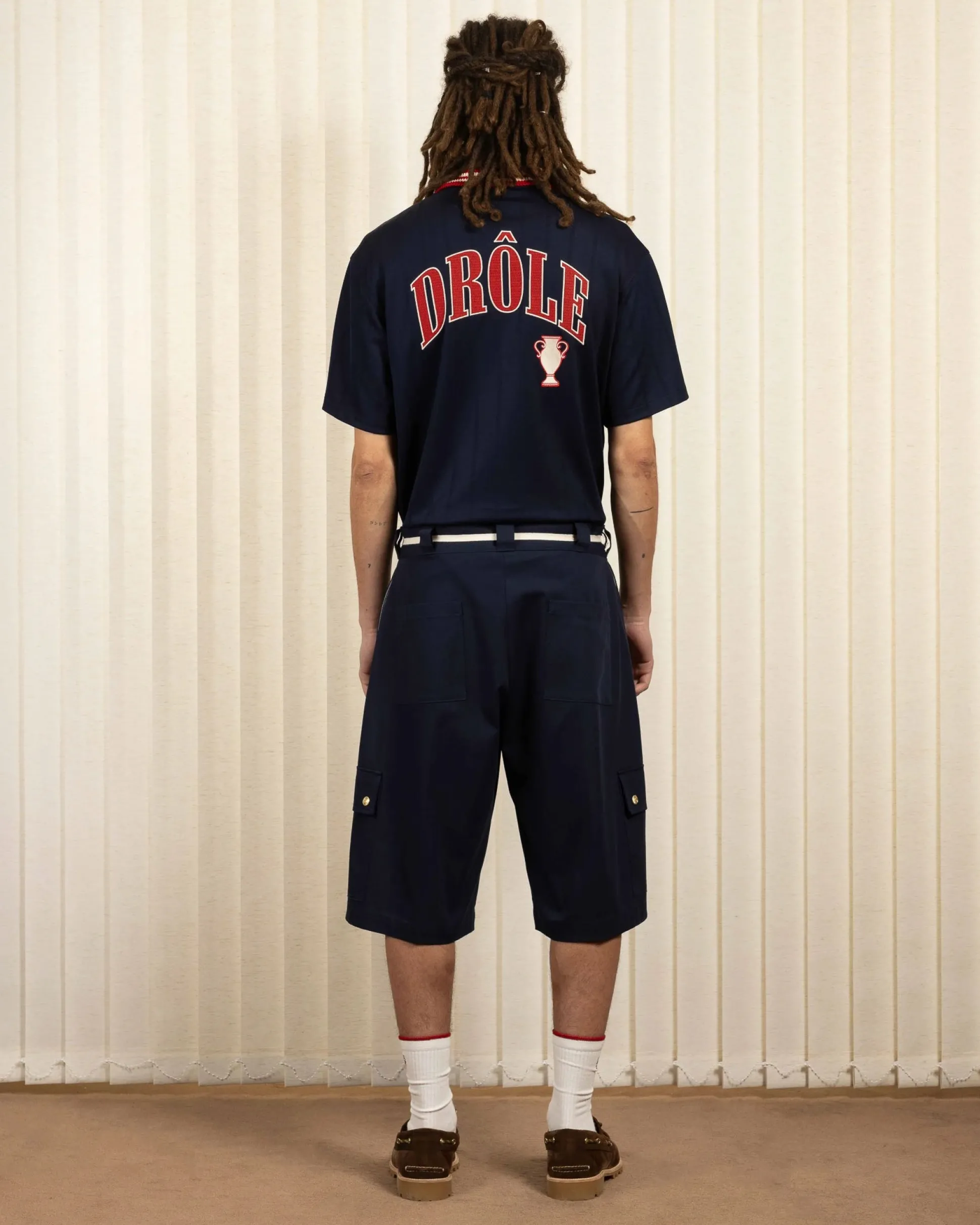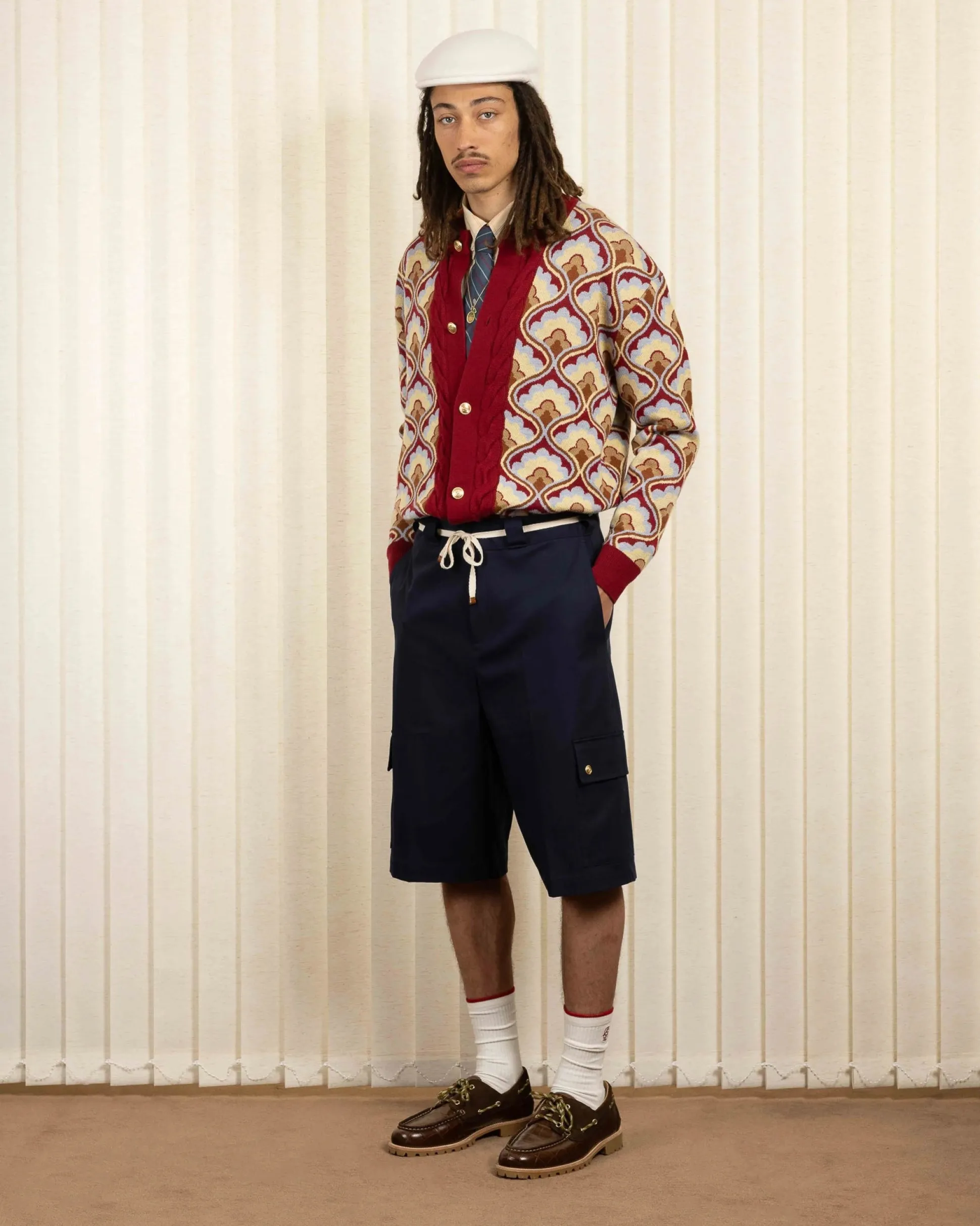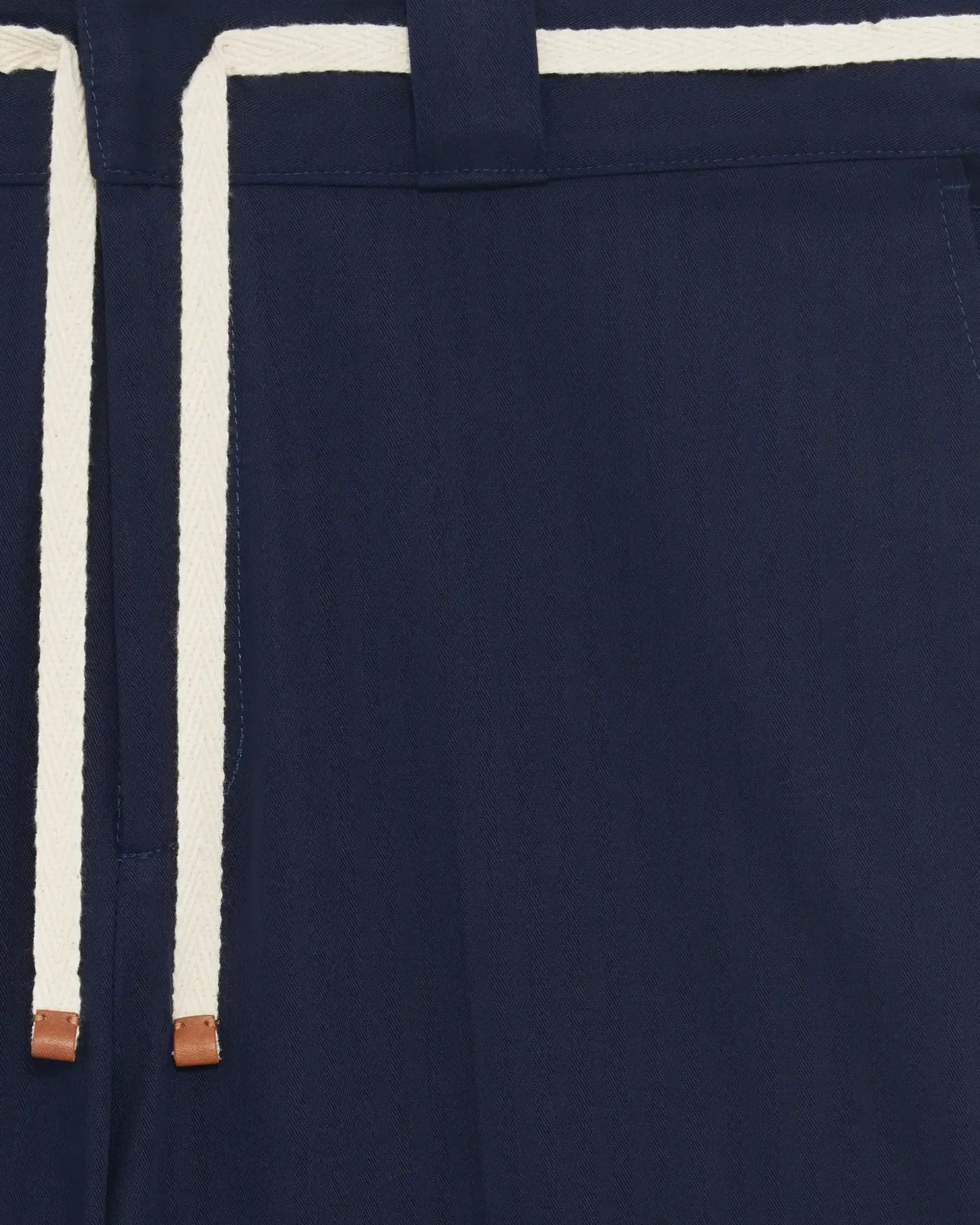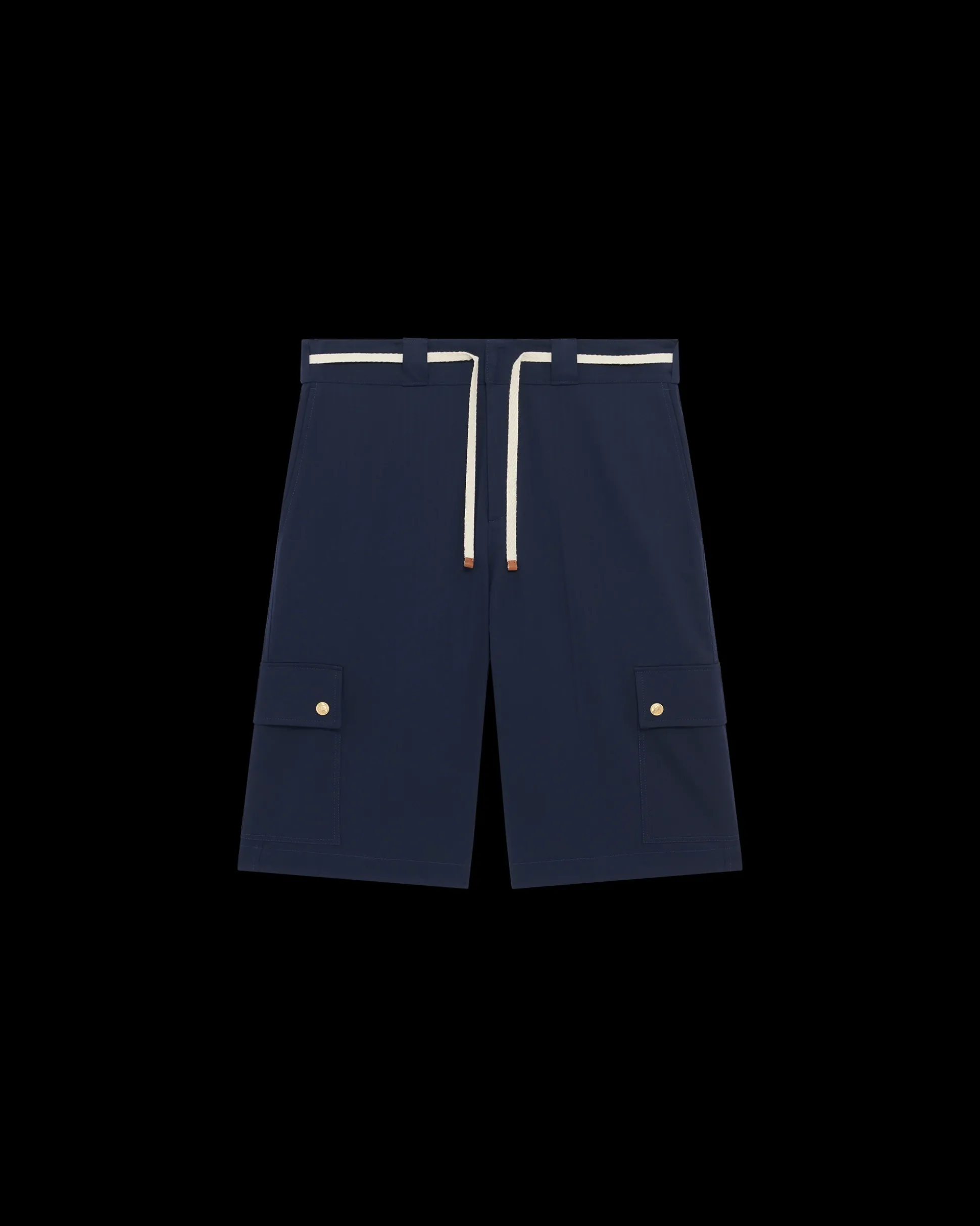 These navy cotton blend chevron shorts have a loose fit, a removable cotton belt with leather tips, two patch pockets with snap buttons and flaps on the side, two patch pockets on the back, two Italian pockets and a zip and hook closure.• Chevron shorts• Loose fit• Removable cotton belt with leather tips• 2 patch pockets with snap buttons and flaps on the side• 2 patch pockets on the back• 2 Italian pockets• Zip and hook closure• 98% cotton and 2% elasthaneColor: NavyMade in Europe