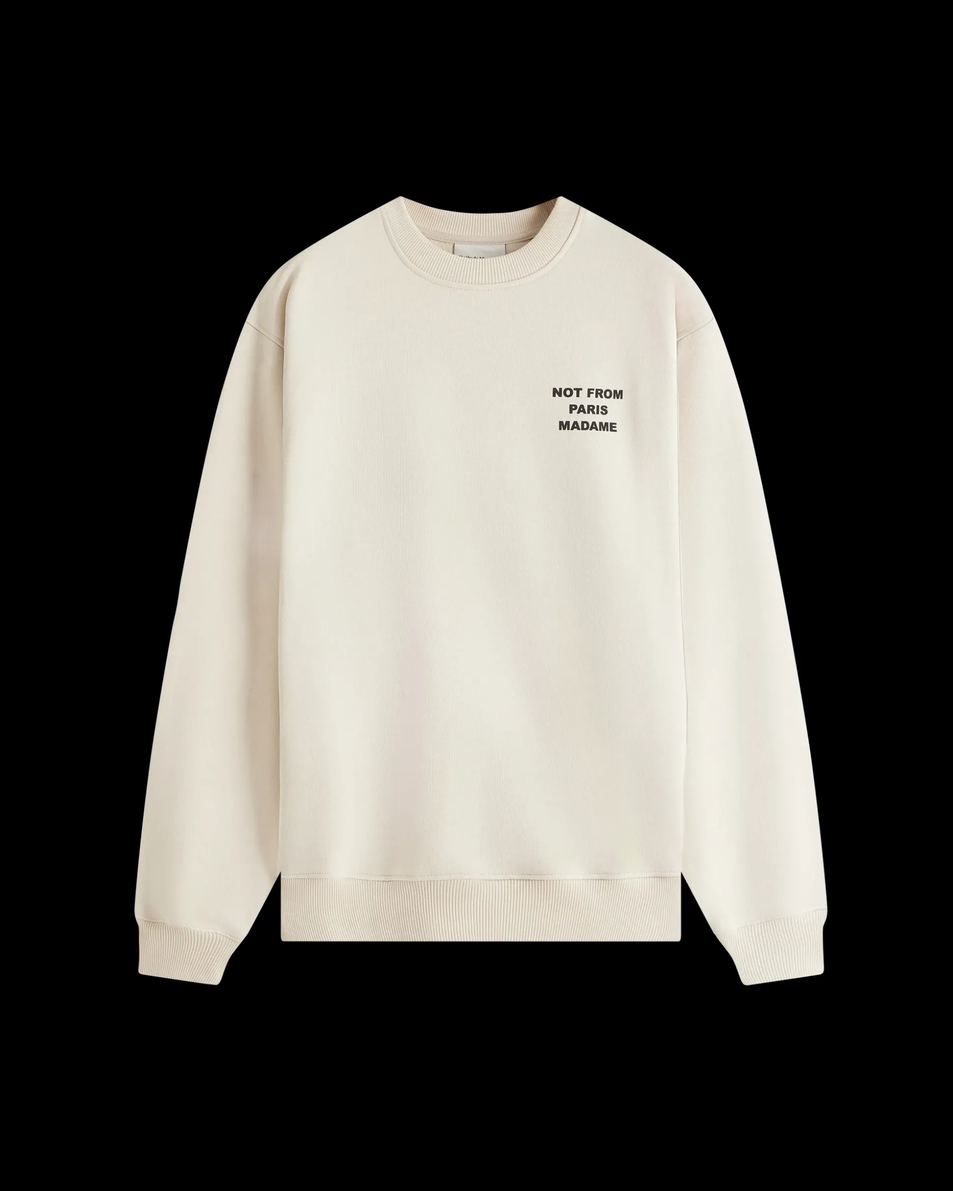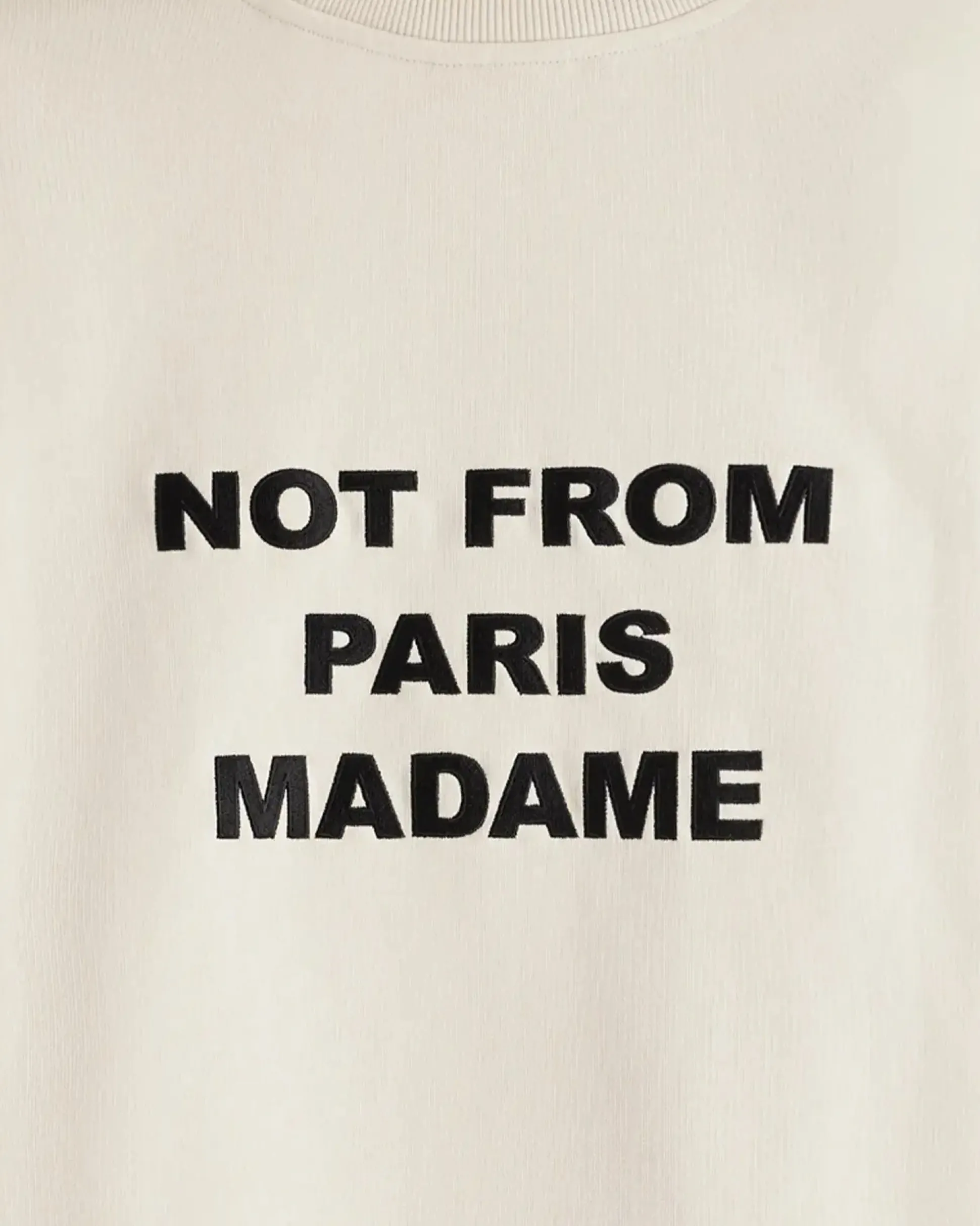This beige 100% cotton French terry sweatshirt with ribbed hem and cuffs is printed with the ‘Not from Paris Madame’ slogan on the front and embroidered on the back.• Slogan printed at front and embroidered on the back• French terry fabric• Round collar• Ribbed hem and cuffs• 100% cotton – 430 GSMMade in Portugal