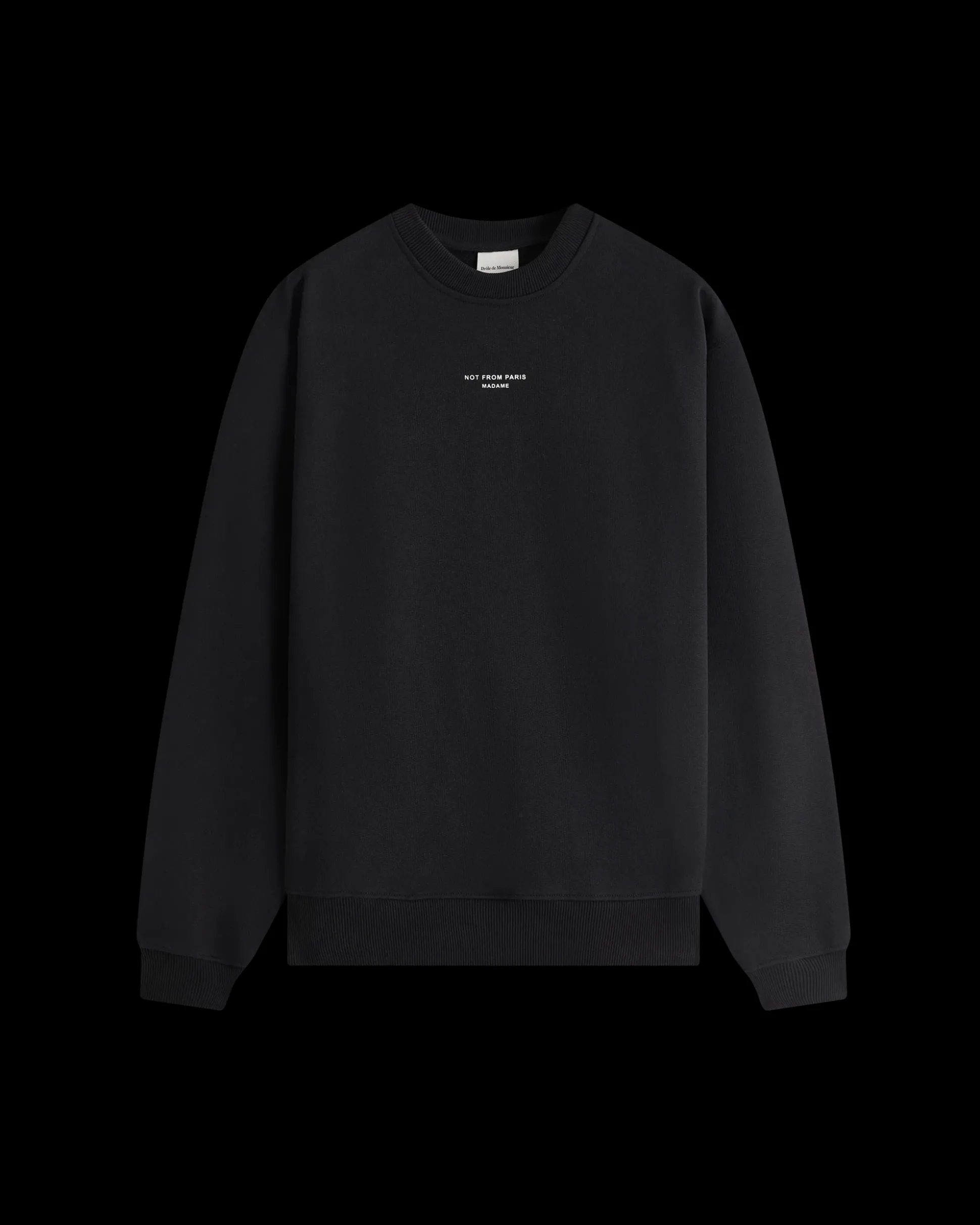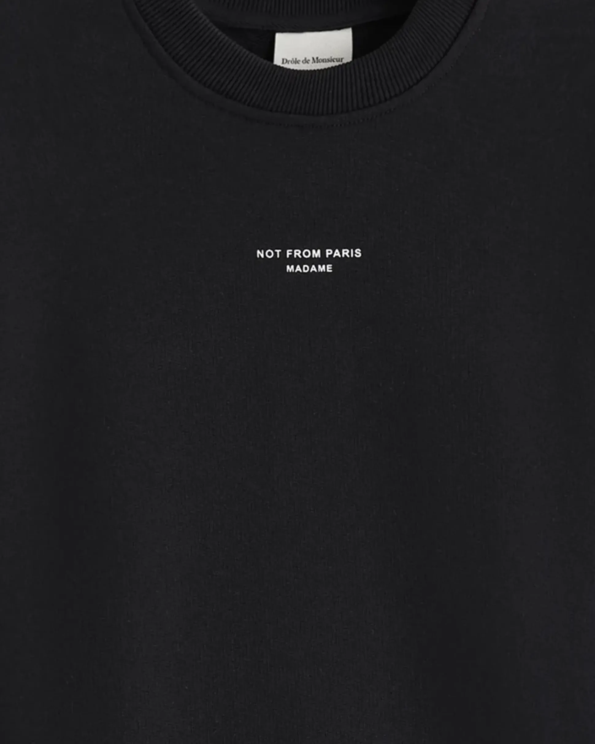 This black 100% cotton French terry sweatshirt with ribbed hem and cuffs is printed with the ‘Not from Paris Madame’ slogan on the front.• Front slogan print• French terry fabric• Round collar• Ribbed hem and cuffs• 100% cotton – 430 GSMMade in Portugal