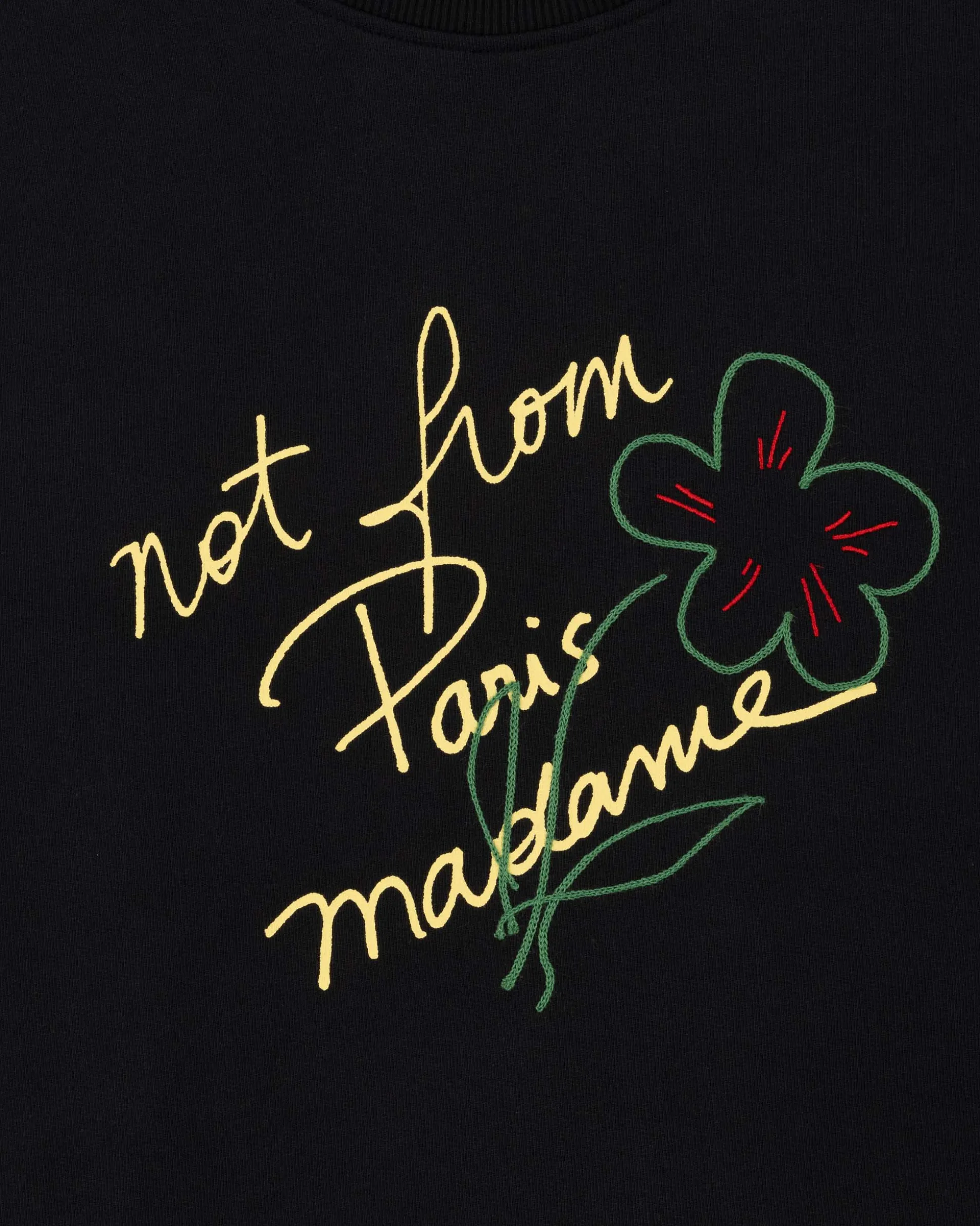 This black 100% cotton French terry sweatshirt, with a round neck and ribbed hem, collar and cuffs, features a ‘Not From Paris Madame’ print and embroidery on the front.