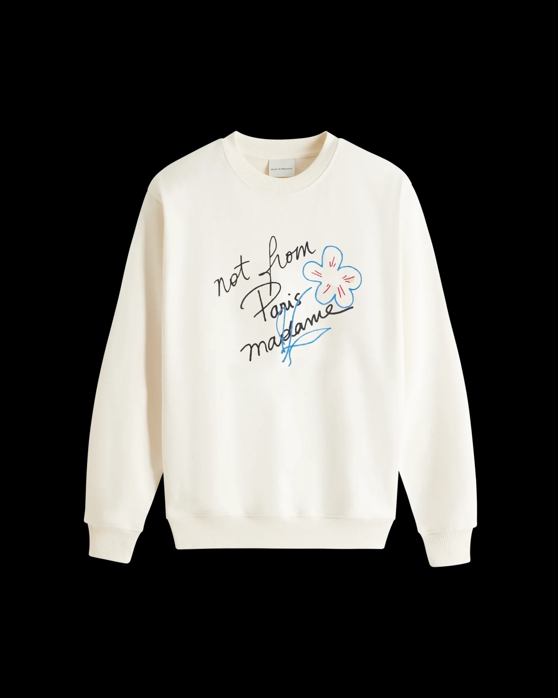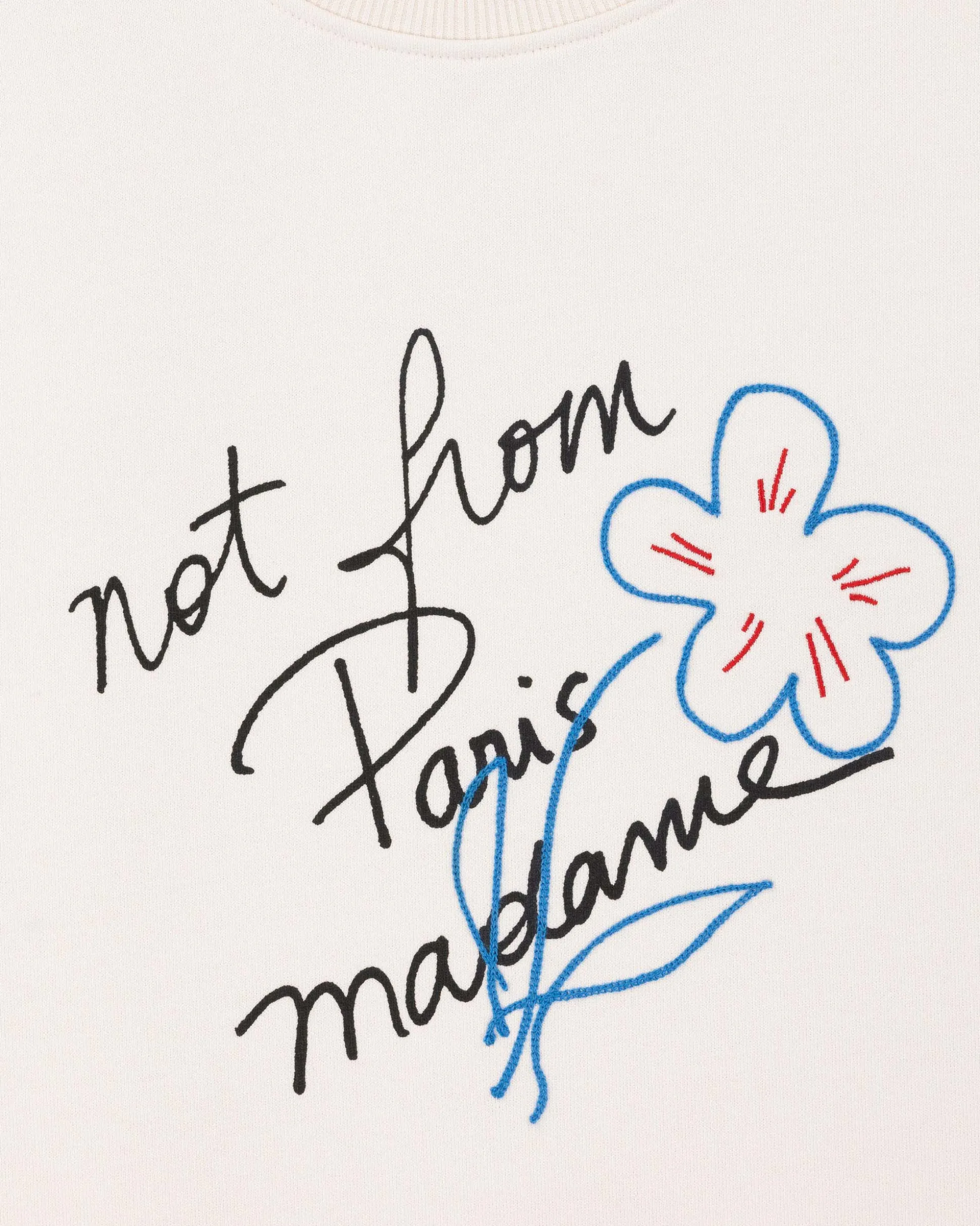 This cream 100% cotton French terry sweatshirt, with a round neck and ribbed hem, collar and cuffs, features a ‘Not From Paris Madame’ print and embroidery on the front.