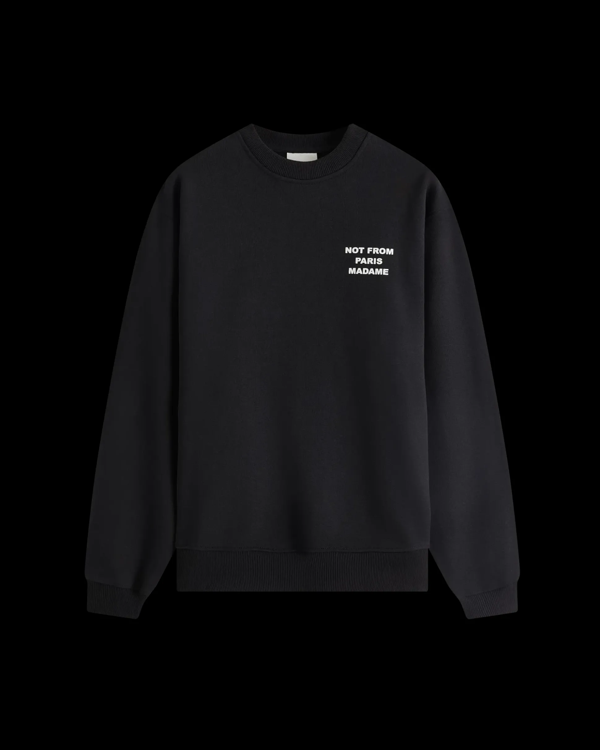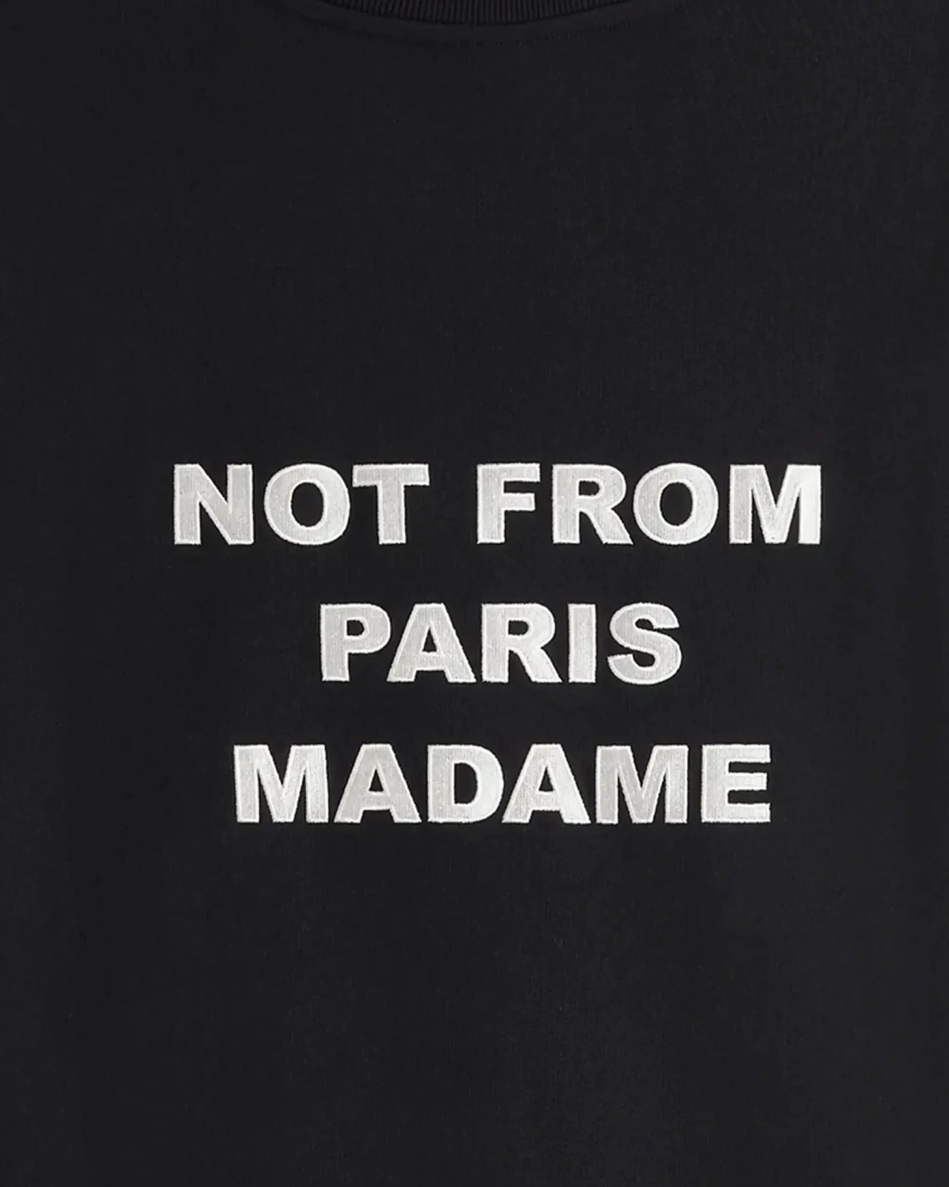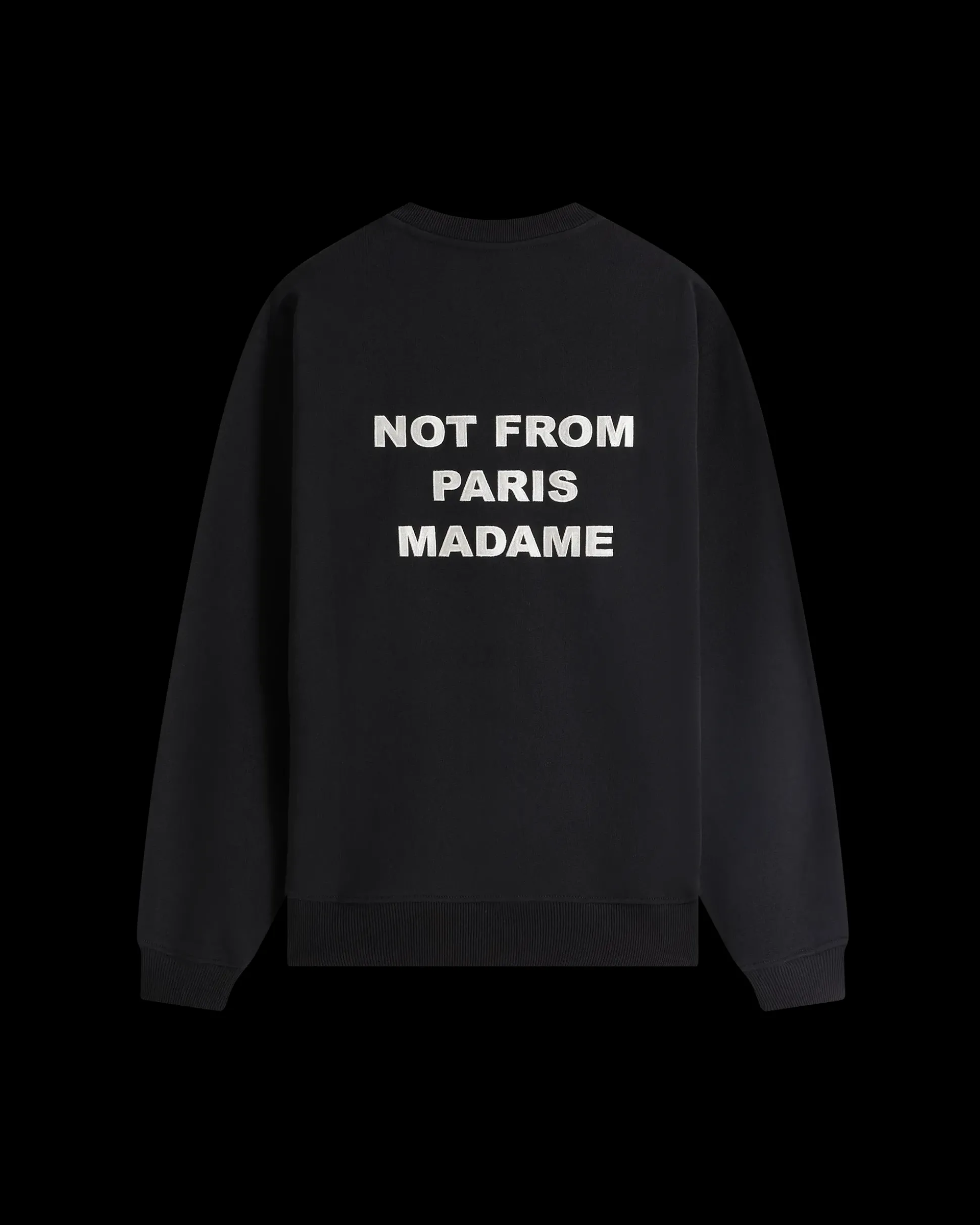 This black 100% cotton French terry sweatshirt with ribbed hem and cuffs is printed with the ‘Not from Paris Madame’ slogan on the front and embroidered on the back.• Slogan printed at front and embroidered on the back• French terry fabric• Round collar• Ribbed hem and cuffs• 100% cotton – 430 GSMMade in Portugal