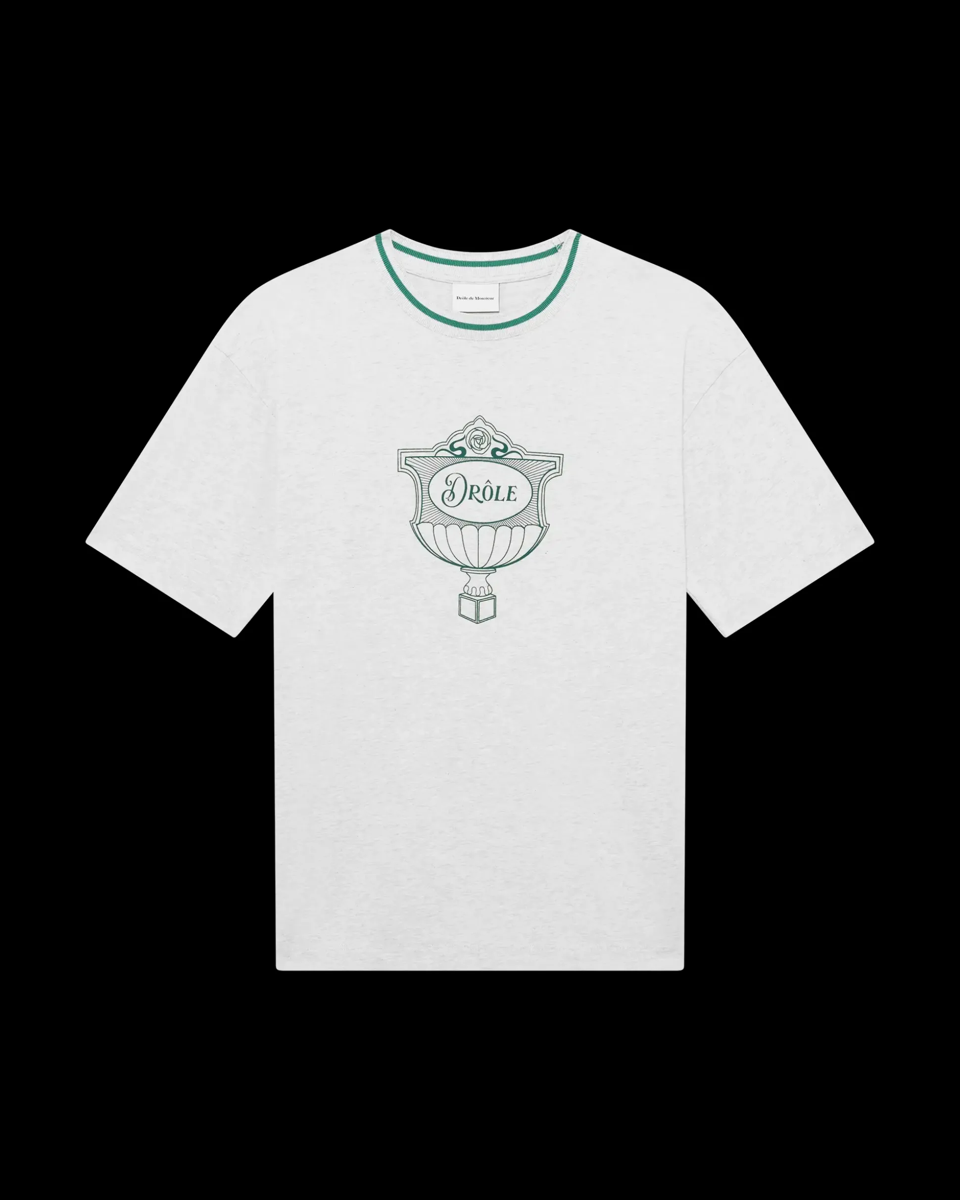 This grey 100% cotton jersey t-shirt with a ribbed neckline is printed with the Drôle Cup motif on the front and back.• Jersey fabric • Drôle Cup print on the front and back• Ribbed neckline• 100% cotton – 230 GSMColor: GreyMade in Portugal