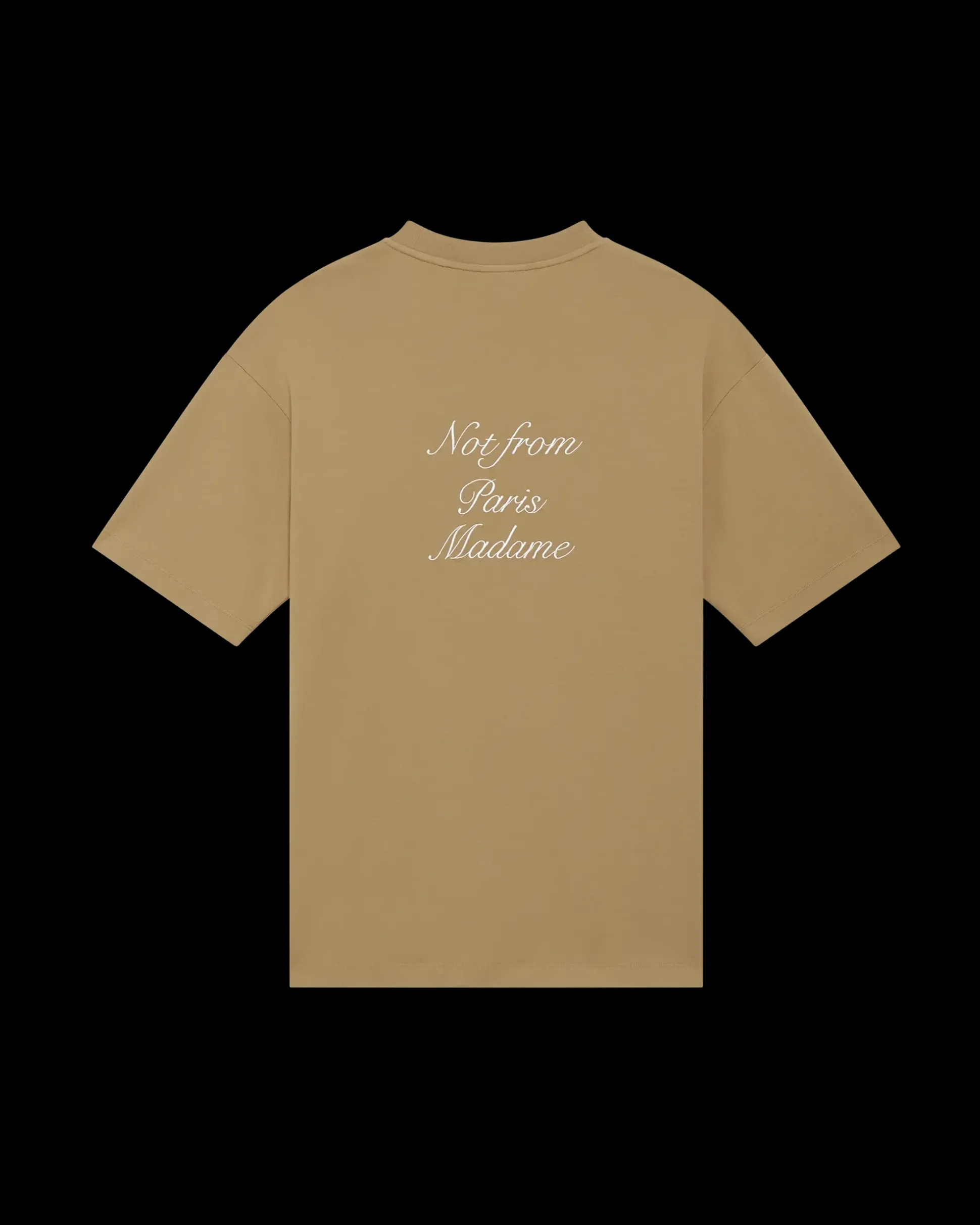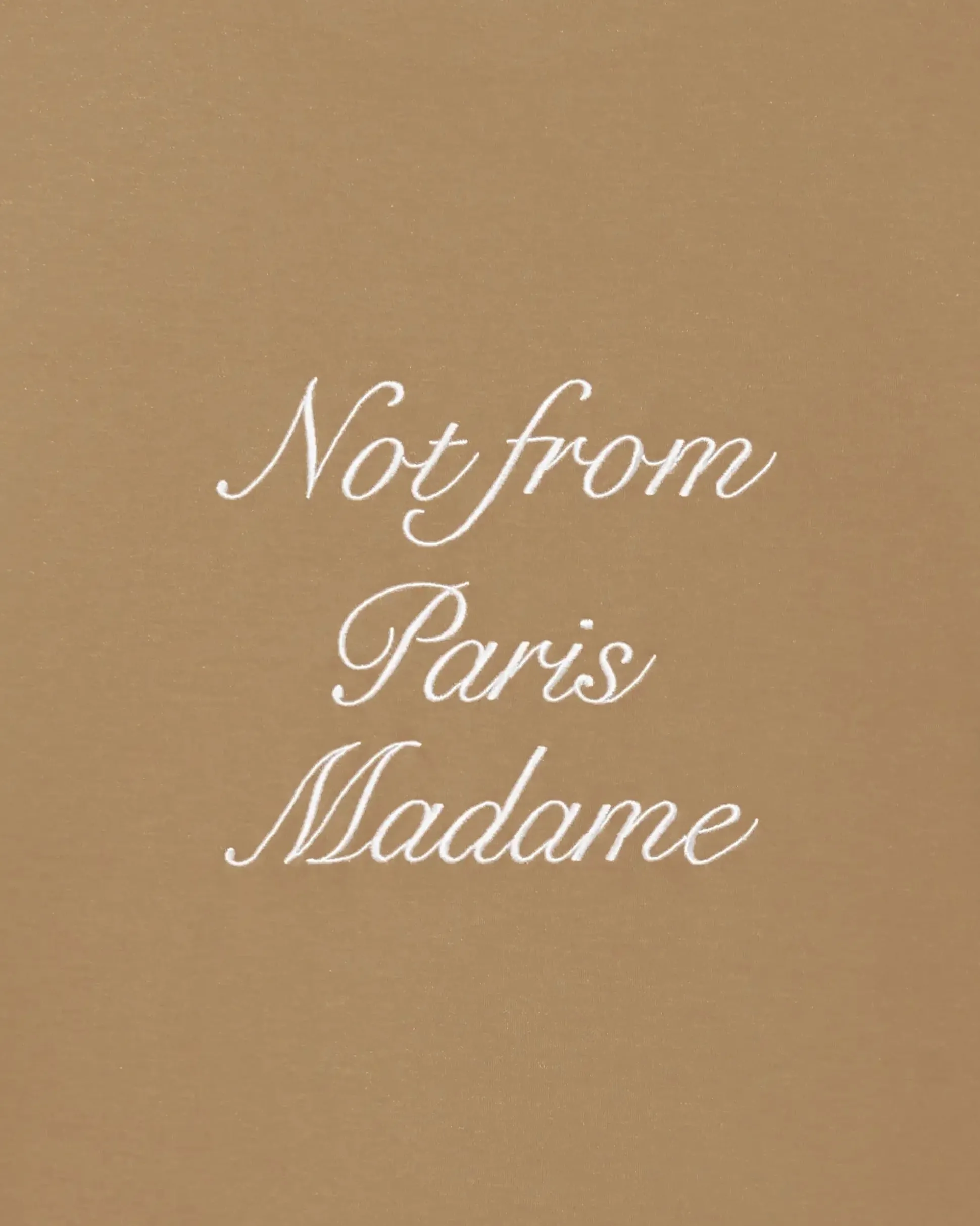 This ice brown 100% cotton interlock t-shirt with a ribbed neckline features the ‘Not from Paris Madame’ slogan printed calligraphy-style on the front and back.