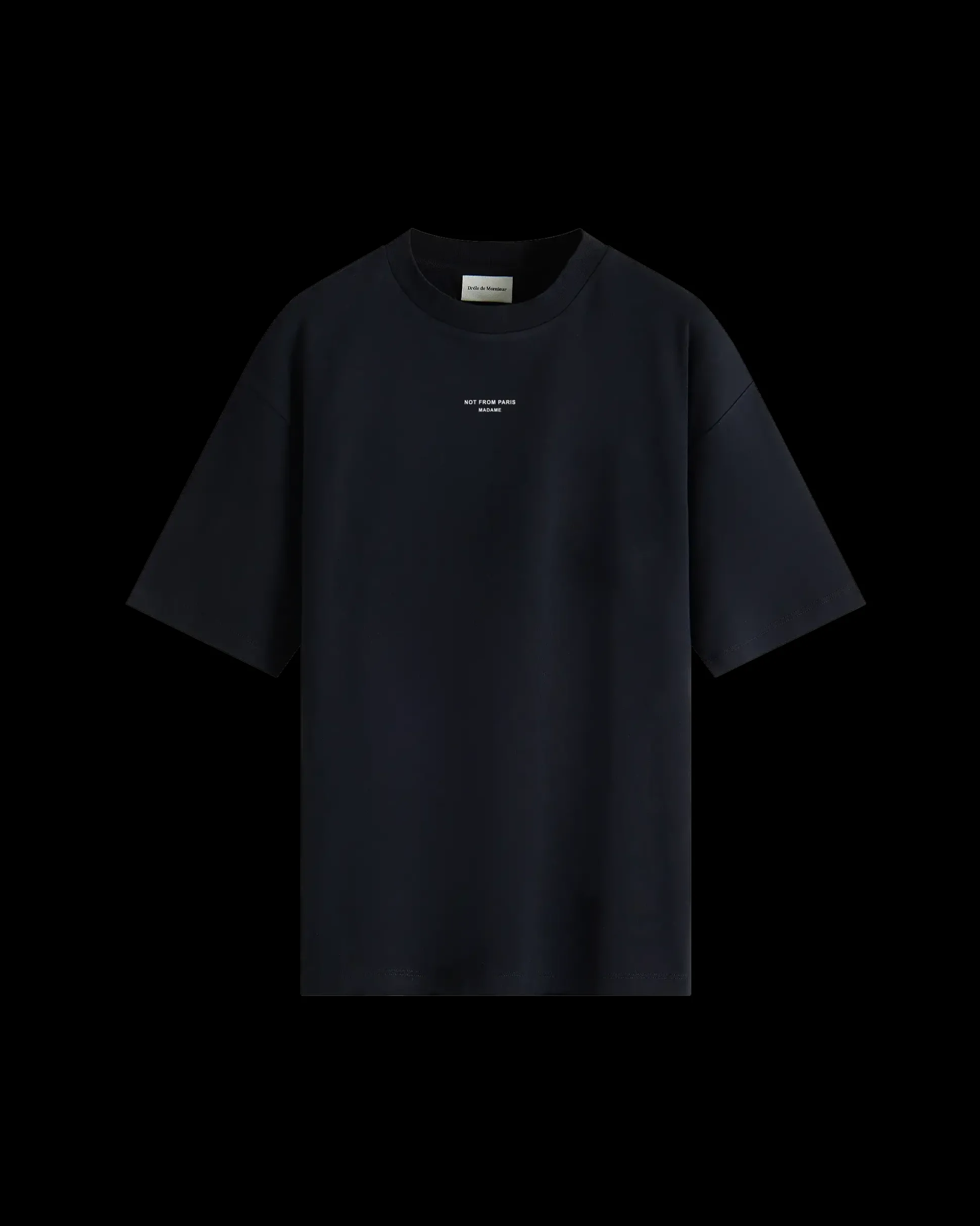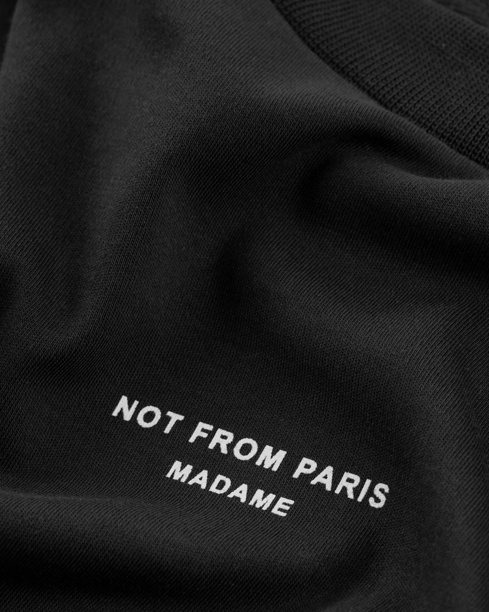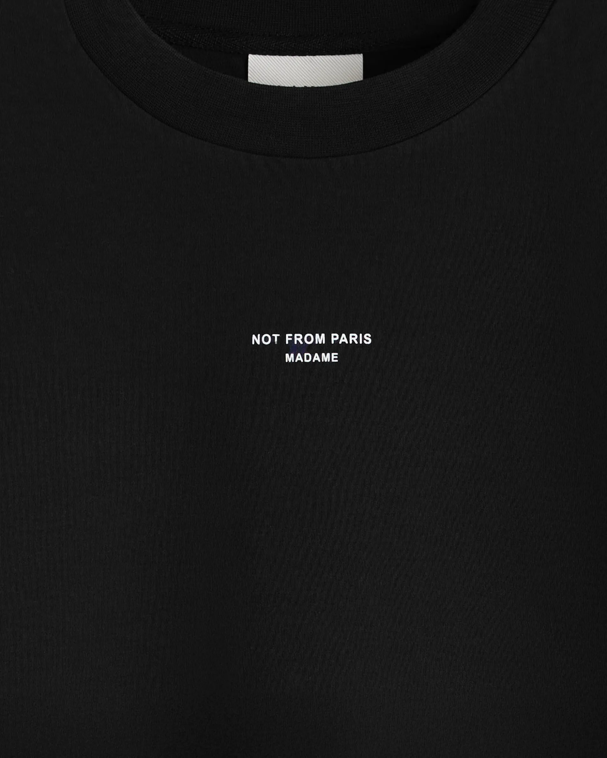 This black 100% cotton interlock t-shirt with a ribbed neckline is printed with the ‘Not from Paris Madame’ slogan.• Front slogan print• Interlock fabric• Ribbed neckline• 100% cotton – 240 GSMMade in Portugal