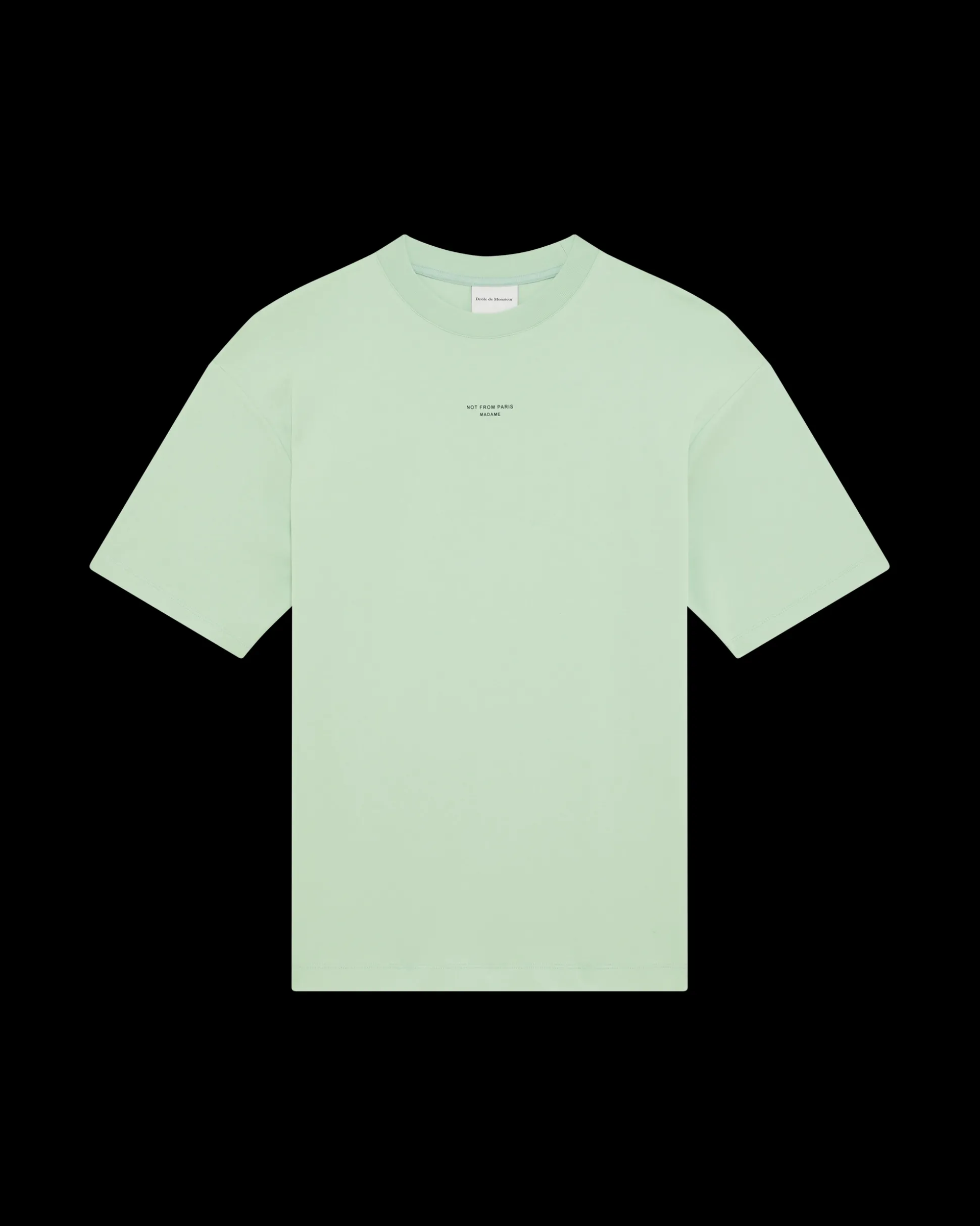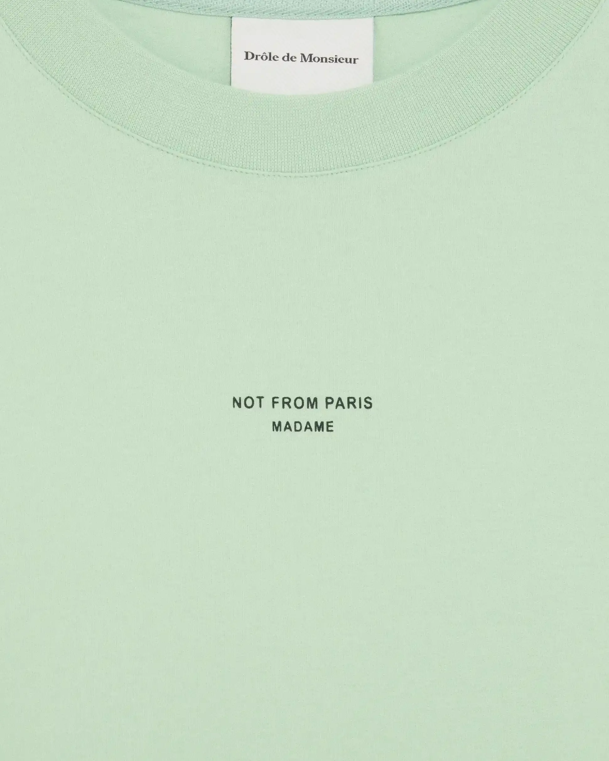 This light green 100% cotton interlock t-shirt with a ribbed neckline is printed with the ‘Not from Paris Madame’ slogan.• Front slogan print• Interlock fabric• Ribbed neckline• 100% cotton – 240 GSMColor: Light greenMade in Portugal