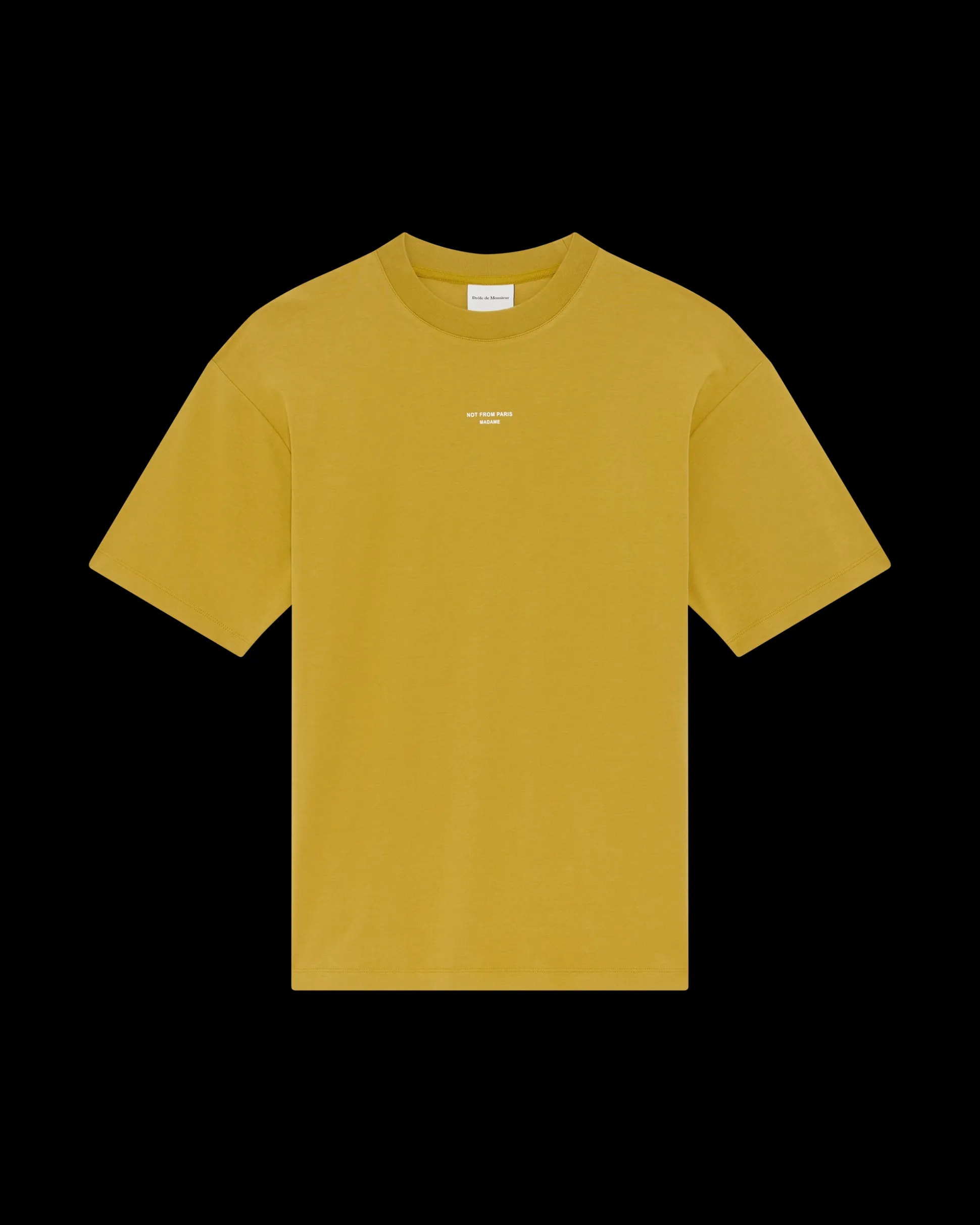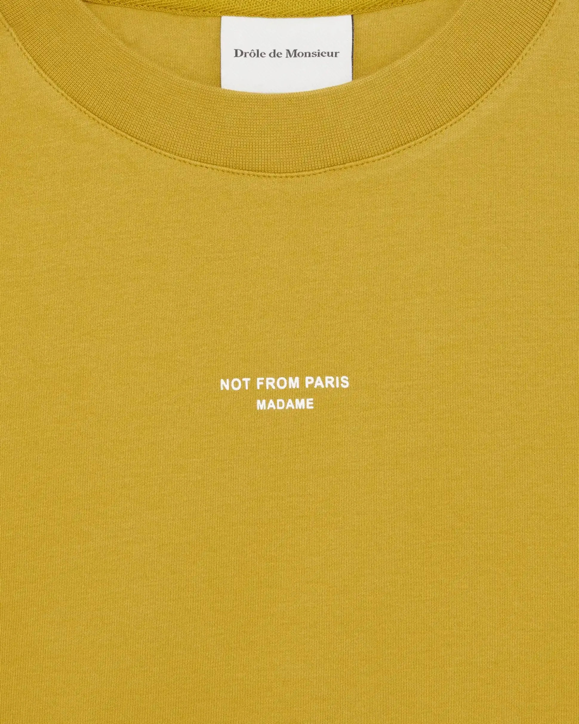 This mustard 100% cotton interlock t-shirt with a ribbed neckline is printed with the ‘Not from Paris Madame’ slogan.• Front slogan print• Interlock fabric• Ribbed neckline• 100% cotton – 240 GSMColor: MustardMade in Portugal